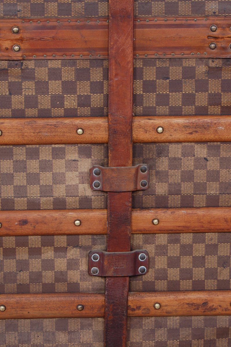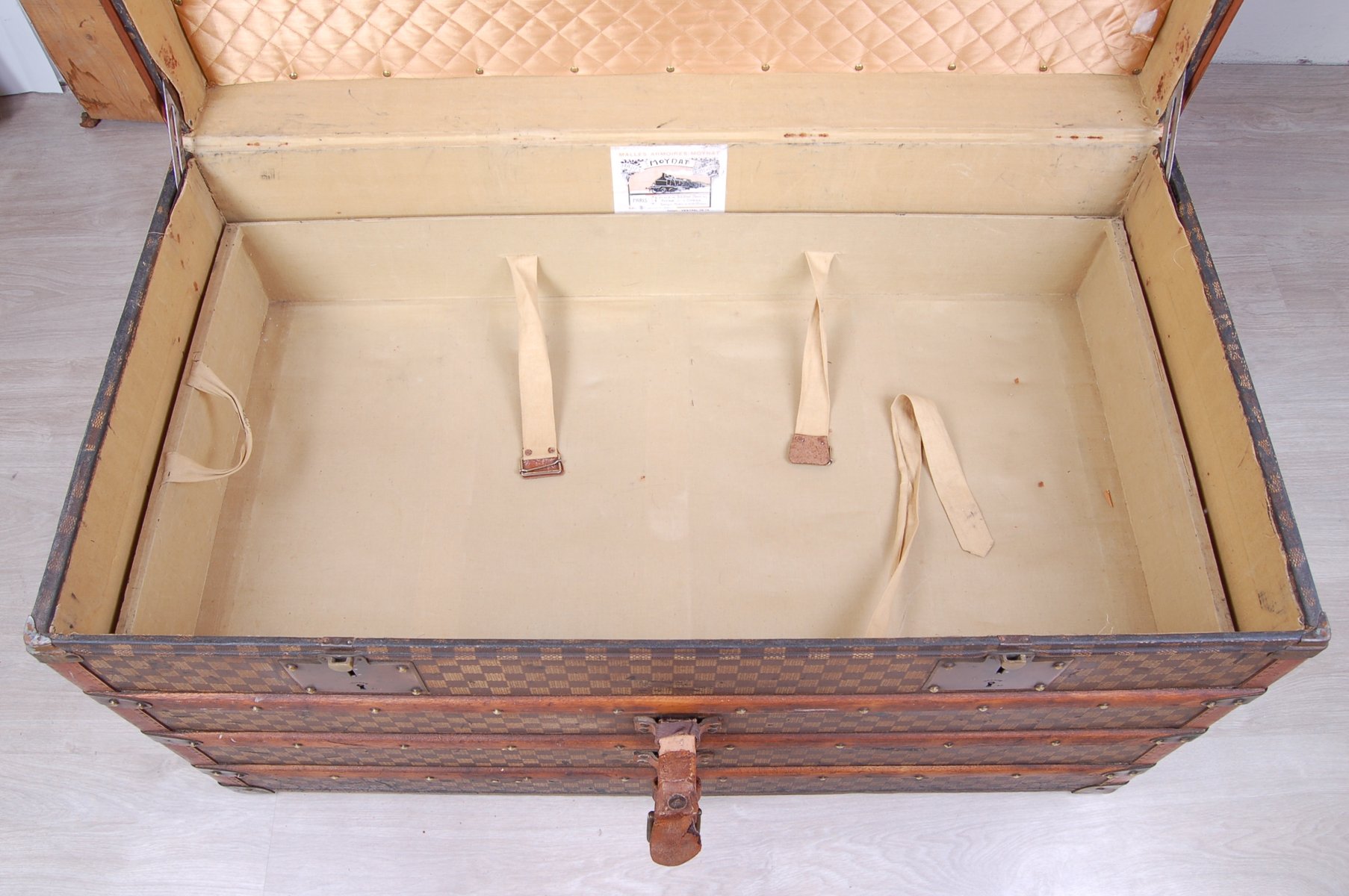 Moynat’s workshop was one of the first of its kind for leather work and developed many technical innovations; for instance, a patent for gutta-percha waterproofing in 1854, which used the sap of the gutta-percha tree. The company became widely lauded for its sturdy and waterproof trunks lined with silk or velvet intended for use in all modes of transport (steamship, railway, and eventually automobile travel).