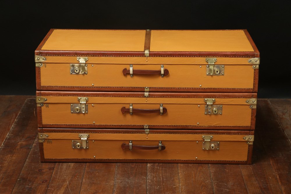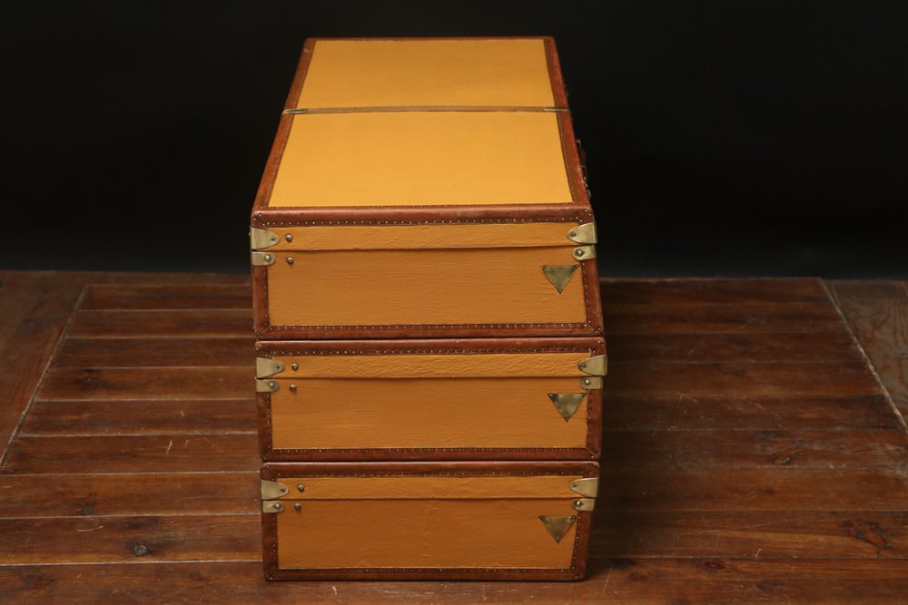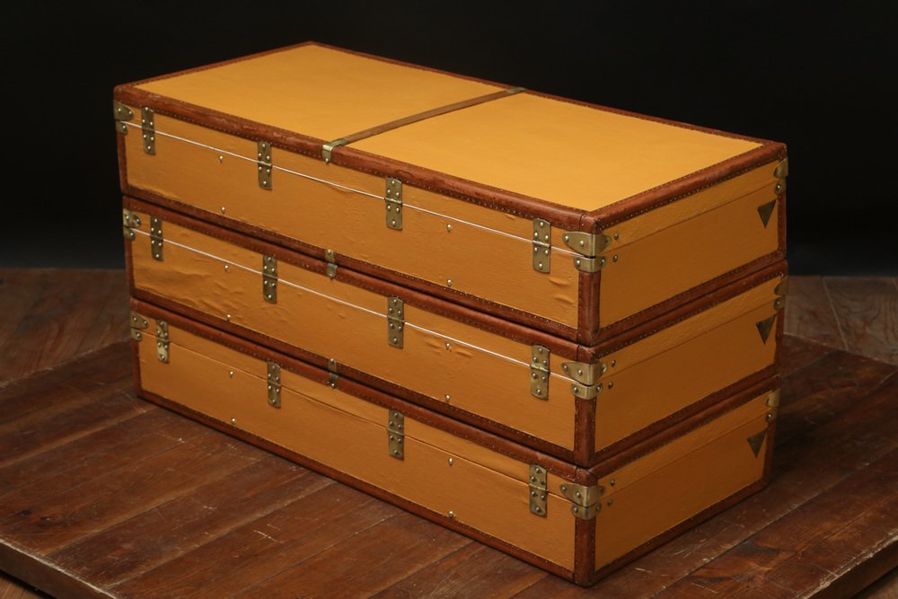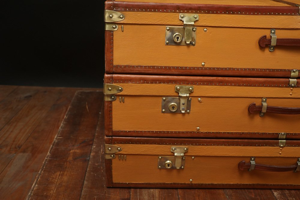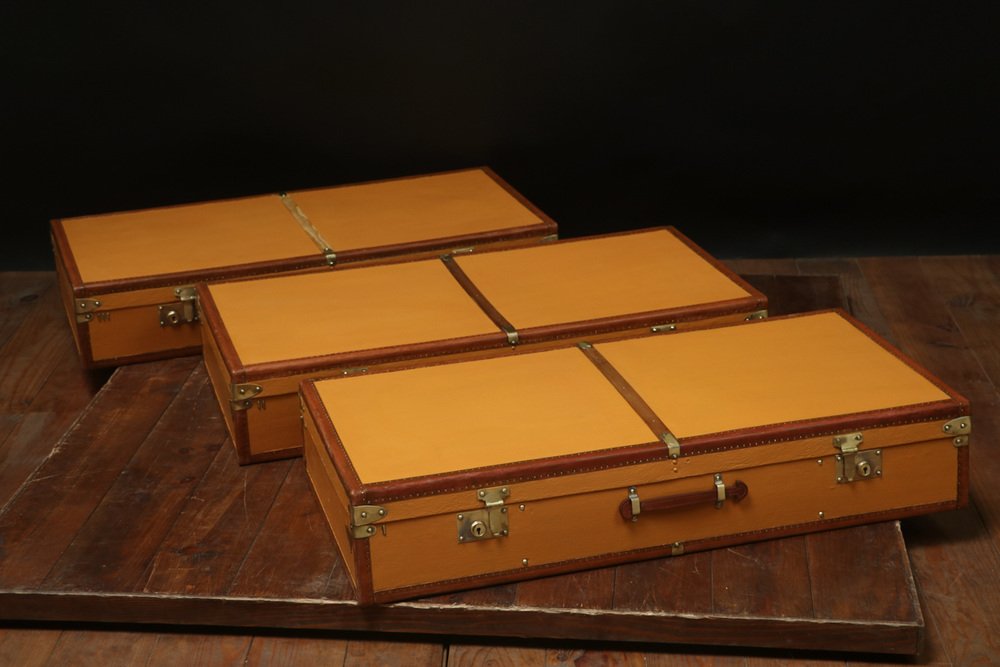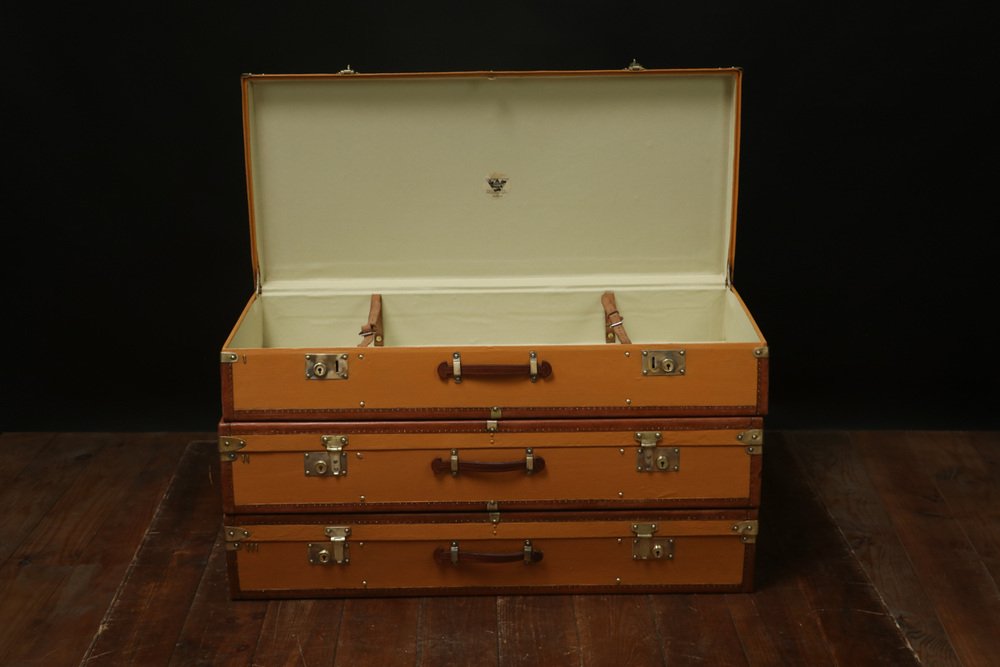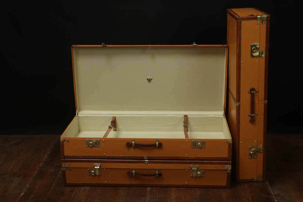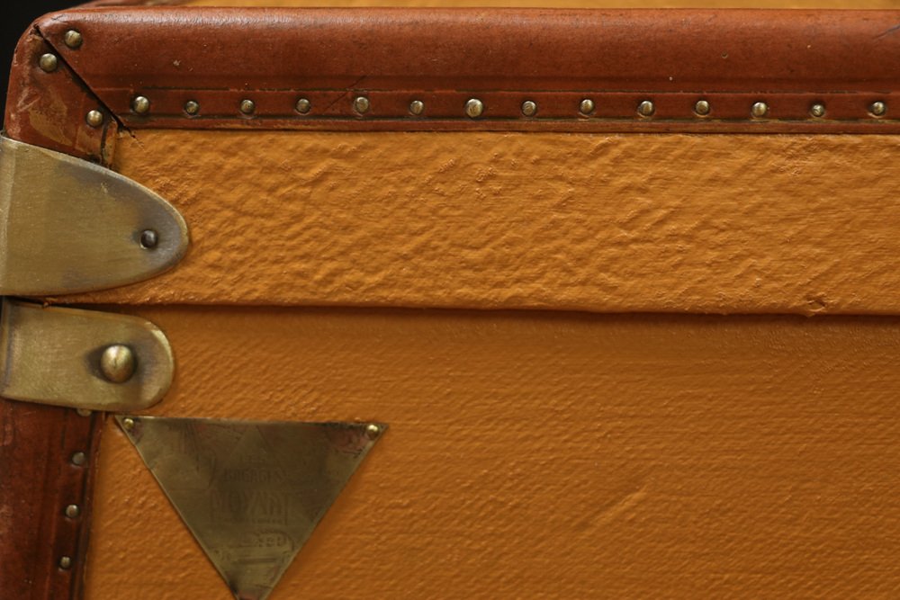Moynat’s workshop was one of the first of its kind for leather work and developed many technical innovations; for instance, a patent for gutta-percha waterproofing in 1854, which used the sap of the gutta-percha tree. The company became widely lauded for its sturdy and waterproof trunks lined with silk or velvet intended for use in all modes of transport (steamship, railway, and eventually automobile travel).