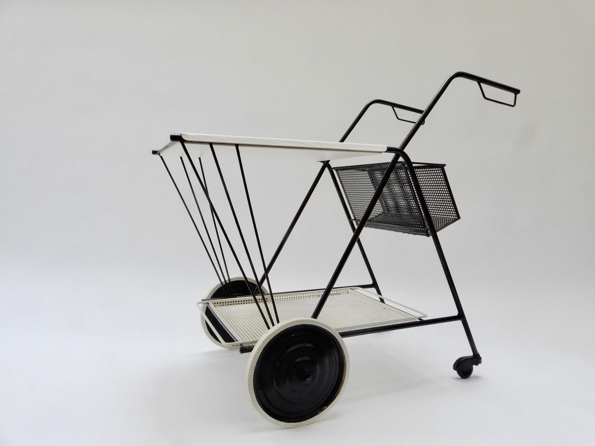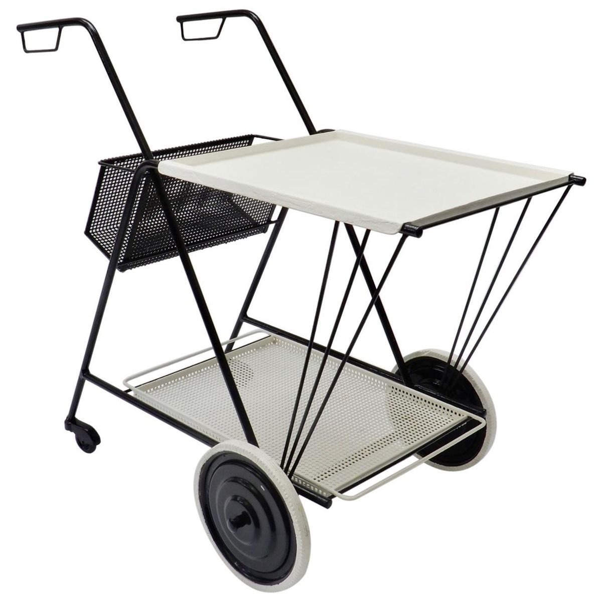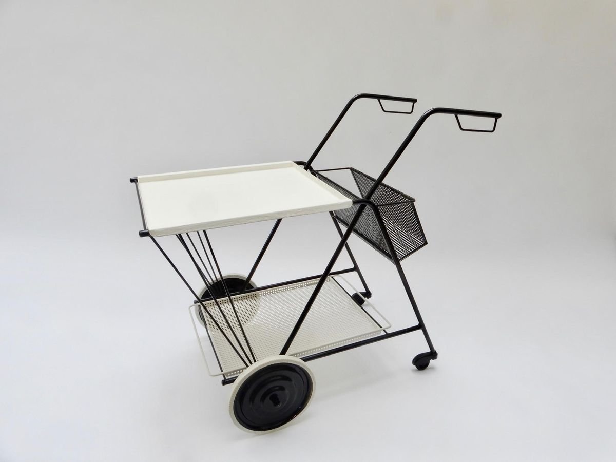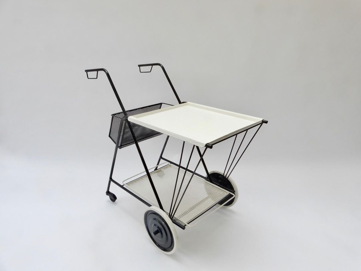 Black and White Perforated Metal Bar Cart in the style of Mathieu Mathegot, 1950s
