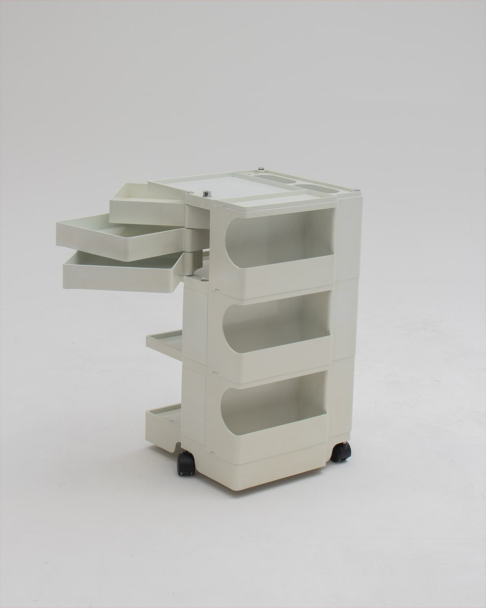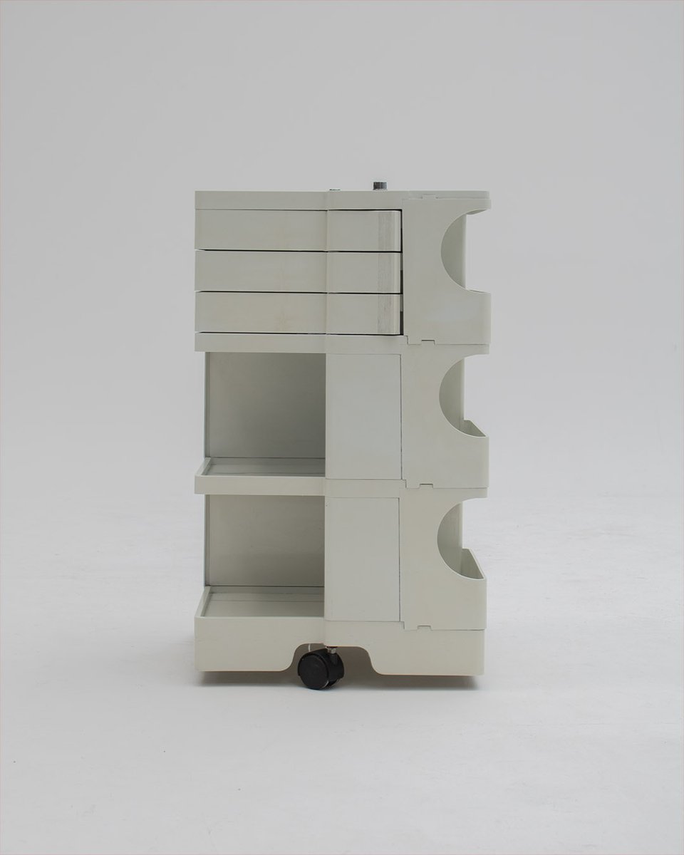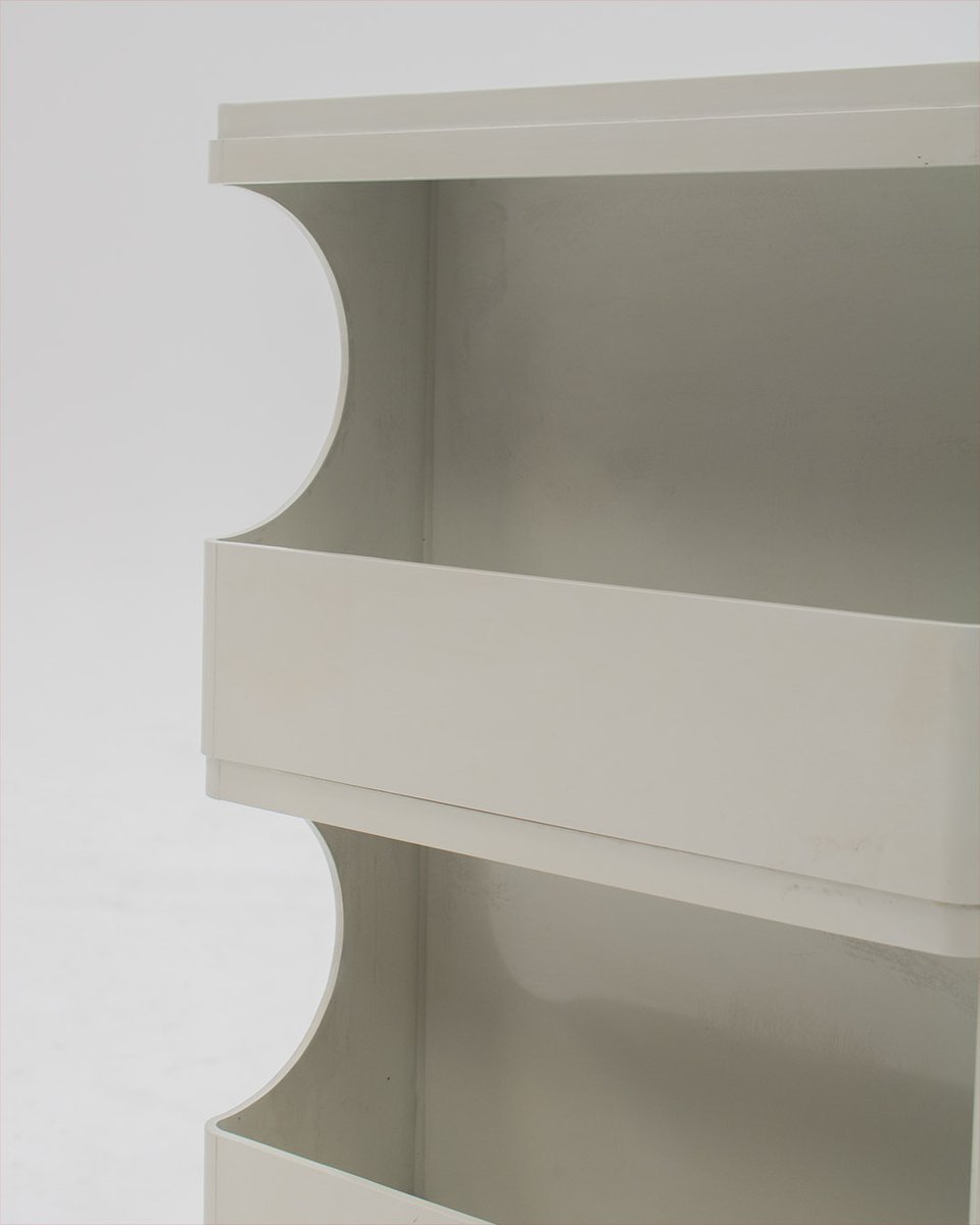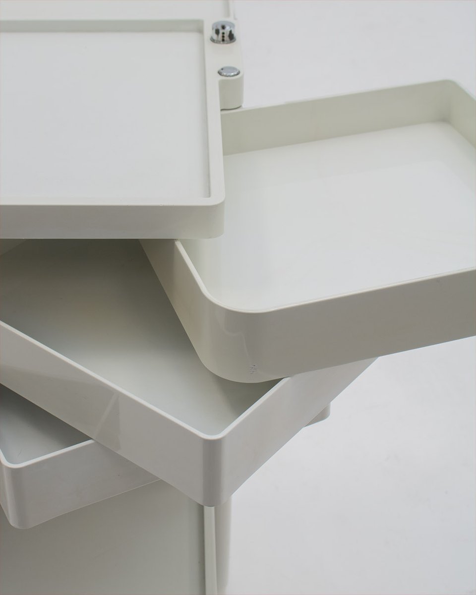 Colombo’s design career was cut tragically short in 1971 when he died of heart failure at age 41. However, he was remarkably prolific during his near decade as a designer. Notable projects include some of the most iconic designs of the 1960s, such as his 1963 Elda Armchair, made completely of fiberglass; the 1964 Ragno outdoor light, which doubled as a seat; the stackable Universale chair (1965/67), which came in varying heights and was created completely from polypropylene; his 1967 modular furniture series known as the Additional Living System, which was composed of different-size curved pieces that could be pinned together in various configurations to form chairs, sofas, or entire living areas, and which ultimately included the famous 1969 Tubo lounge chair; and the Optic alarm clock and Bobby trolley (both 1970).