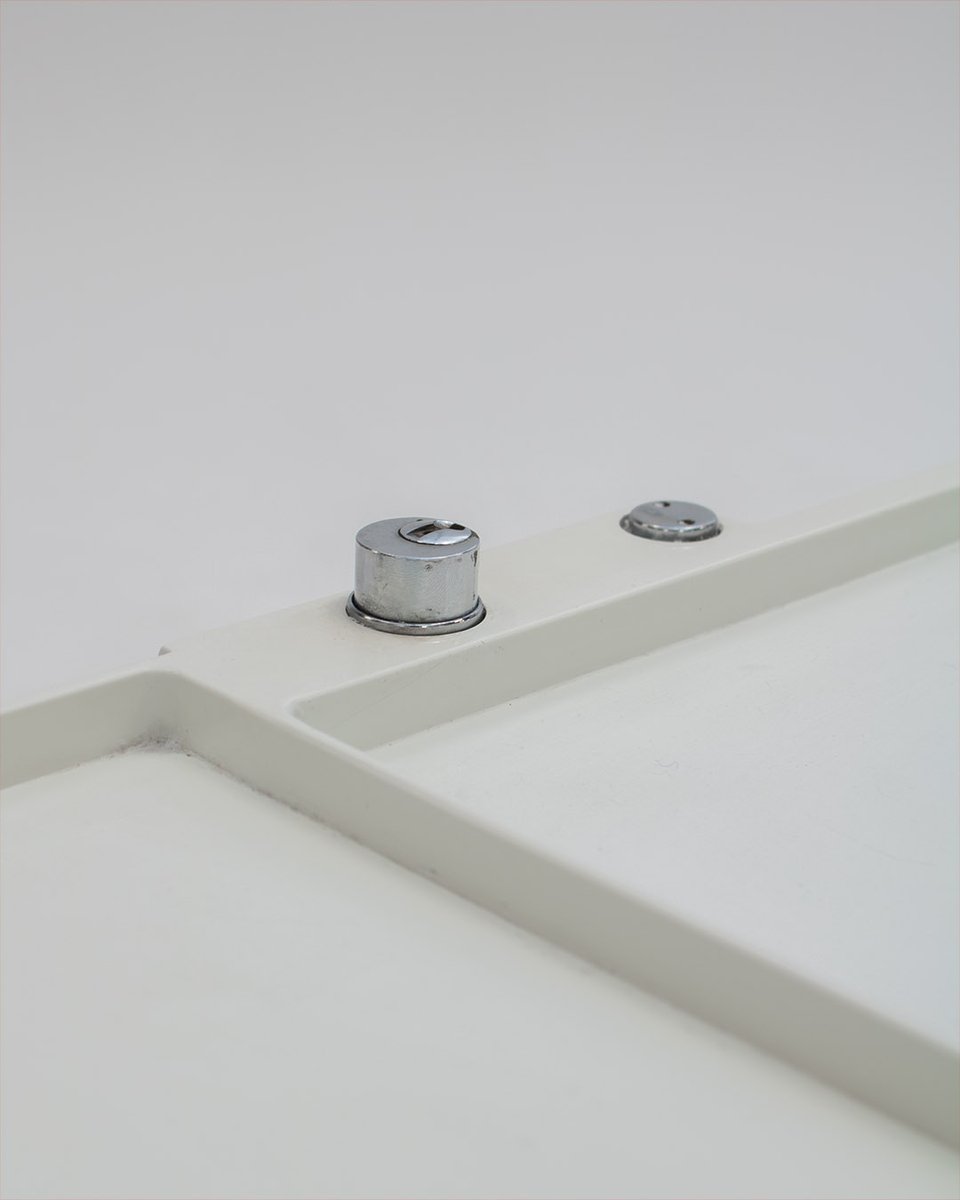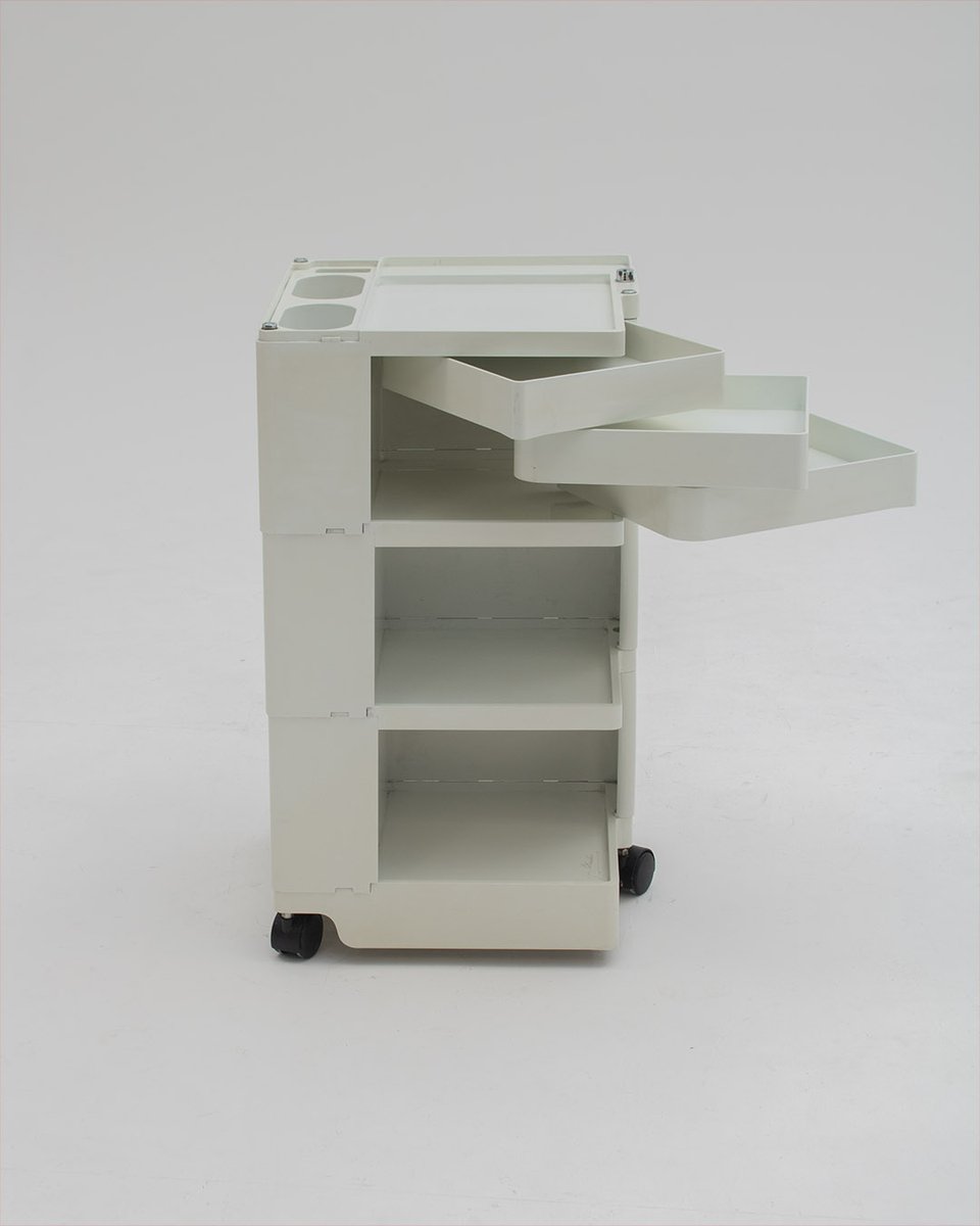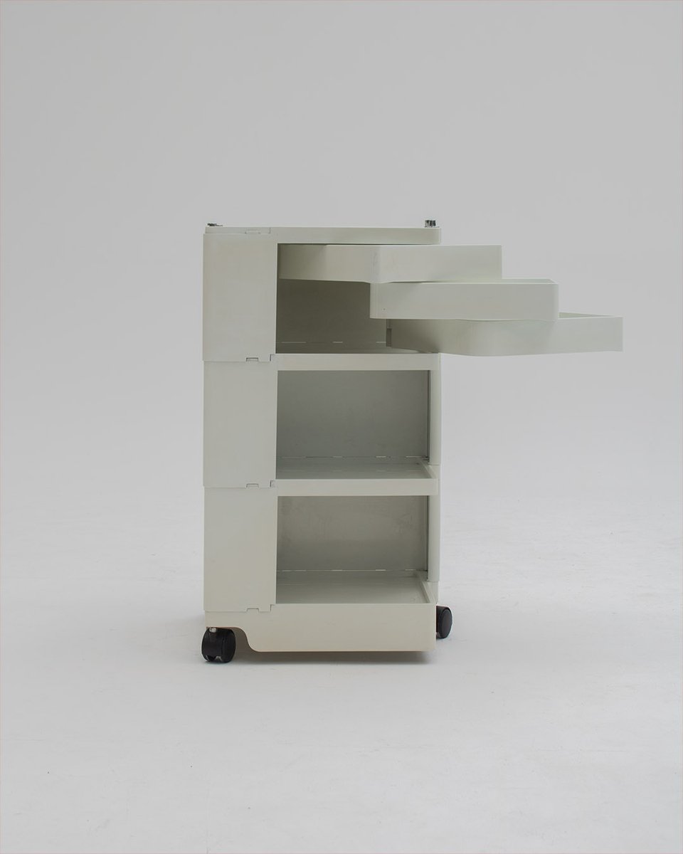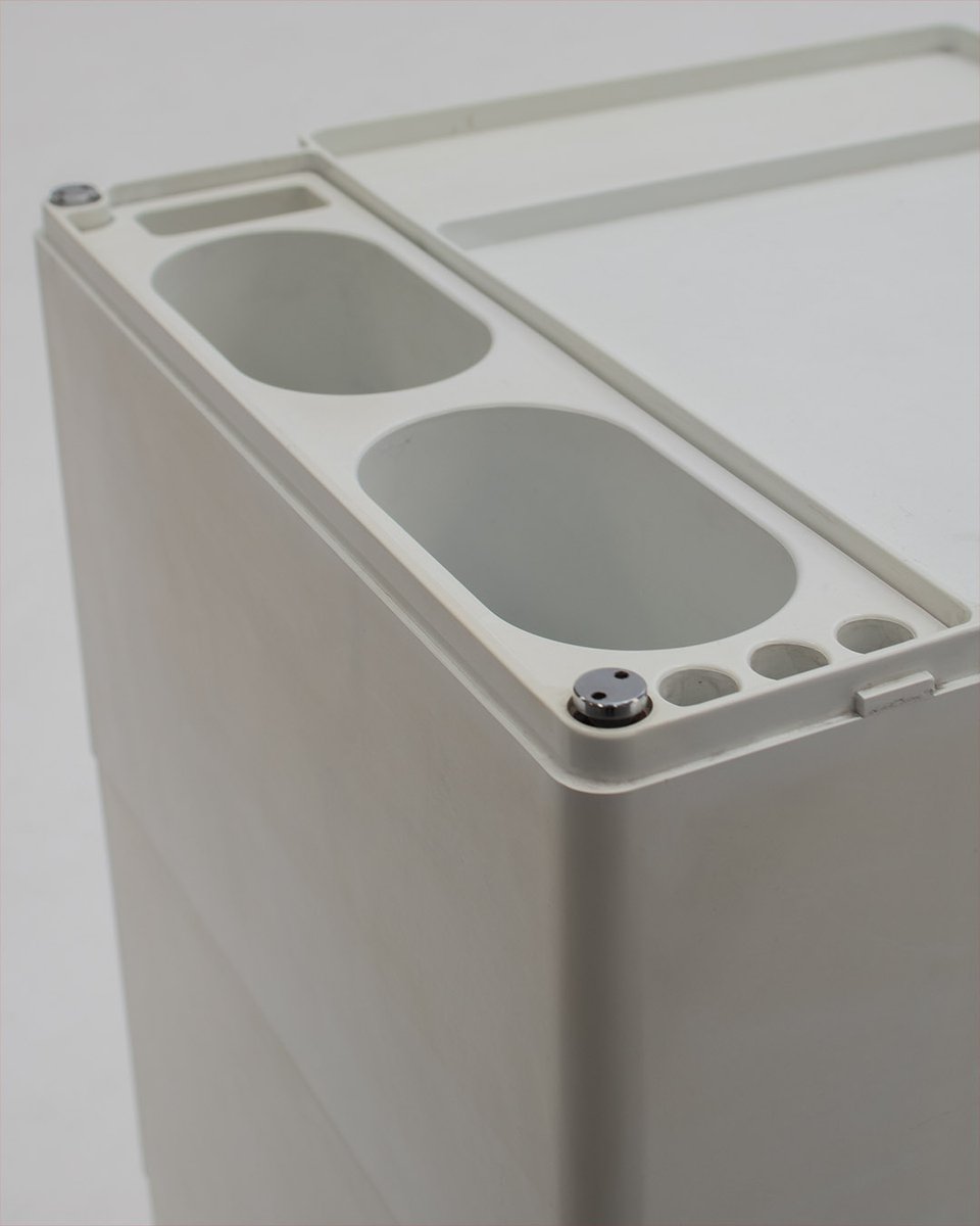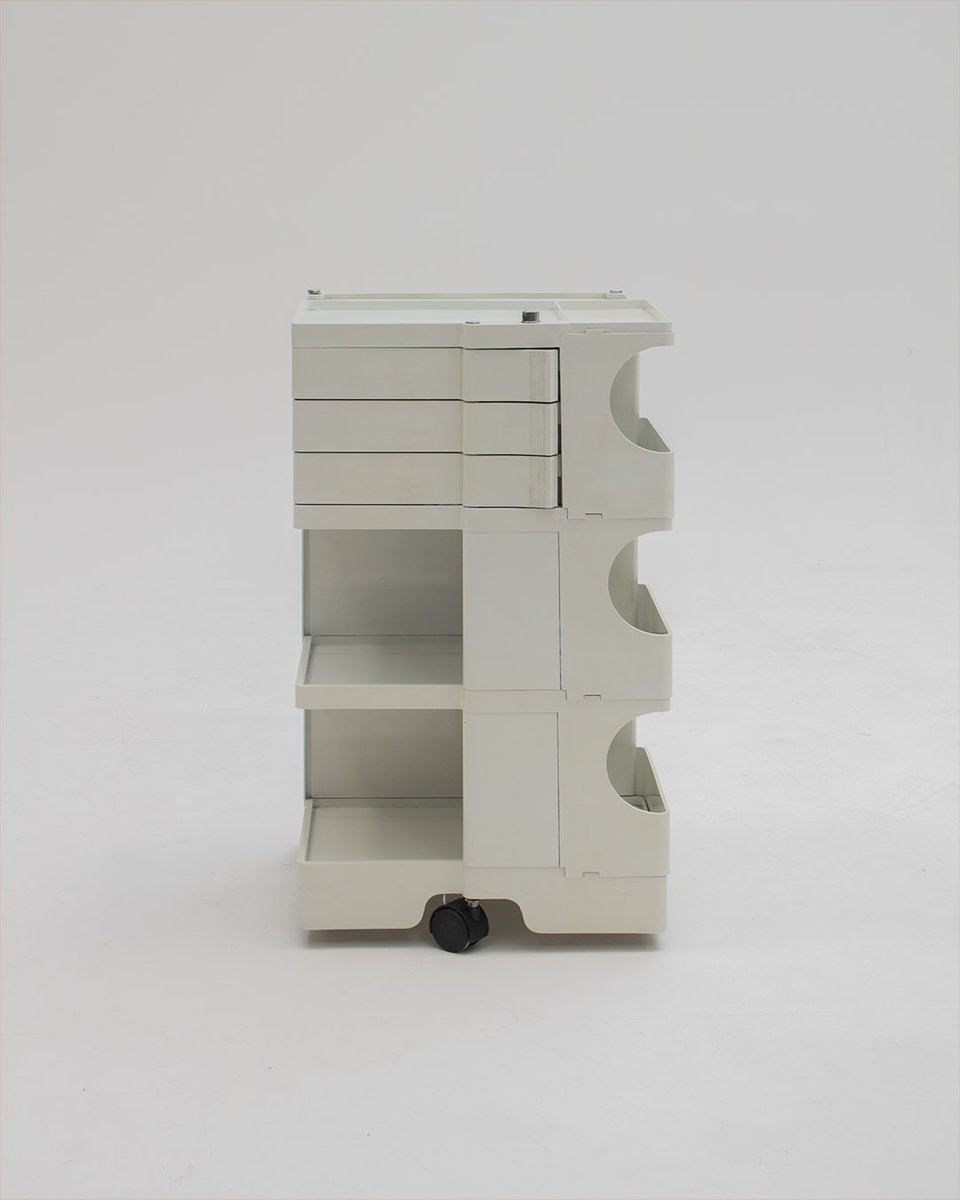 Colombo’s design career was cut tragically short in 1971 when he died of heart failure at age 41. However, he was remarkably prolific during his near decade as a designer. Notable projects include some of the most iconic designs of the 1960s, such as his 1963 Elda Armchair, made completely of fiberglass; the 1964 Ragno outdoor light, which doubled as a seat; the stackable Universale chair (1965/67), which came in varying heights and was created completely from polypropylene; his 1967 modular furniture series known as the Additional Living System, which was composed of different-size curved pieces that could be pinned together in various configurations to form chairs, sofas, or entire living areas, and which ultimately included the famous 1969 Tubo lounge chair; and the Optic alarm clock and Bobby trolley (both 1970).