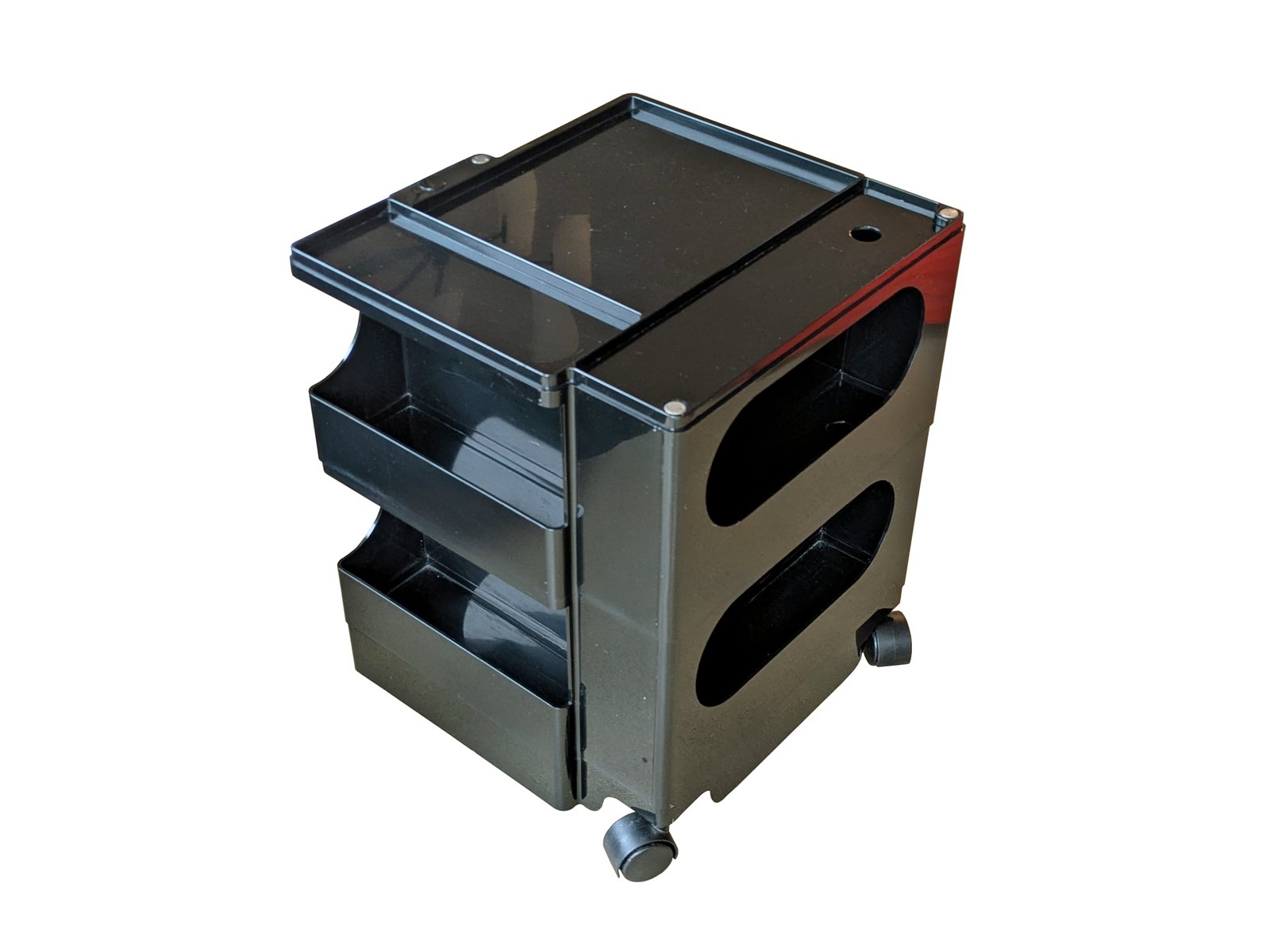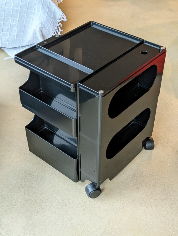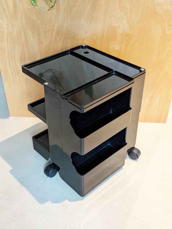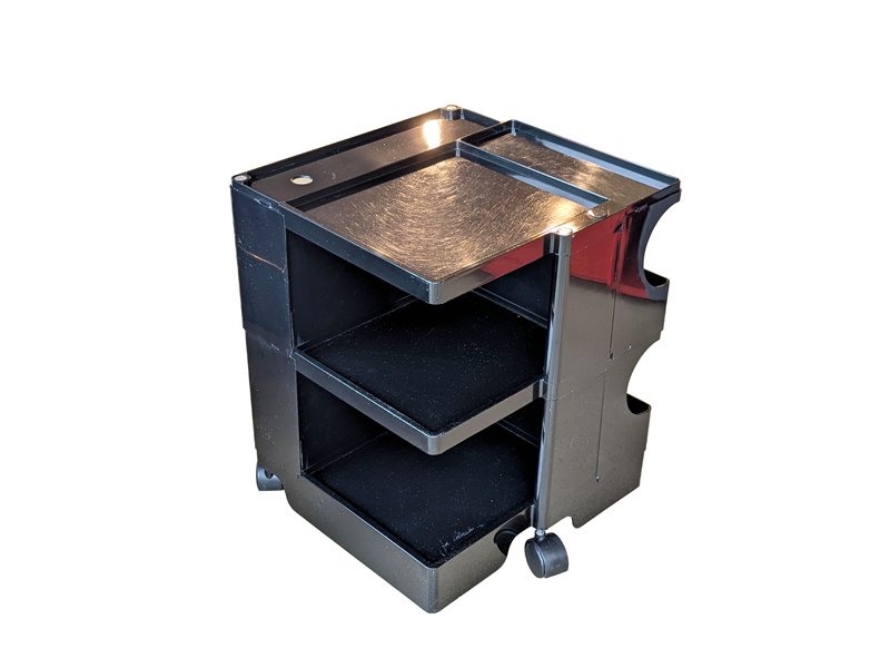 Colombo’s design career was cut tragically short in 1971 when he died of heart failure at age 41. However, he was remarkably prolific during his near decade as a designer. Notable projects include some of the most iconic designs of the 1960s, such as his 1963 Elda Armchair, made completely of fiberglass; the 1964 Ragno outdoor light, which doubled as a seat; the stackable Universale chair (1965/67), which came in varying heights and was created completely from polypropylene; his 1967 modular furniture series known as the Additional Living System, which was composed of different-size curved pieces that could be pinned together in various configurations to form chairs, sofas, or entire living areas, and which ultimately included the famous 1969 Tubo lounge chair; and the Optic alarm clock and Bobby trolley (both 1970).