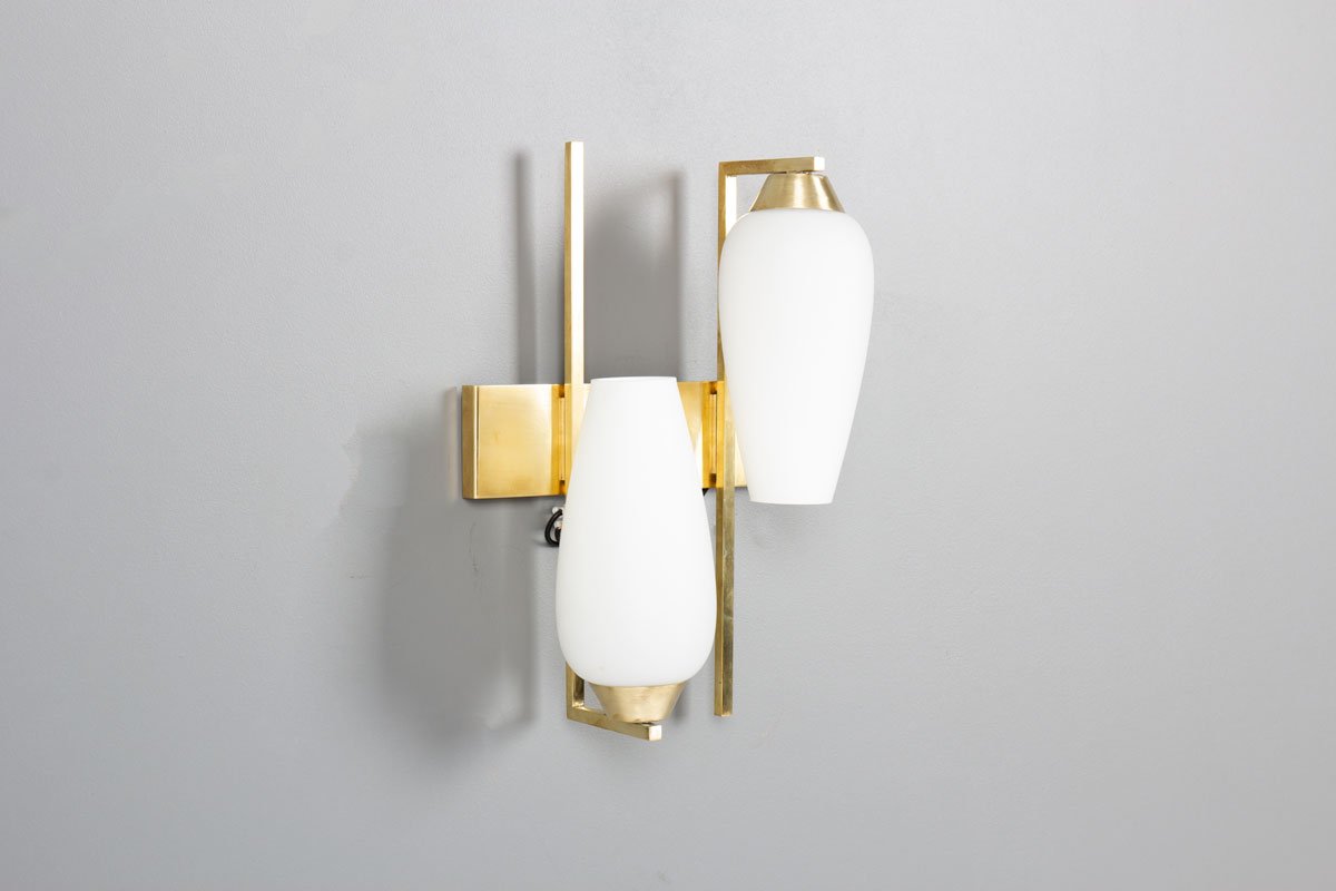 Brass and Opaline Glass Wall Sconces, France, 1950s, Set of 2