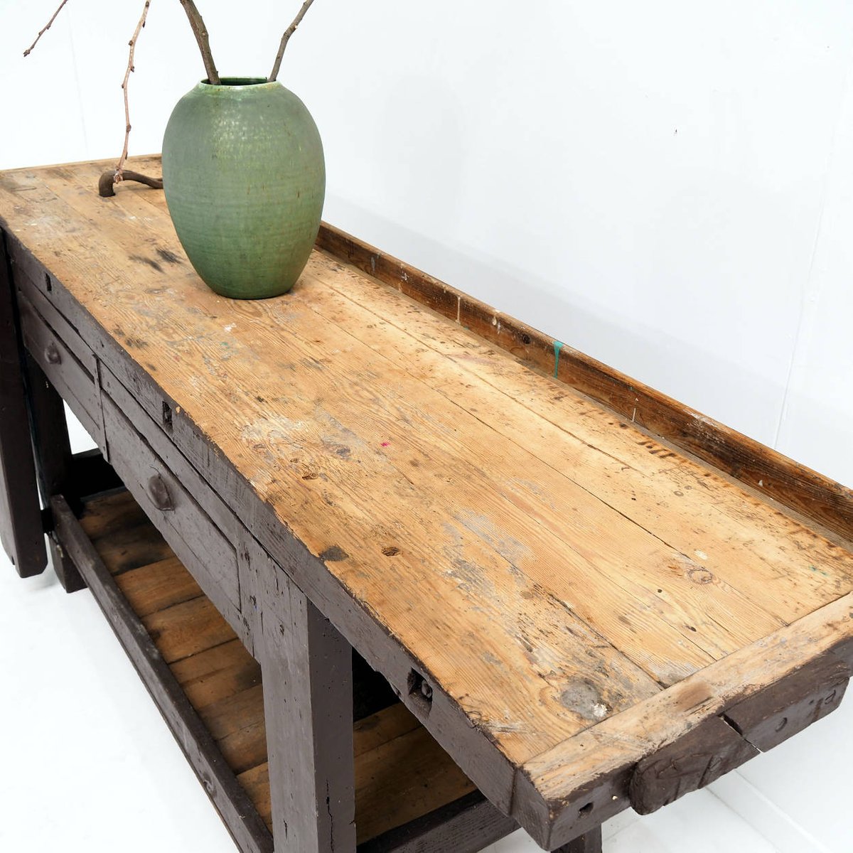 Brown Painted Workbench with Shelf and Drawers