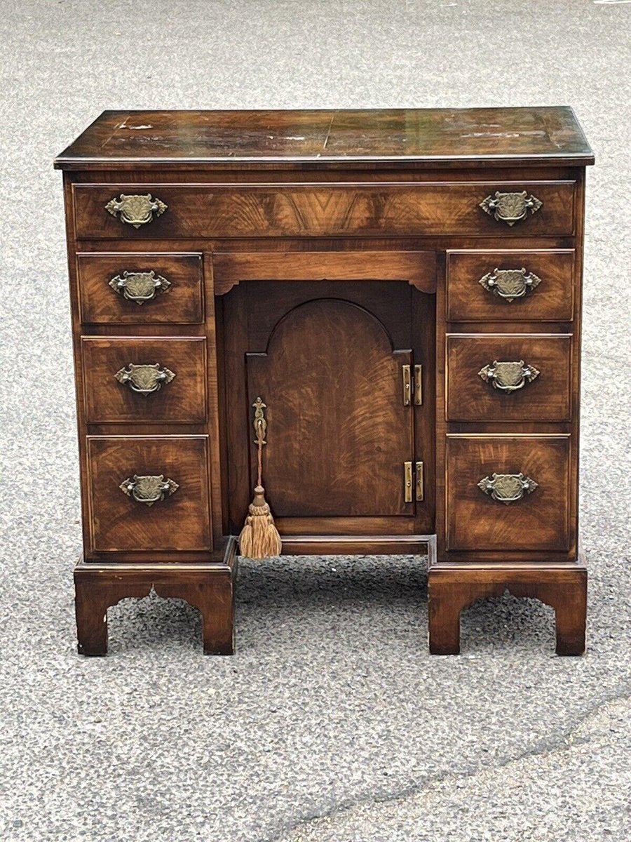 Burr Walnut Kneehole Desk on Bracket Feet with Brass Handles