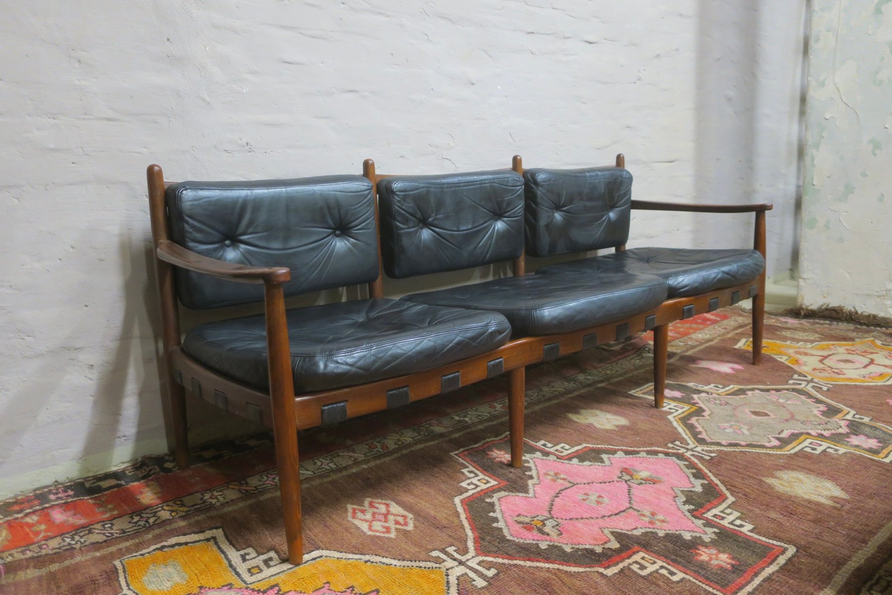 Cadett 3-Seater Sofa in Teak and Leather with Leather Straps by Eric Merthen, 1960s