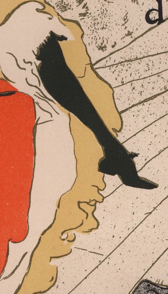 Toulouse-Lautrec's debt to the Impressionists, particularly the more figurative painters like Manet and Degas, is apparent, that within his works, one can draw parallels to the detached barmaid at A Bar at the Folies-Bergère by Manet and the behind-the-scenes ballet dancers of Degas. Toulouse-Lautrec's style was also influenced by the Ukiyo-e genre of Japanese woodblock prints, which became popular in the Parisian art world.