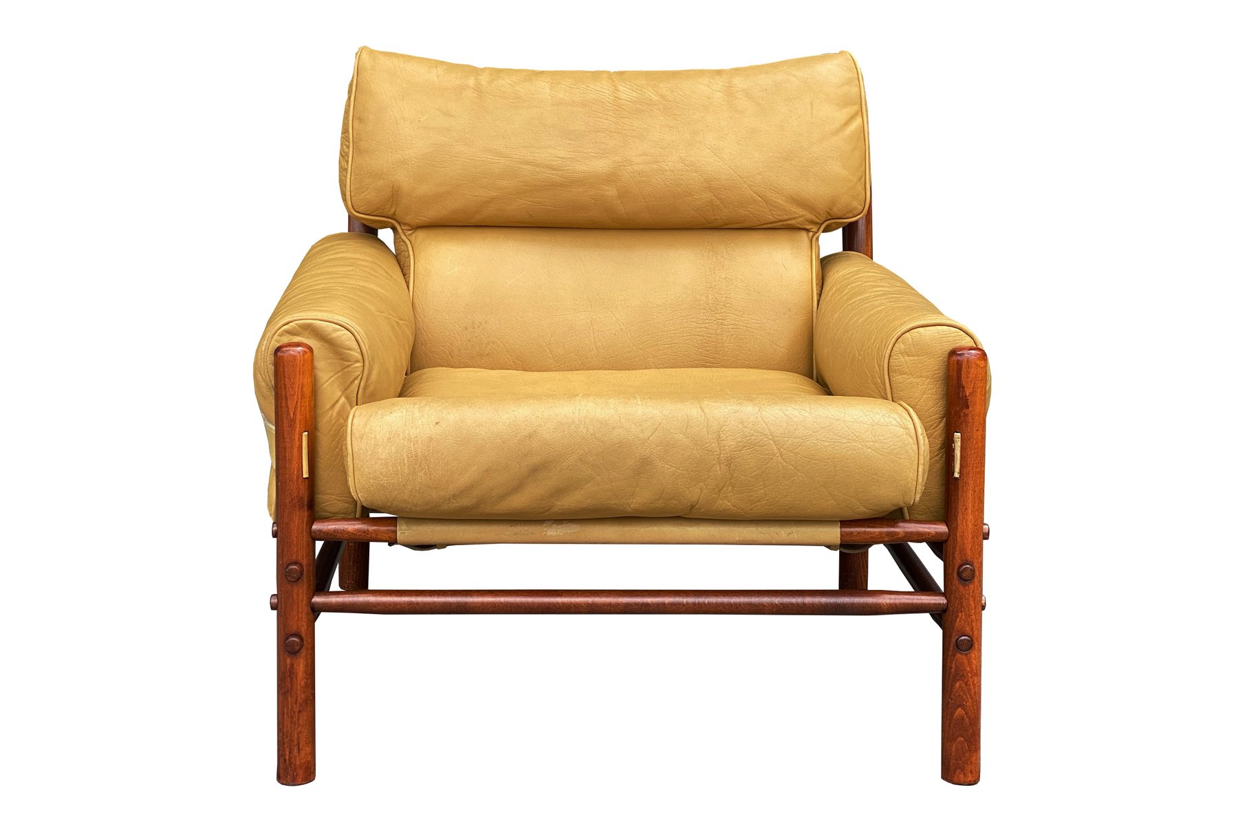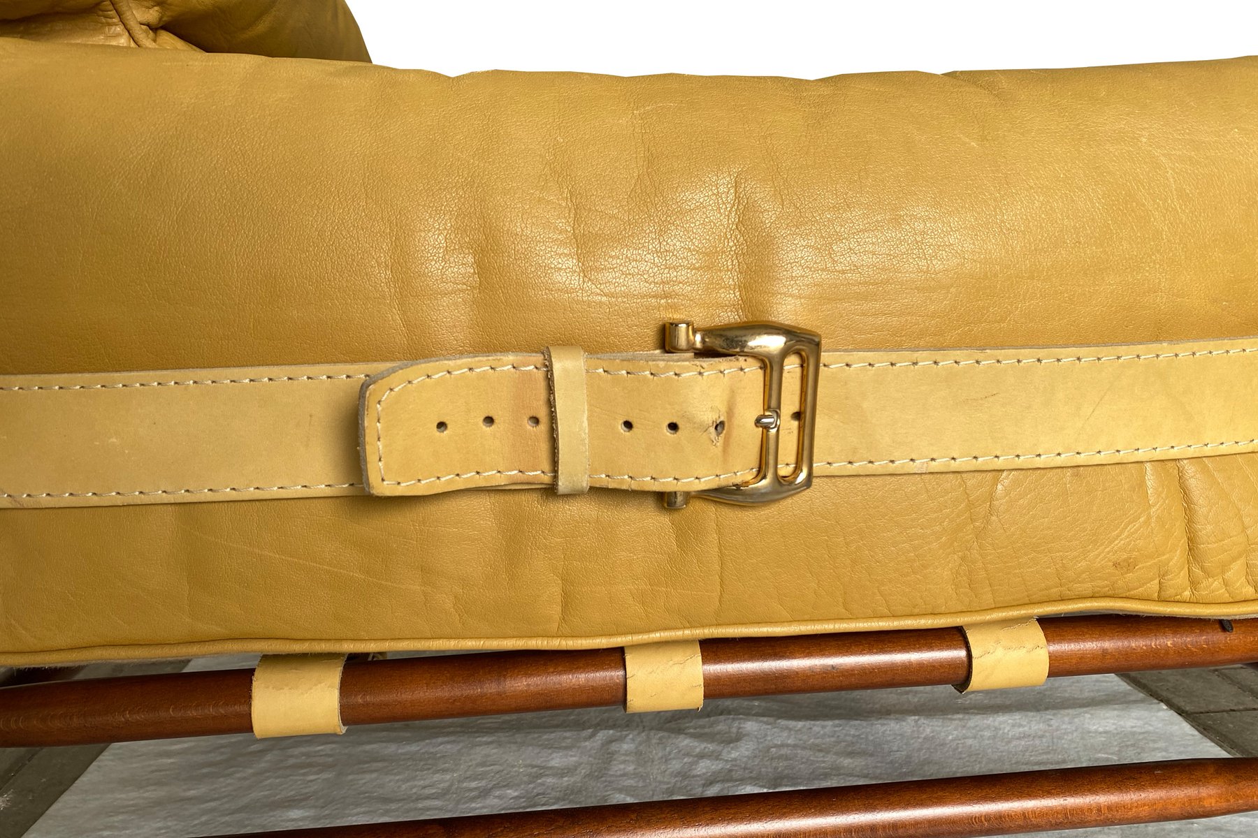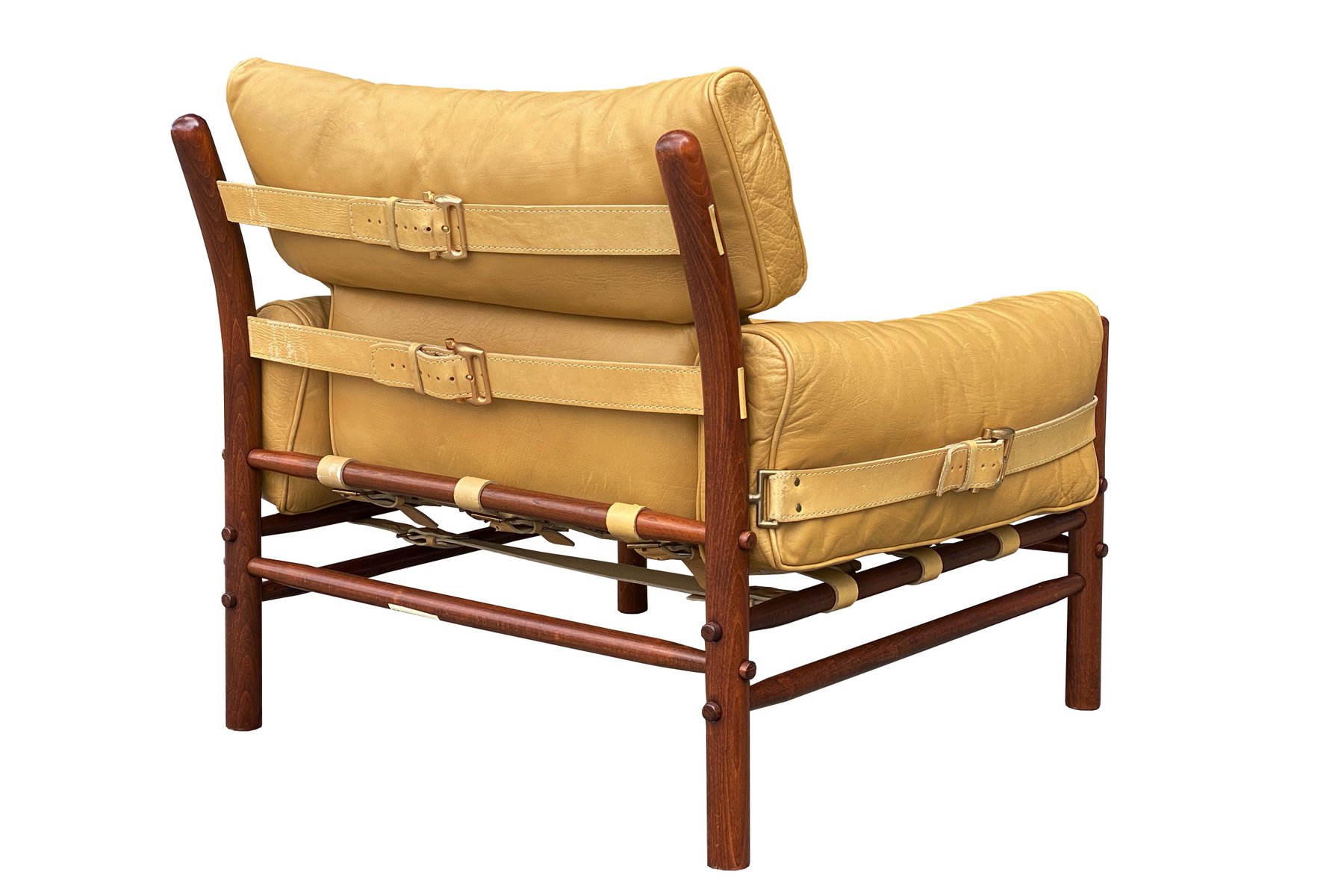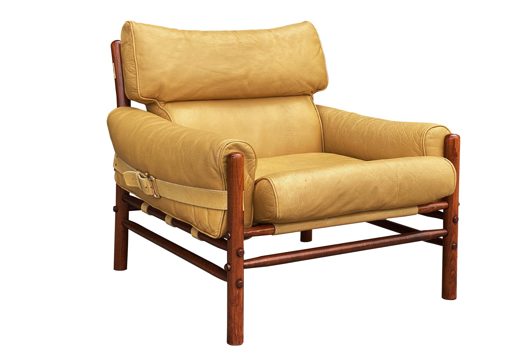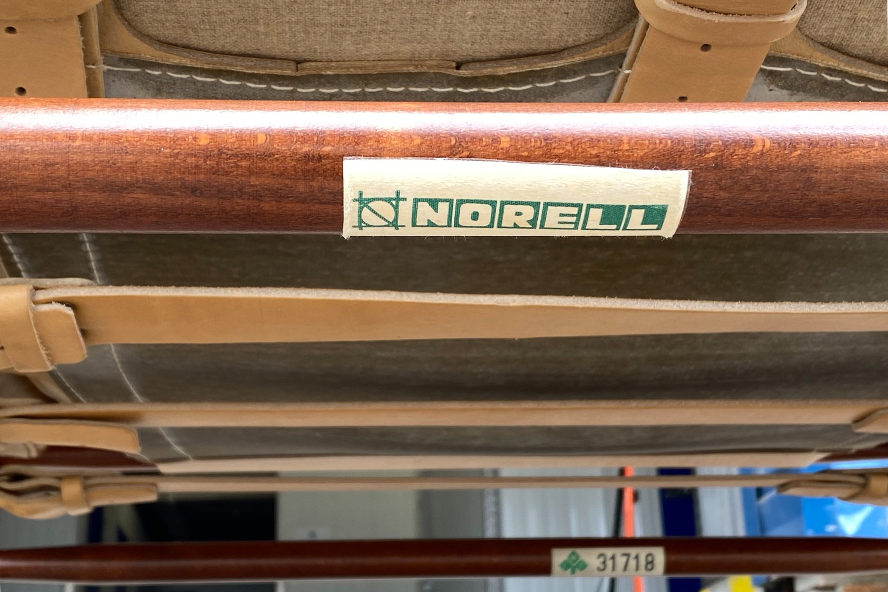 Norell is often praised for pioneering “conceptual” furniture, because he employed traditional materials—leather, turned wood, bentwood, and metal, for example—in unexpected forms, often with lyrical results. His designs have an affinity with those of Danish designer Kaare Klint (1888-1954), who, a generation before, brought time-honored, vernacular forms into modernist expression. In fact, Klint’s iconic Safari Chair (1933) inspired Norell to create the Sirocco Safari Chair (1964), which is lightweight, collapsible, and held together by leather support straps instead of glue or screws. Norell’s wood-framed Inka Armchair, Indra Sofa, and Ilona Sofa (design dates unverified) are likewise held together by leather.