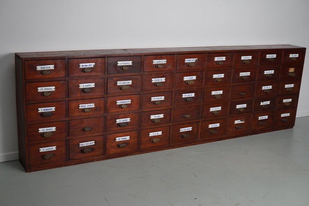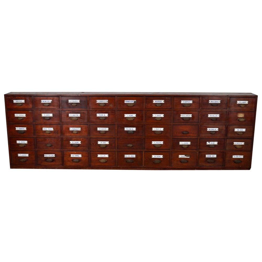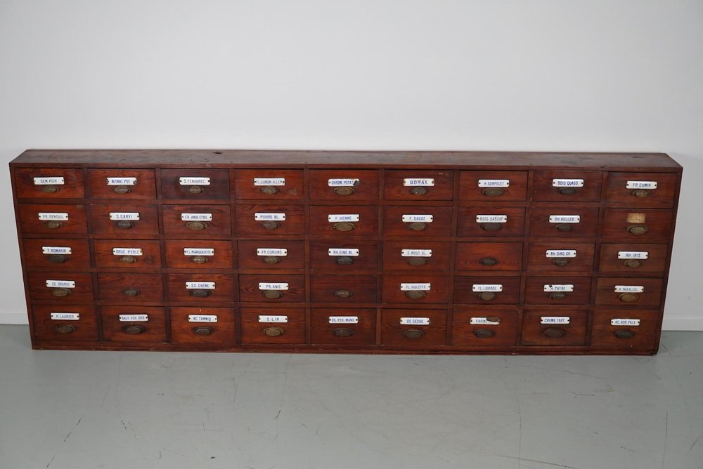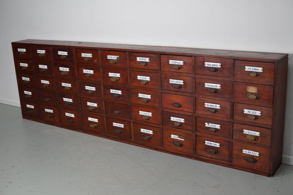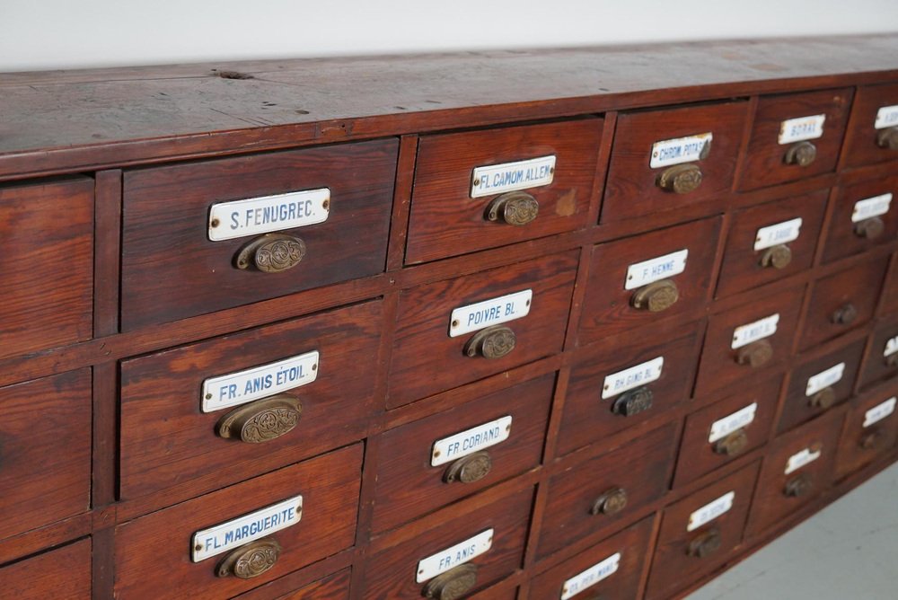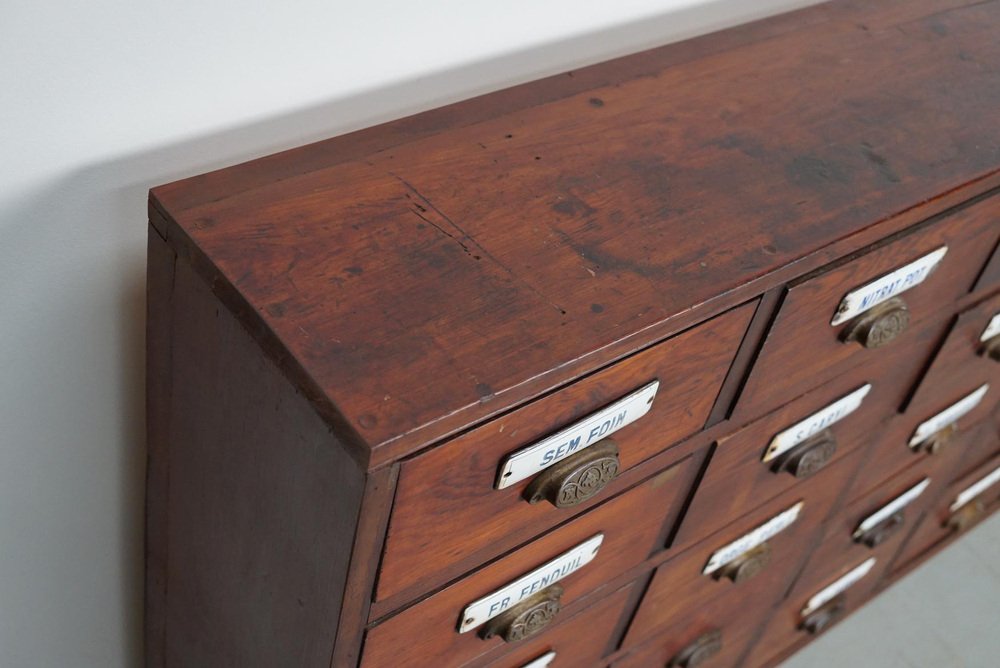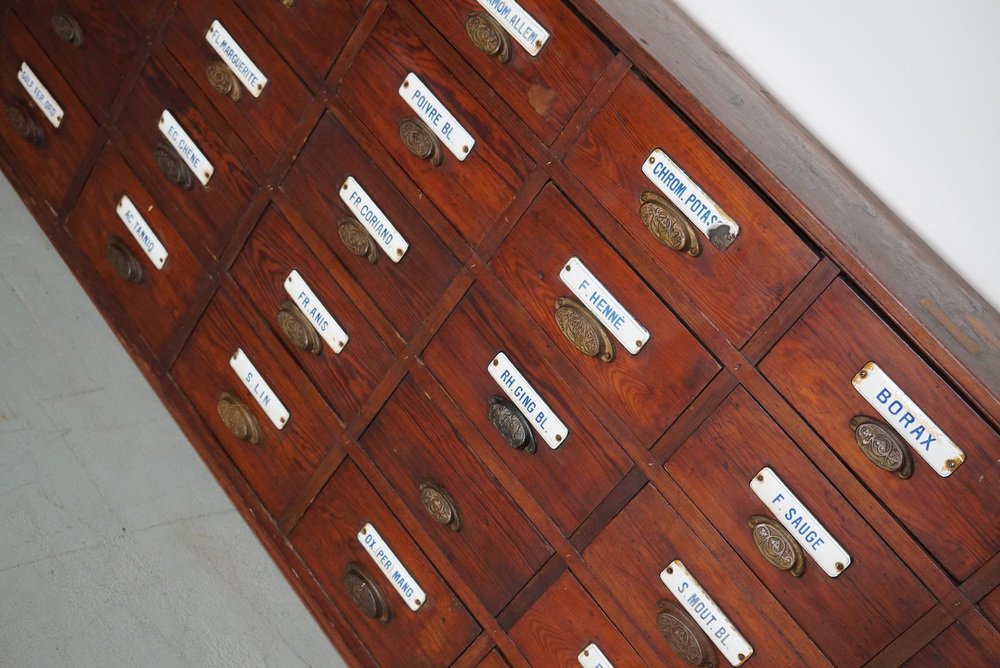 Large Belgian Pitch Pine Apothecary Cabinet with Enamel Shields, 1900s