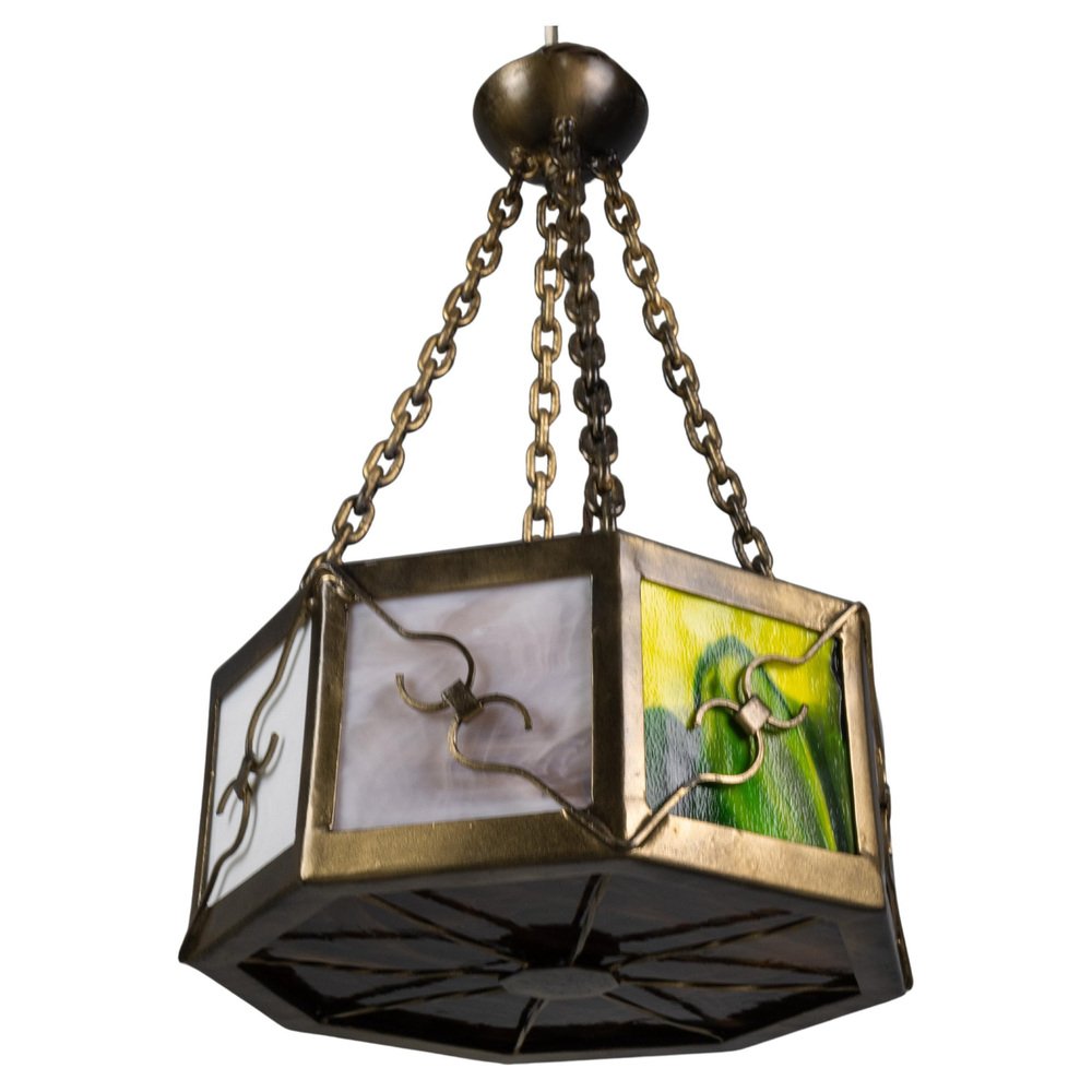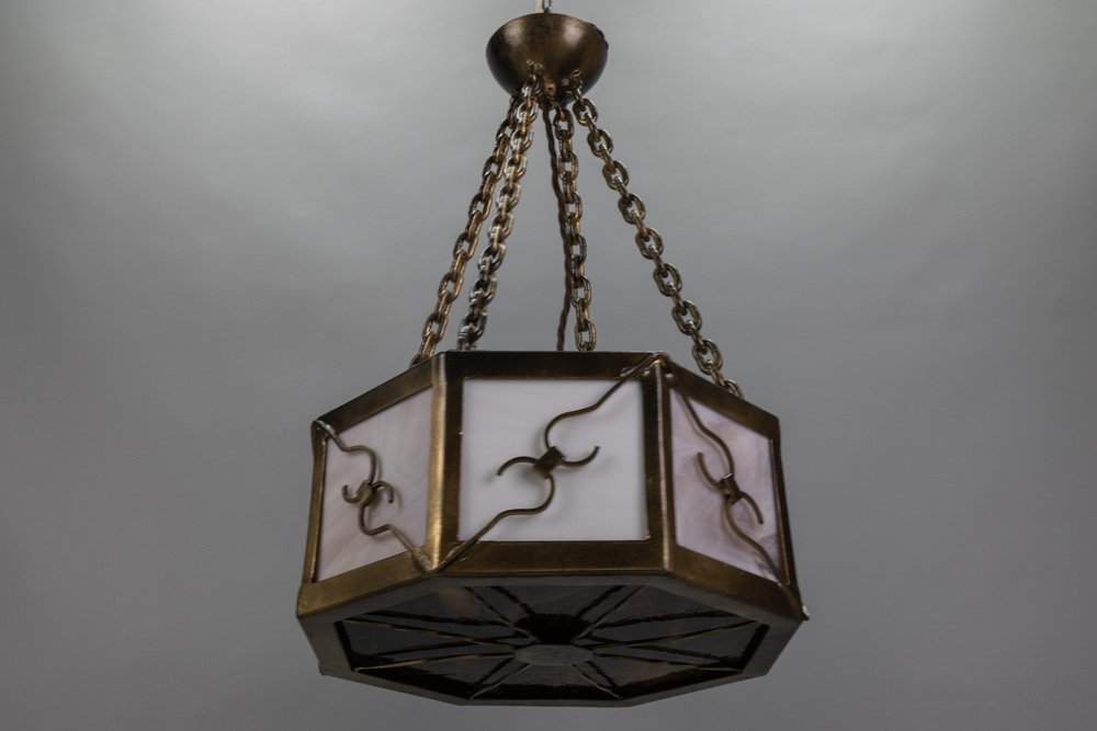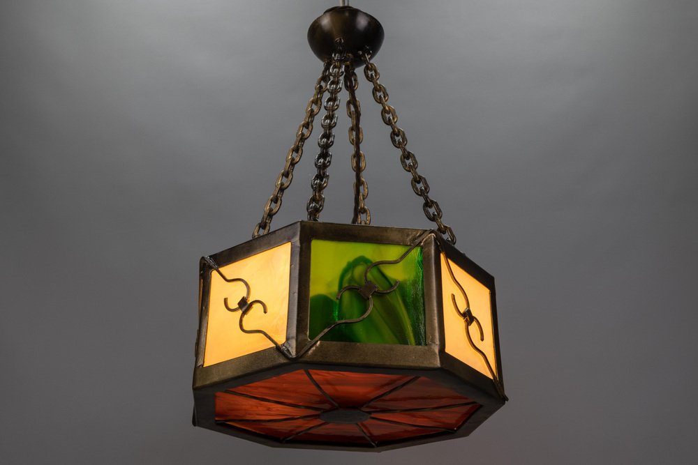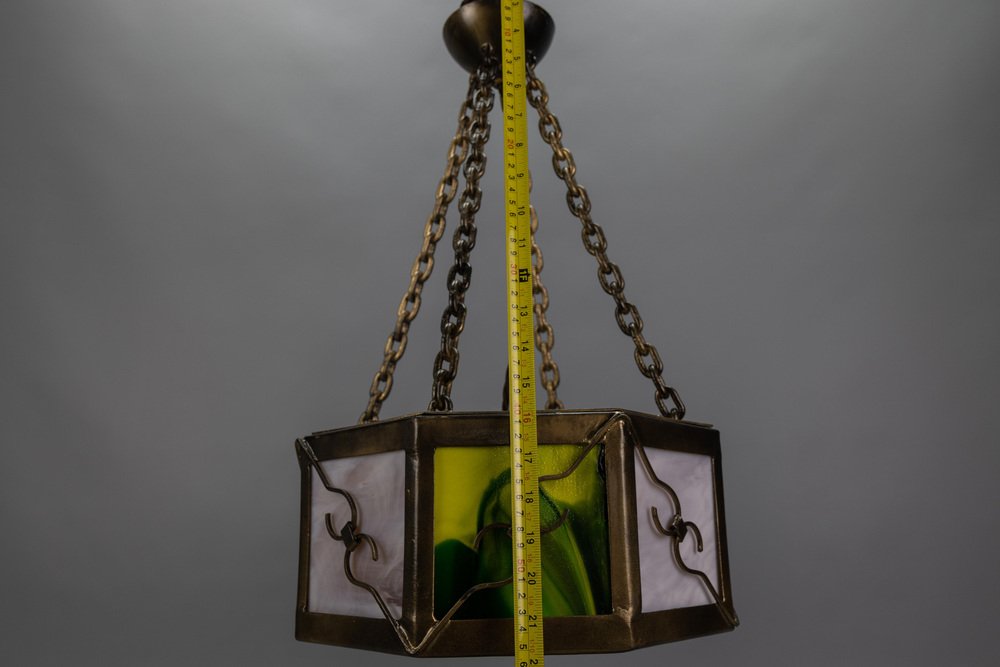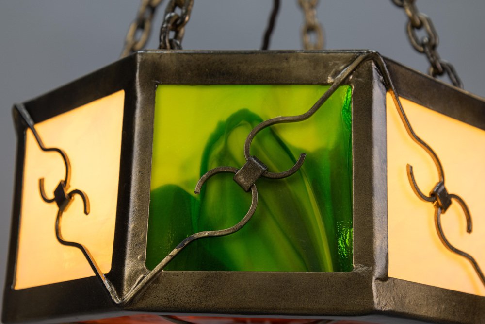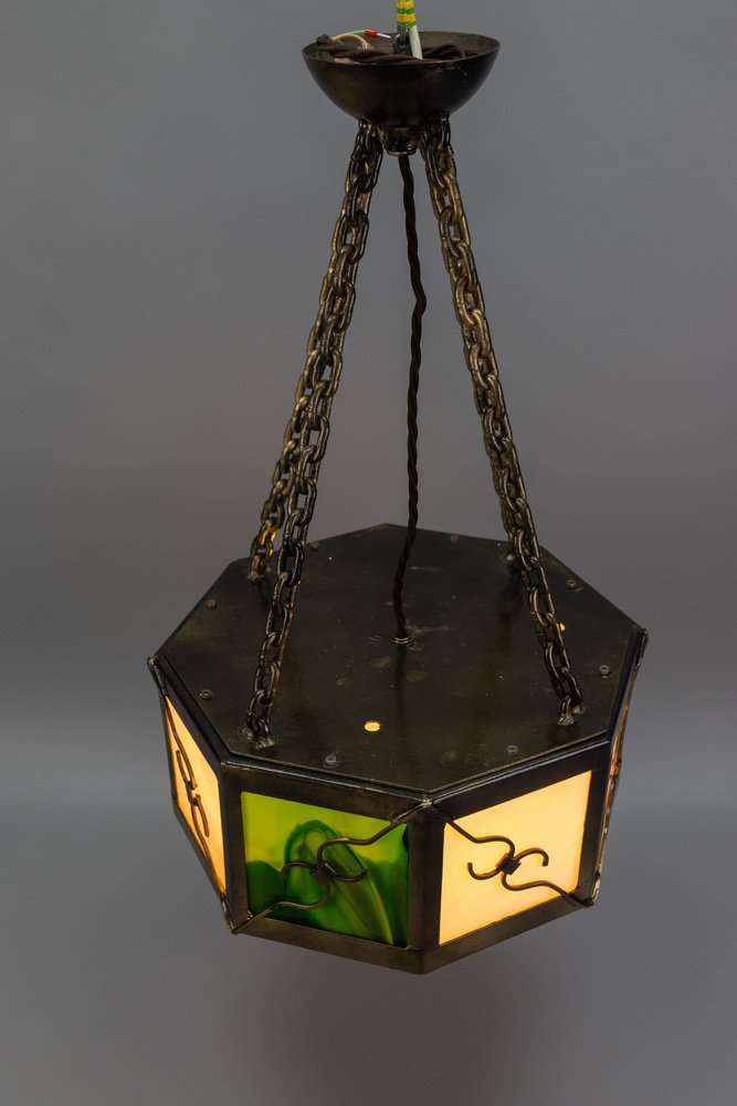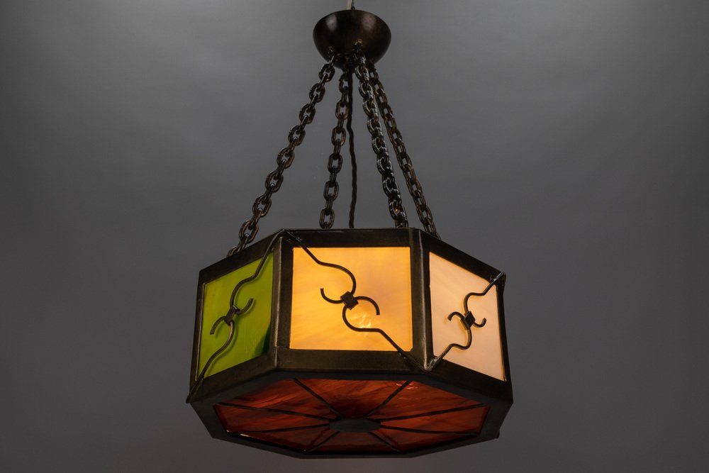 Mid-Century Octagonal Patinated Metal and Art Glass Pendant Light, Germany