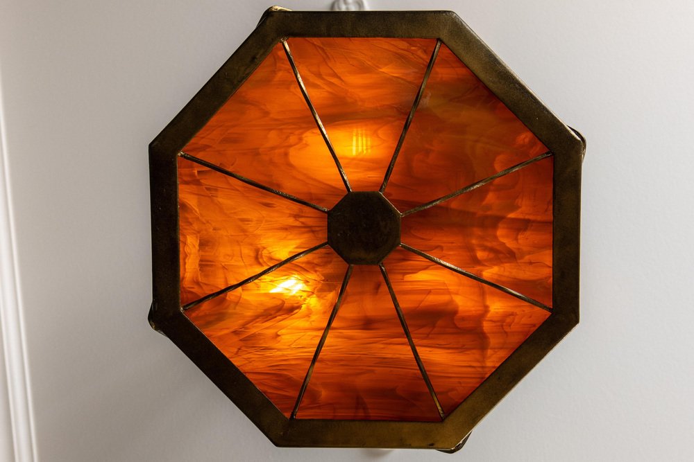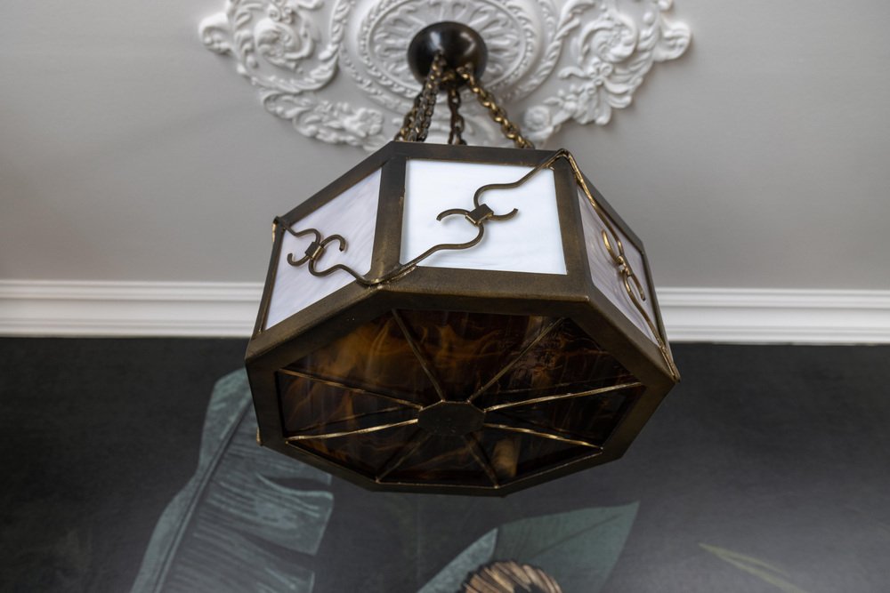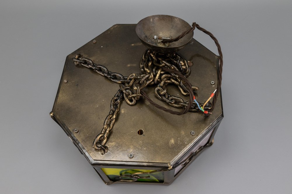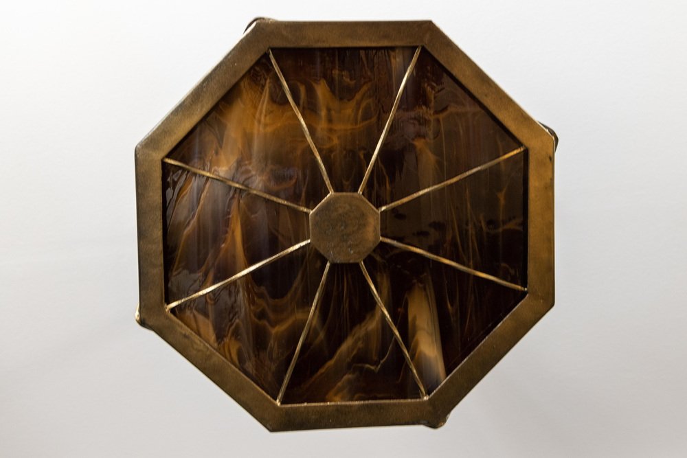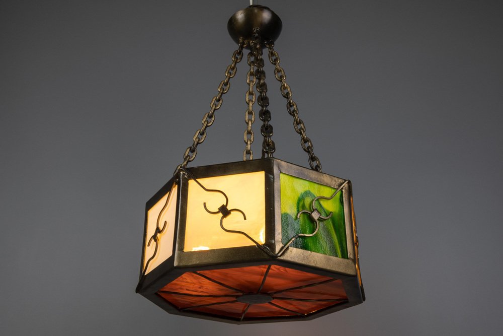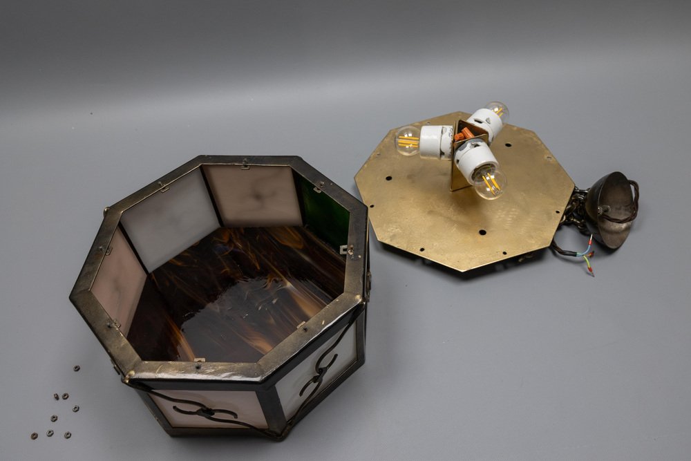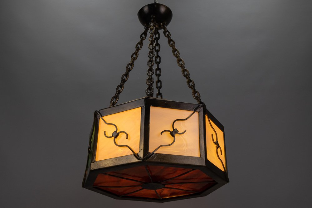 Mid-Century Octagonal Patinated Metal and Art Glass Pendant Light, Germany