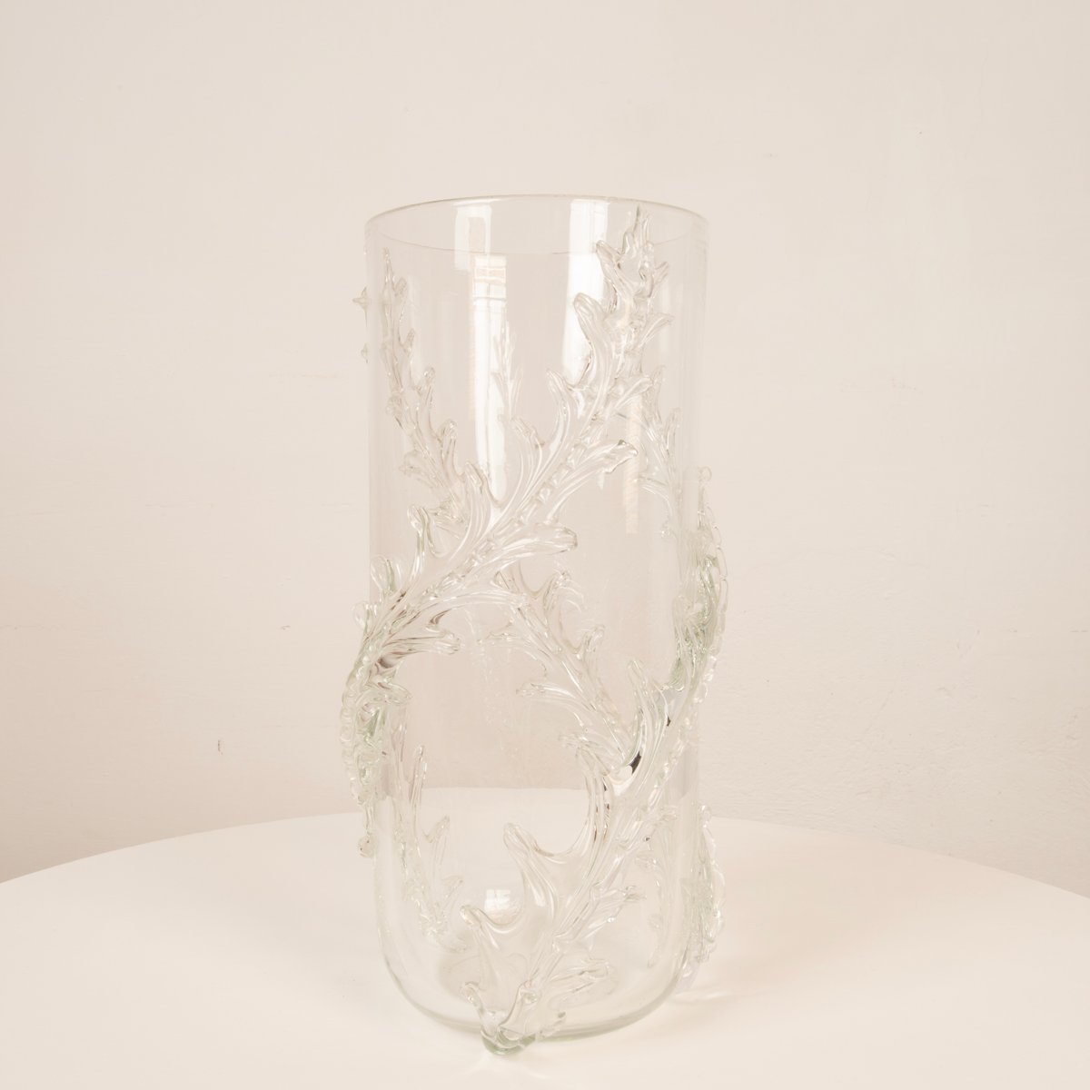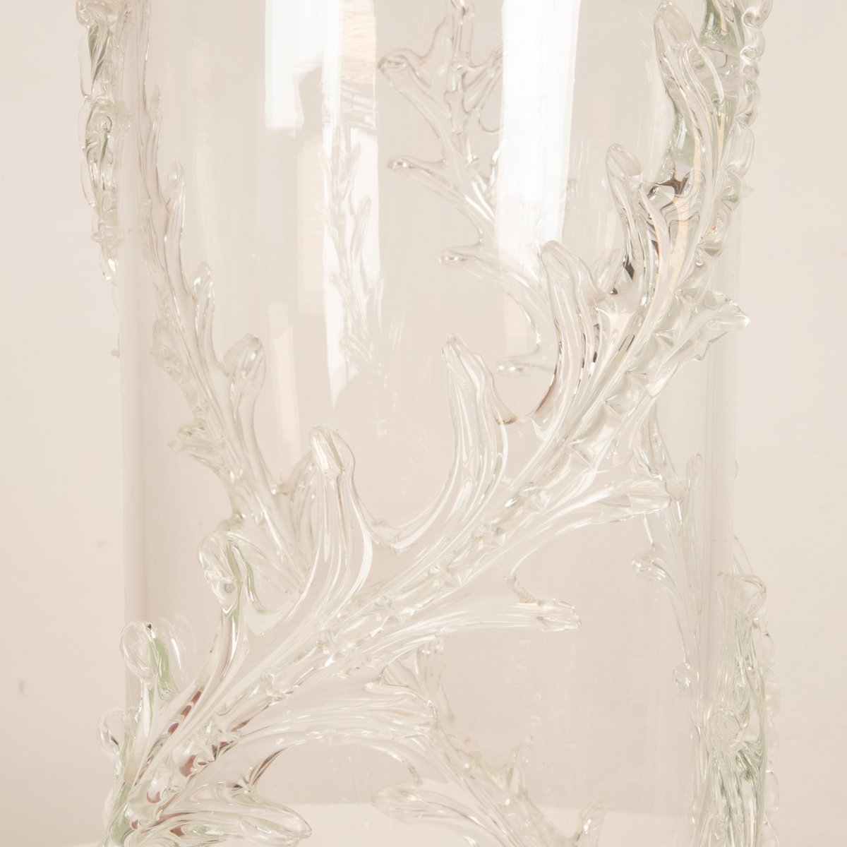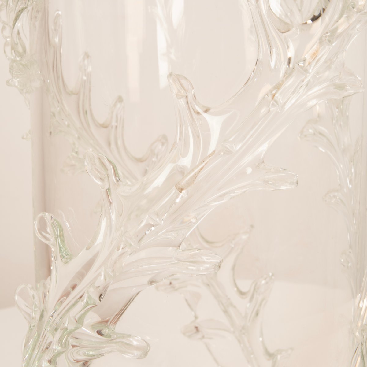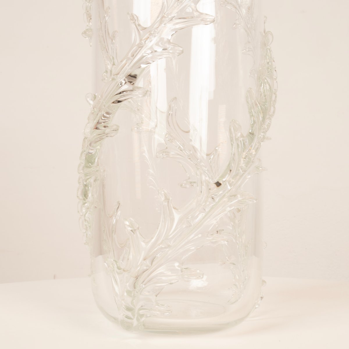 Distinctive Design: Cylindrical body of monumental proportions, enriched with complex hand-applied relief applications that develop in an ascending movement, evoking feathers or plant fronds; an exceptional balance between transparency, light, and shadow