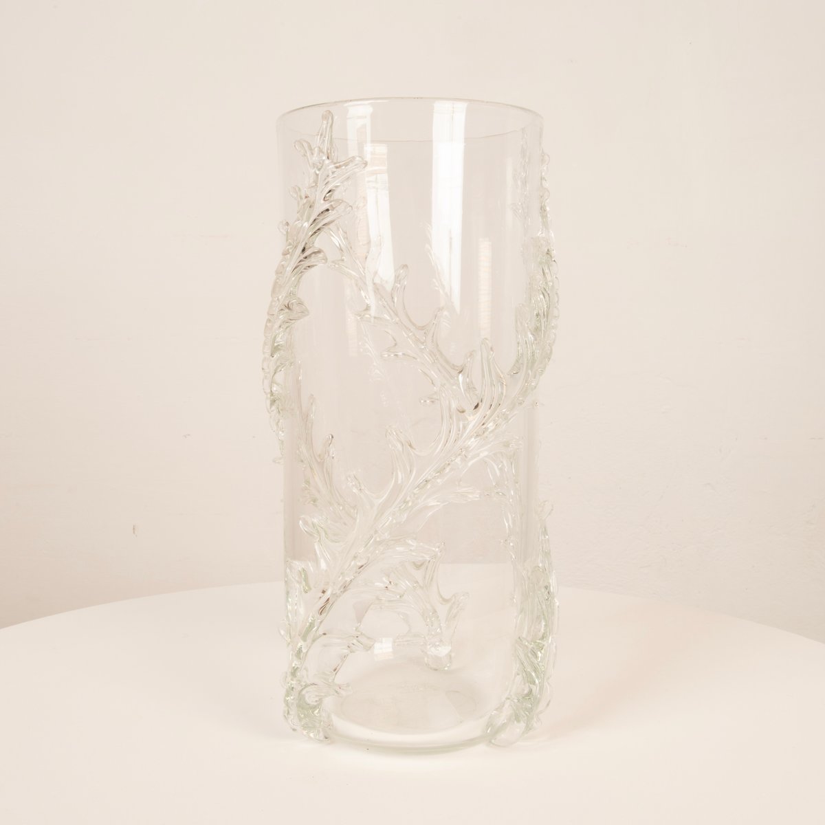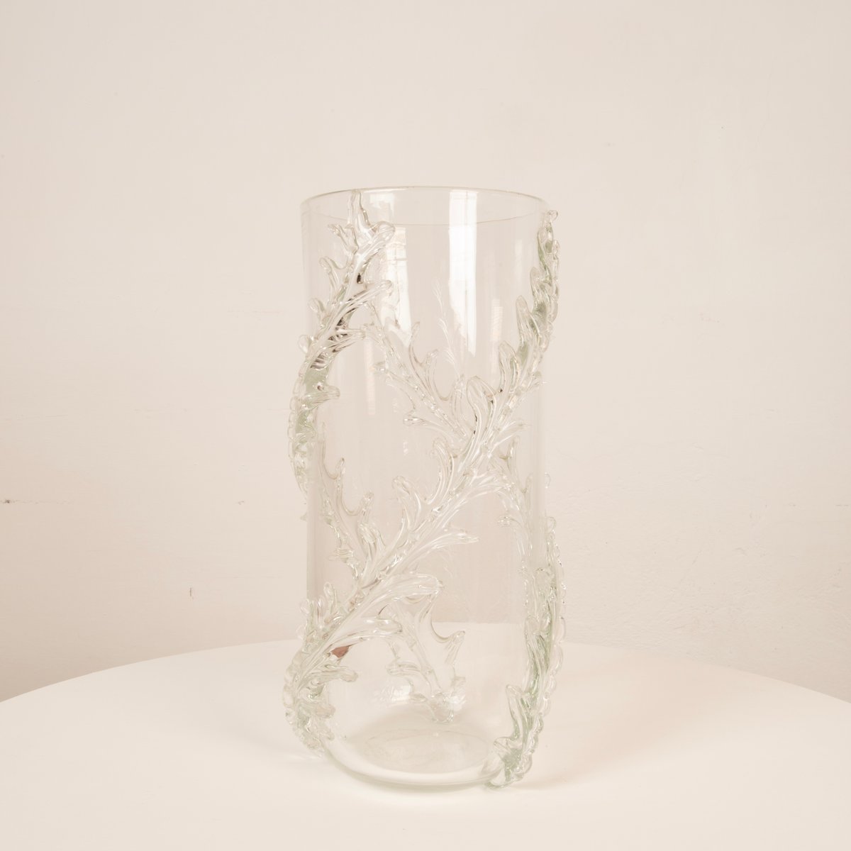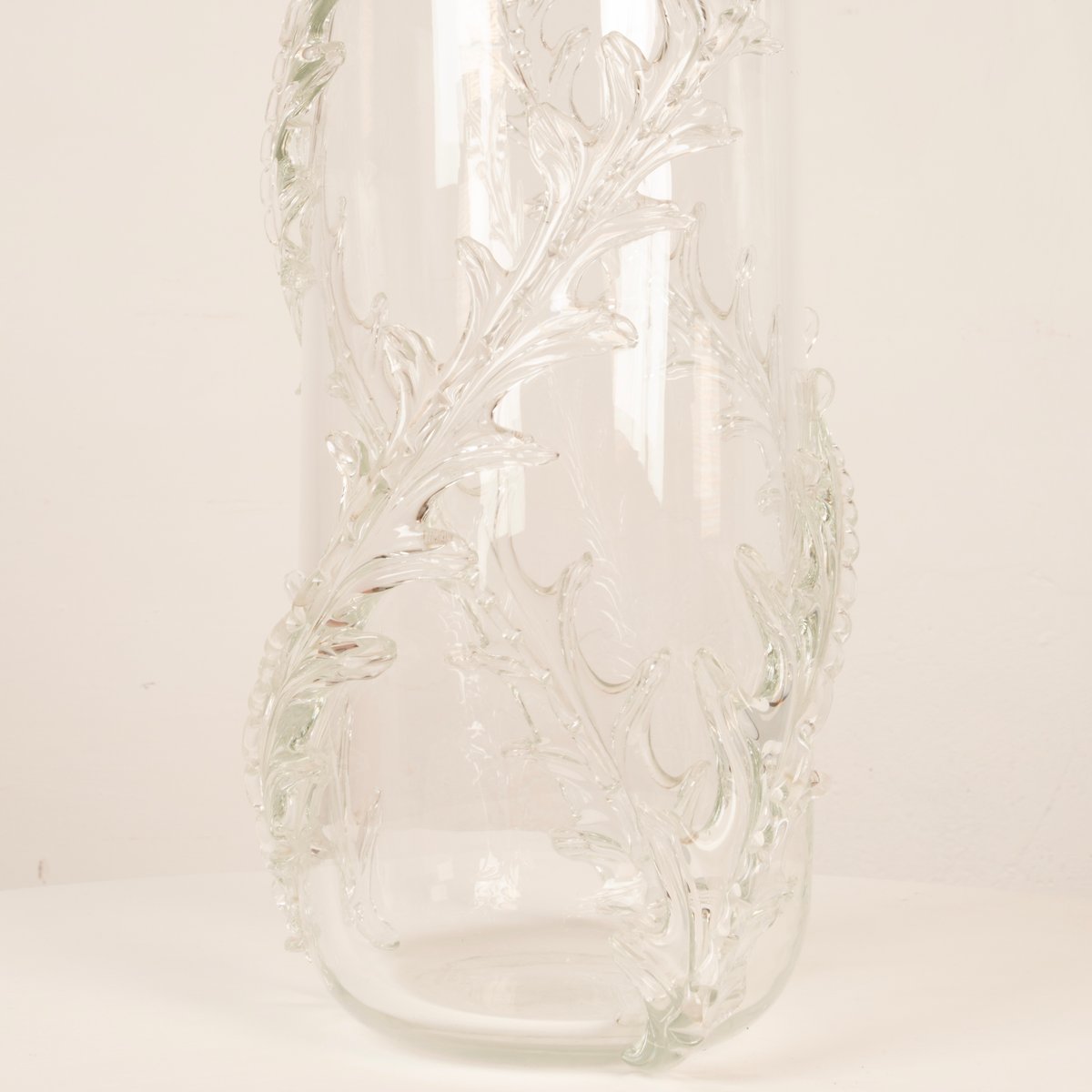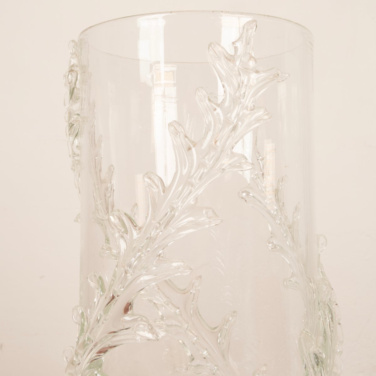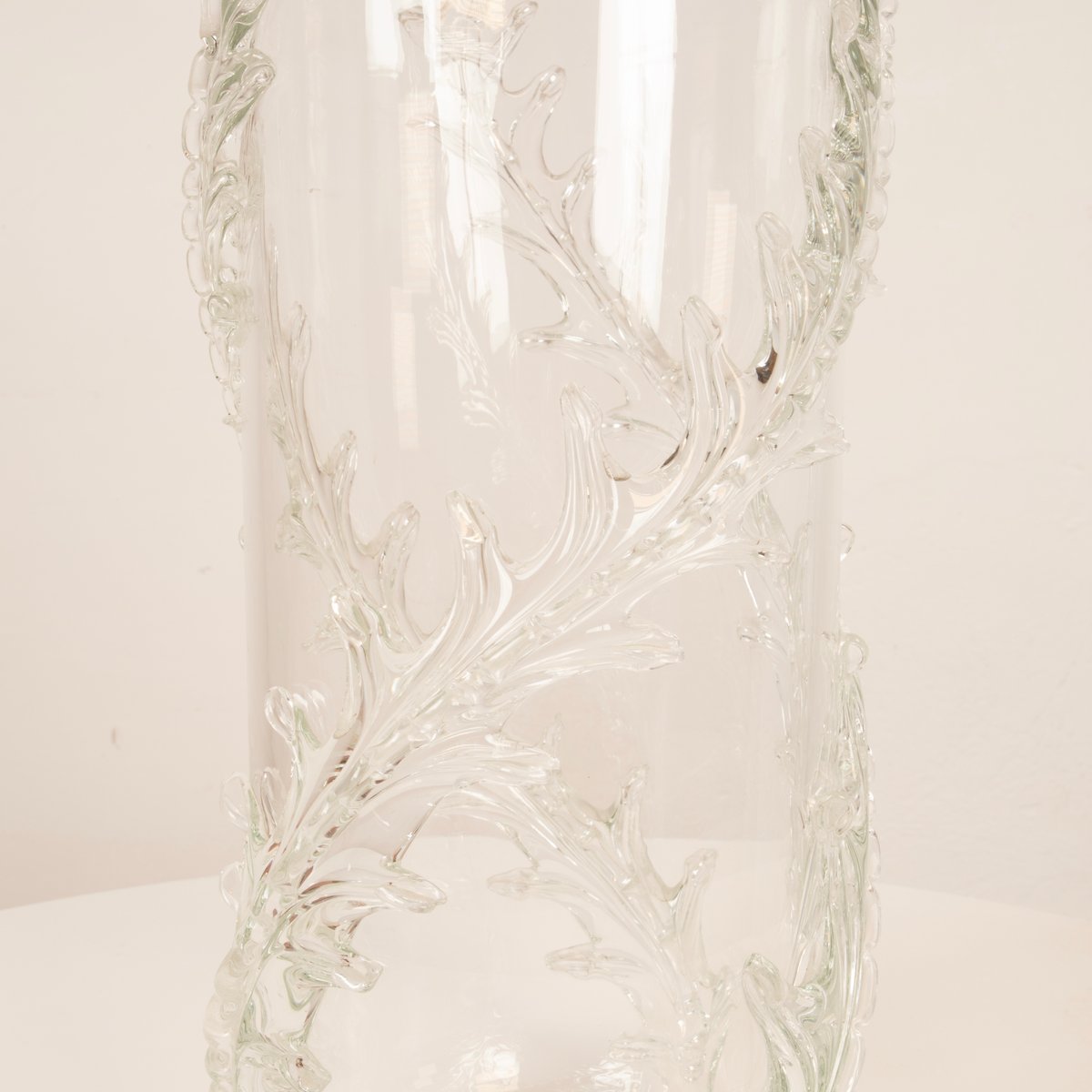 Distinctive Design: Cylindrical body of monumental proportions, enriched with complex hand-applied relief applications that develop in an ascending movement, evoking feathers or plant fronds; an exceptional balance between transparency, light, and shadow