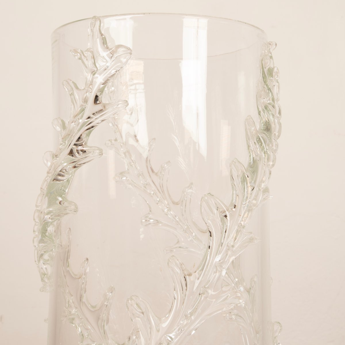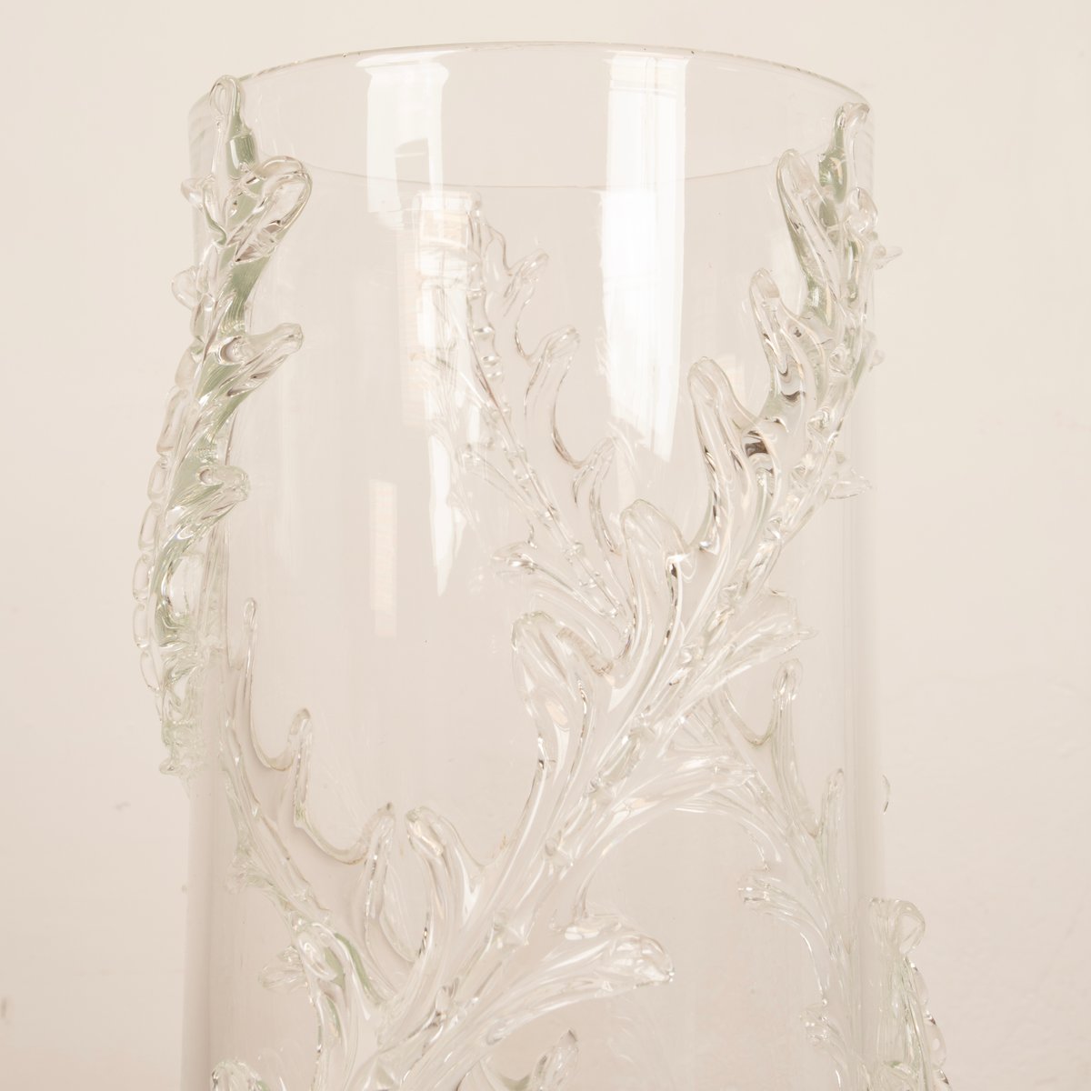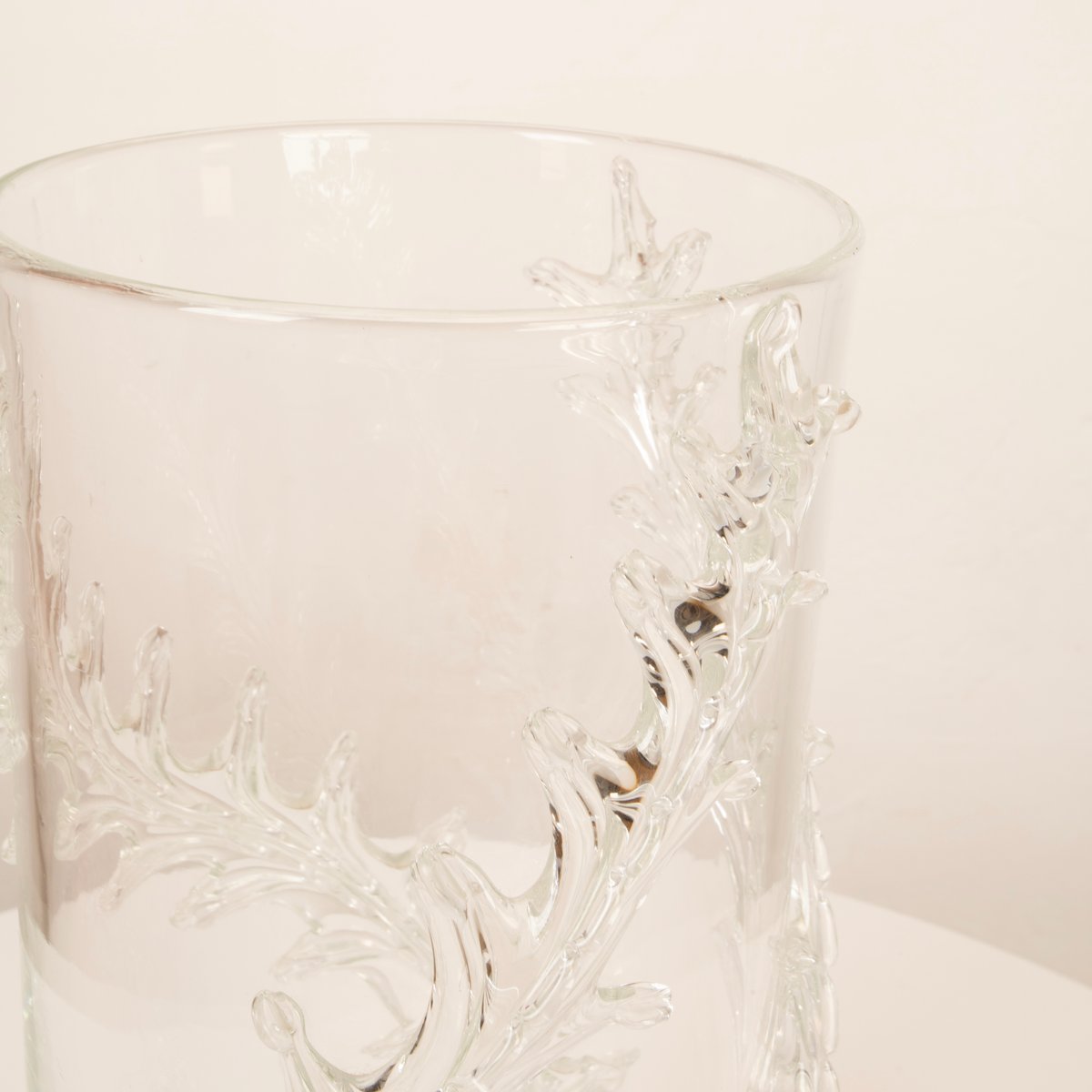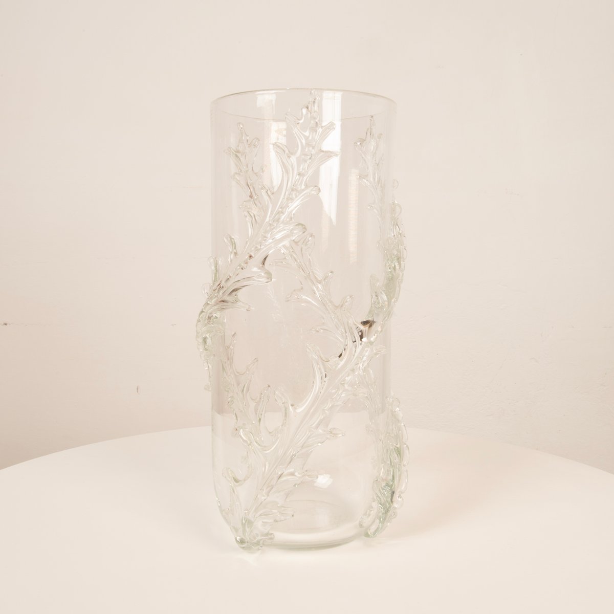 Distinctive Design: Cylindrical body of monumental proportions, enriched with complex hand-applied relief applications that develop in an ascending movement, evoking feathers or plant fronds; an exceptional balance between transparency, light, and shadow