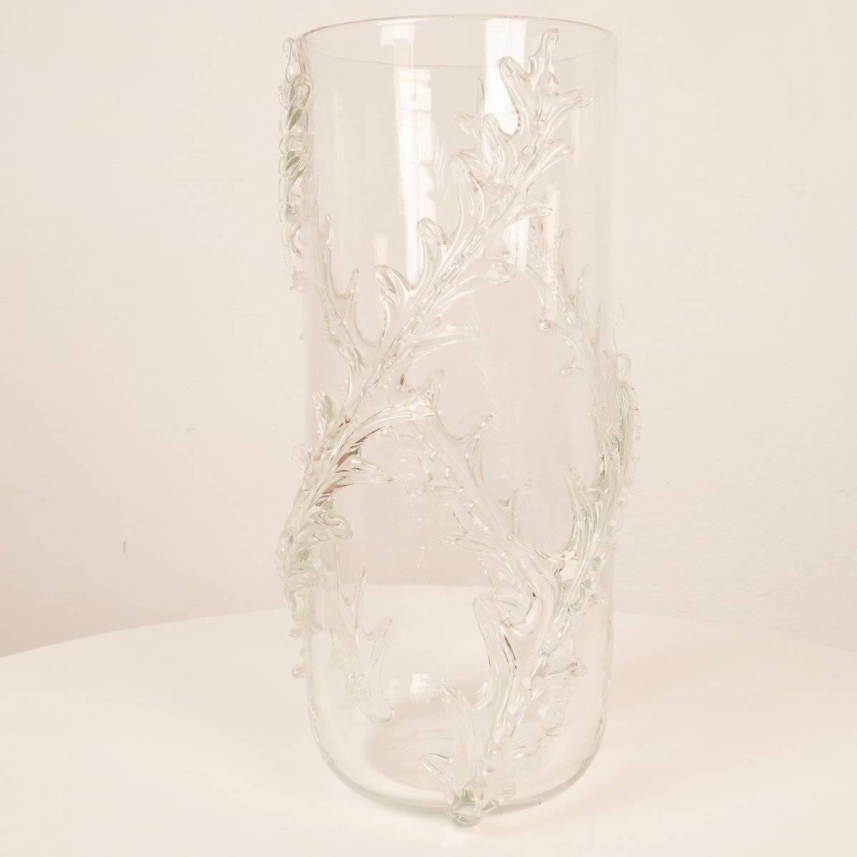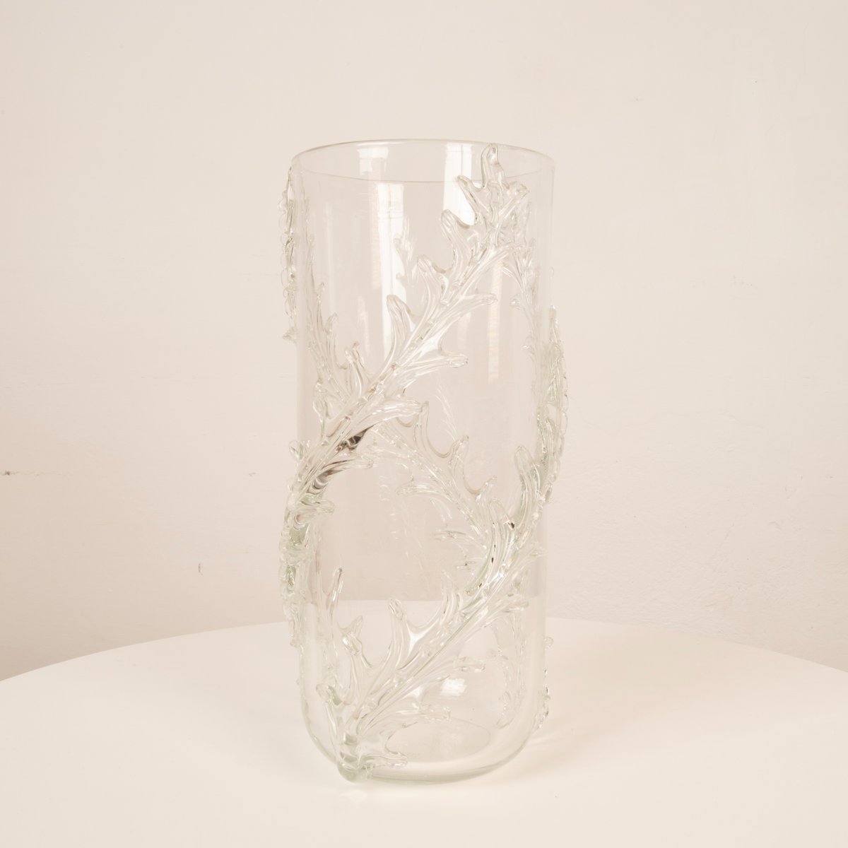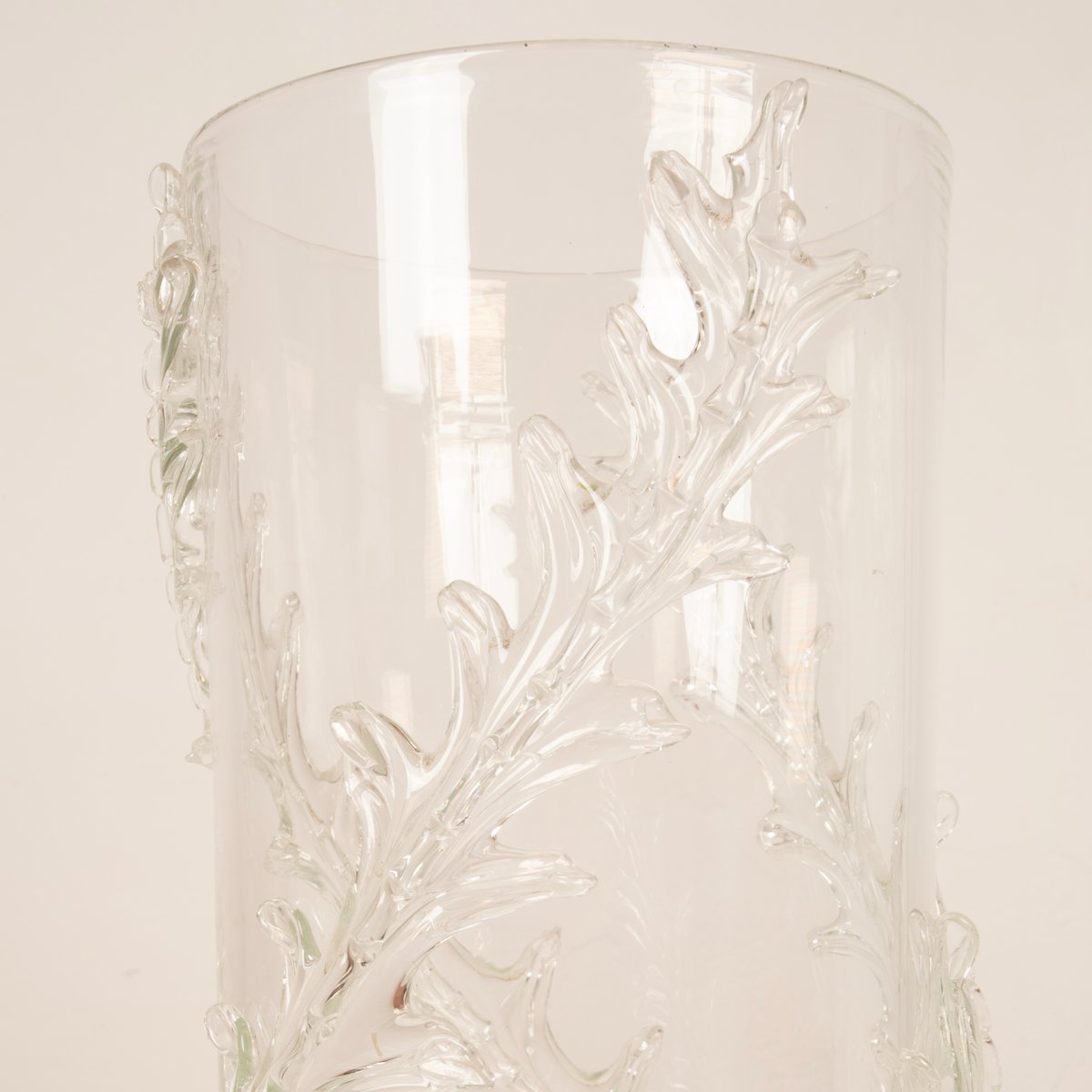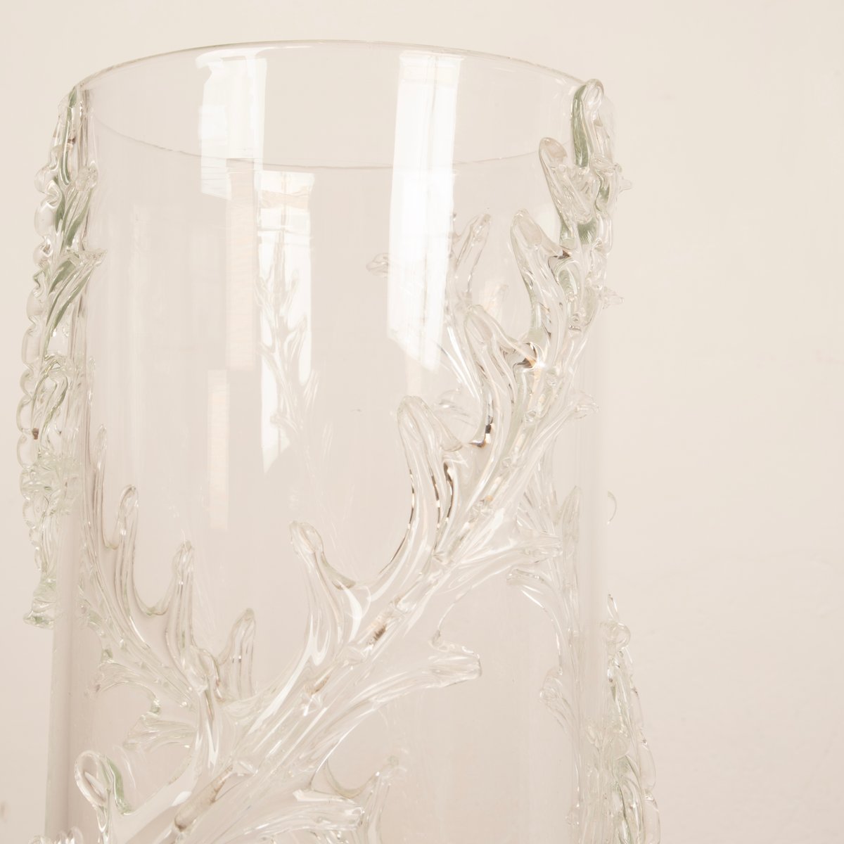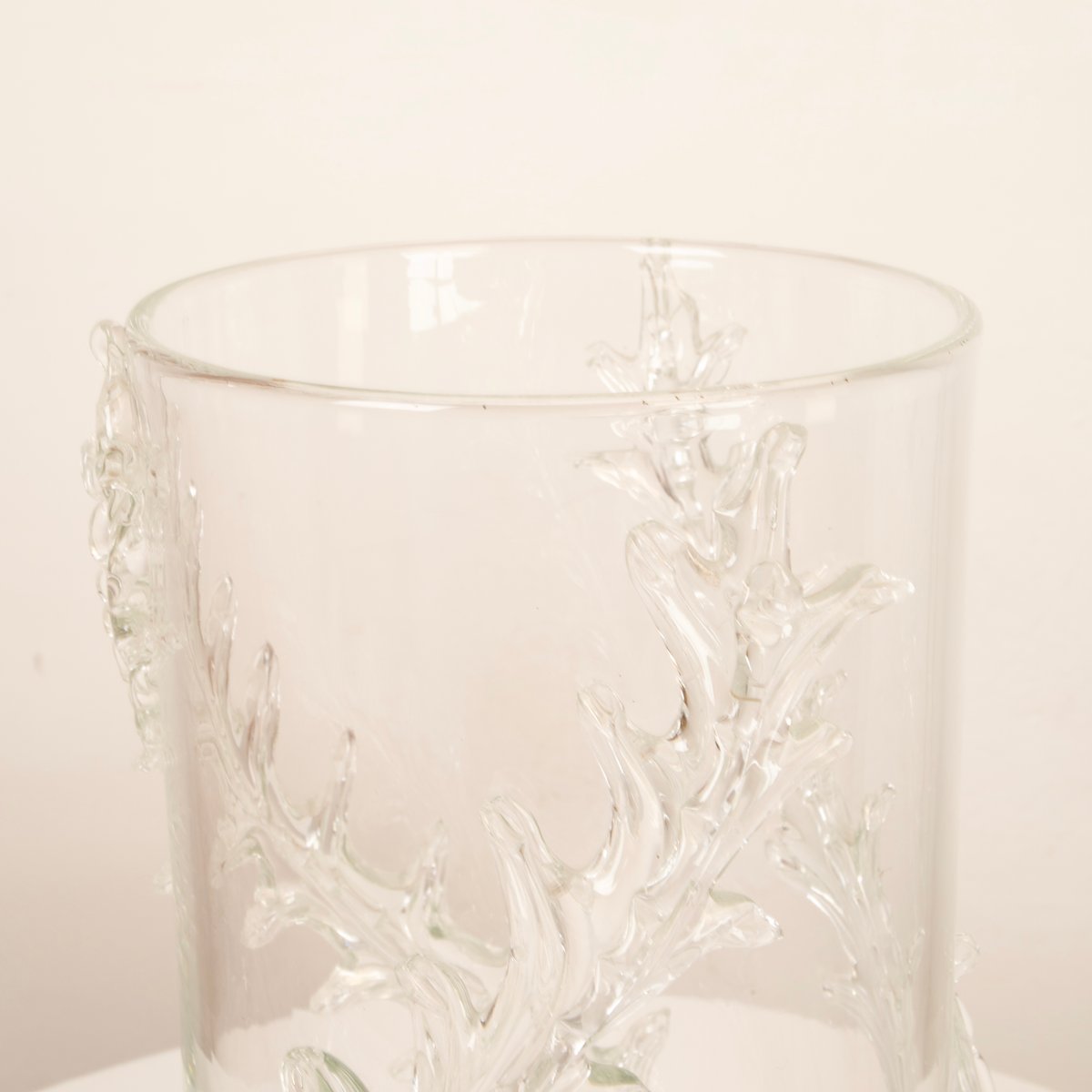 Distinctive Design: Cylindrical body of monumental proportions, enriched with complex hand-applied relief applications that develop in an ascending movement, evoking feathers or plant fronds; an exceptional balance between transparency, light, and shadow