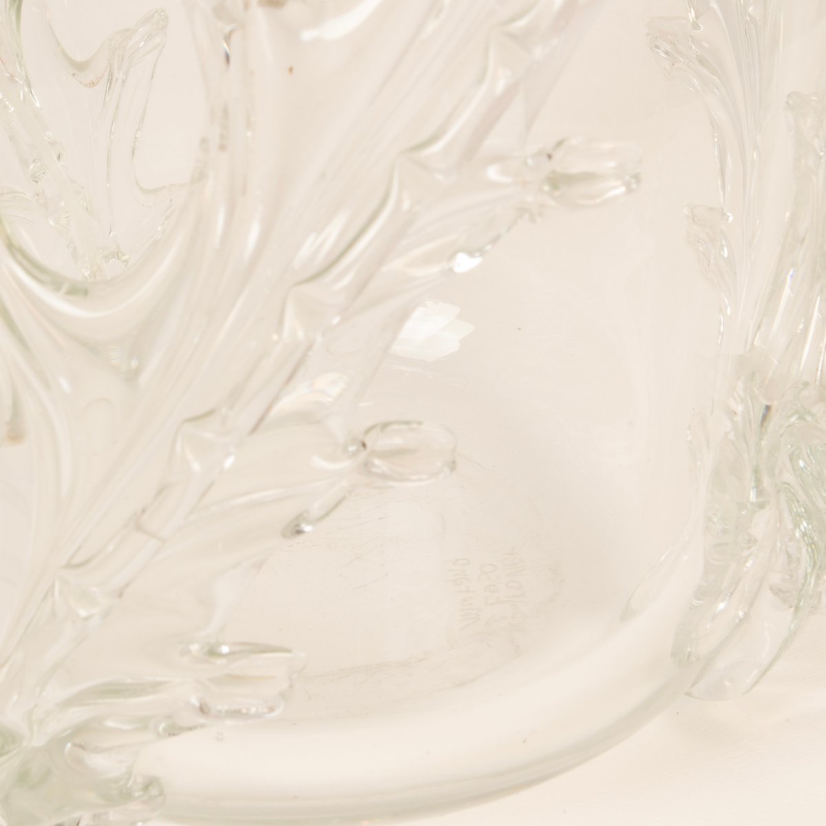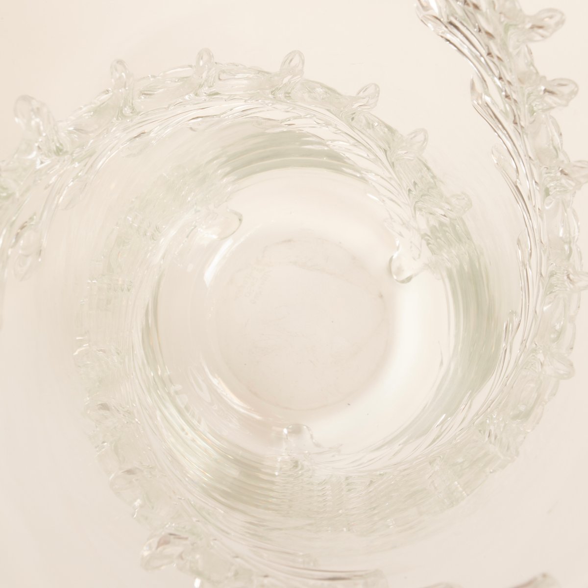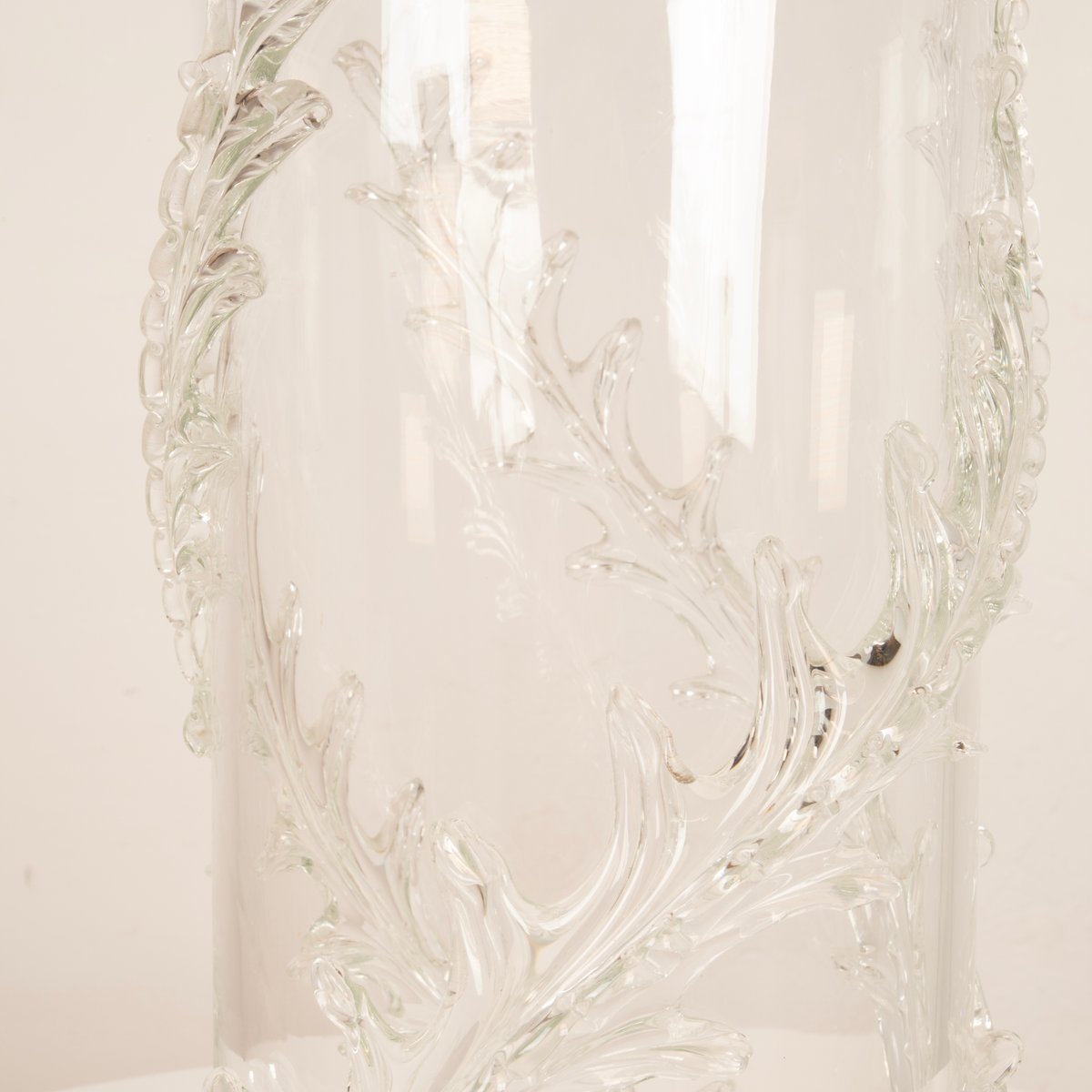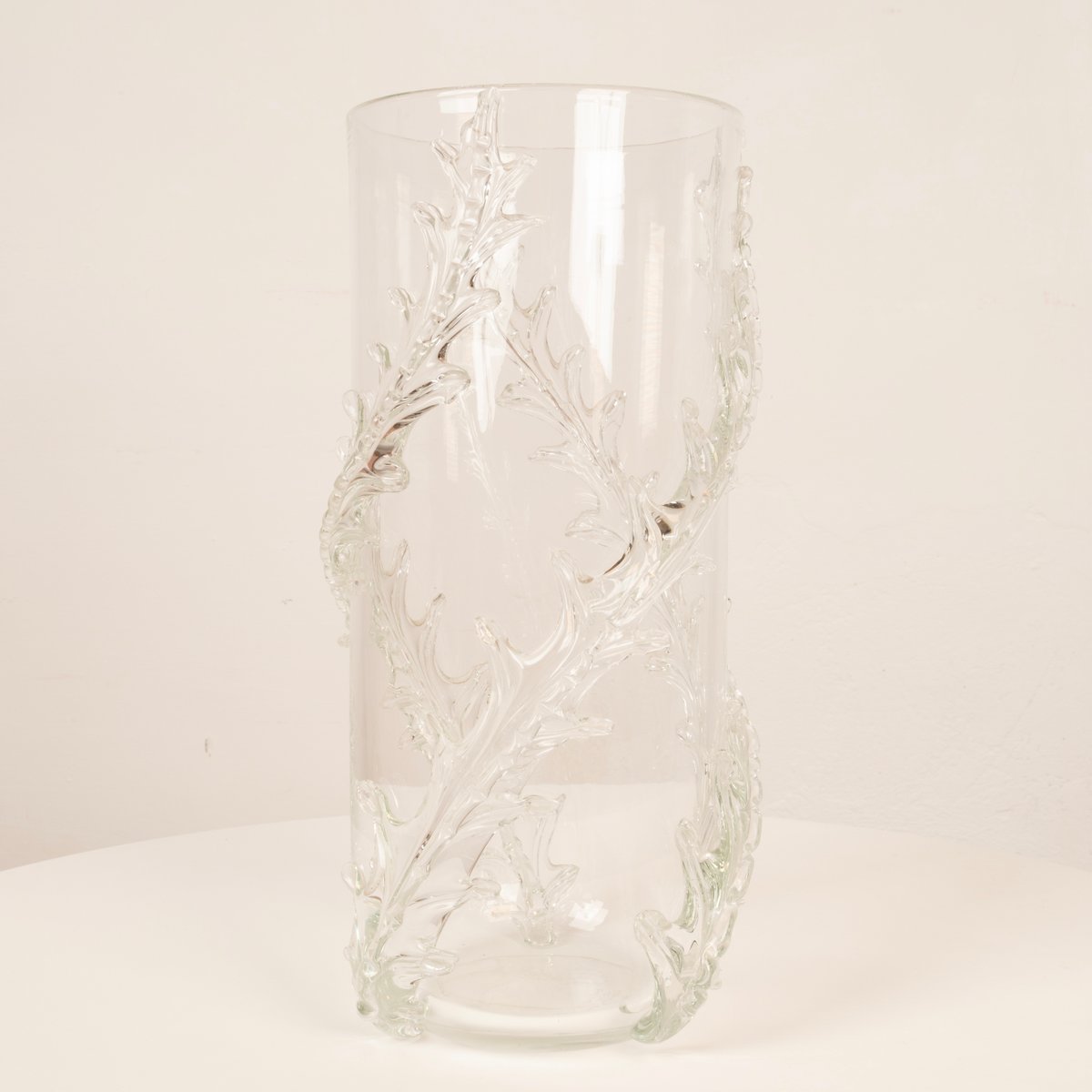 Distinctive Design: Cylindrical body of monumental proportions, enriched with complex hand-applied relief applications that develop in an ascending movement, evoking feathers or plant fronds; an exceptional balance between transparency, light, and shadow