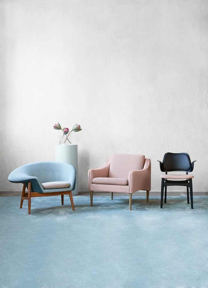 Olsen’s first successful design was the Roundette Dining Set (1952) for Frem Røjle Møbelfabrik. The compact, teak and leather design was an achievement in form and function, as the chair backs seamlessly tuck under the tabletop. Other standout designs from Olsen include the Shell Chair (1955), Easy Chair (1955), Fried Egg Chair (1956), the modular TV-bench (1956), CS500 Series (1962), Model 532A Rocking Chair (1963), and the Bikini Chair (1968)—iconic for its futuristic silhouette. Olsen’s Frederik the 9th Chair (1964)—named after Danish King Frederik VII, who apparently preferred sitting backwards—won the A.I.D gold medal in 1965.