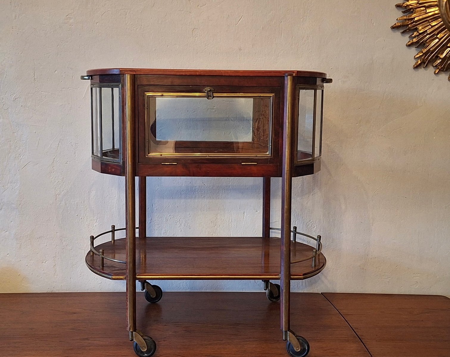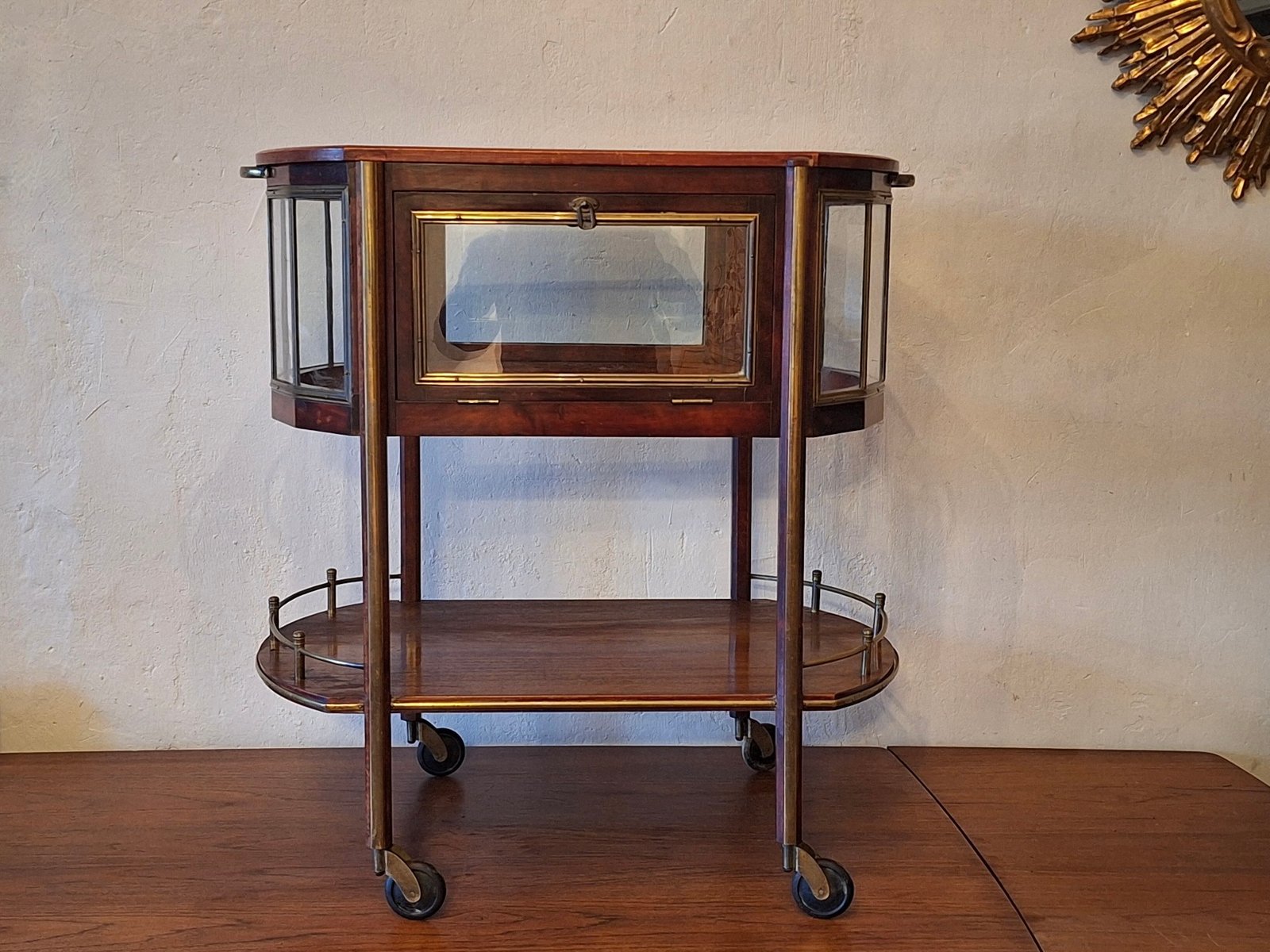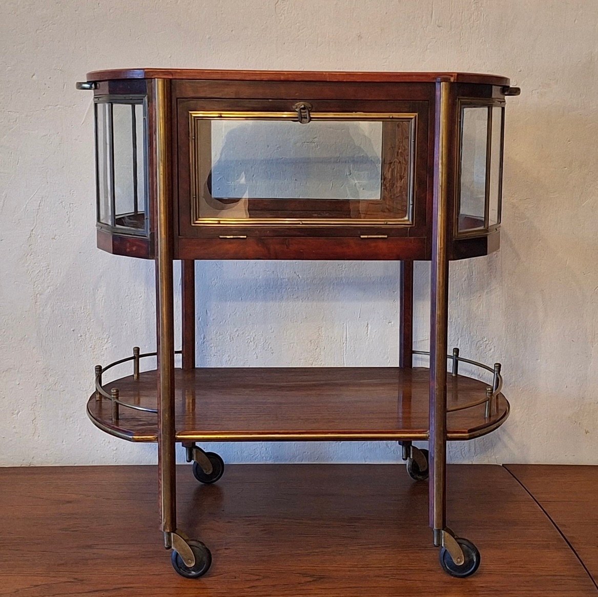 Serving Bar Cart in Mahogany, Brass and Glass, 1920