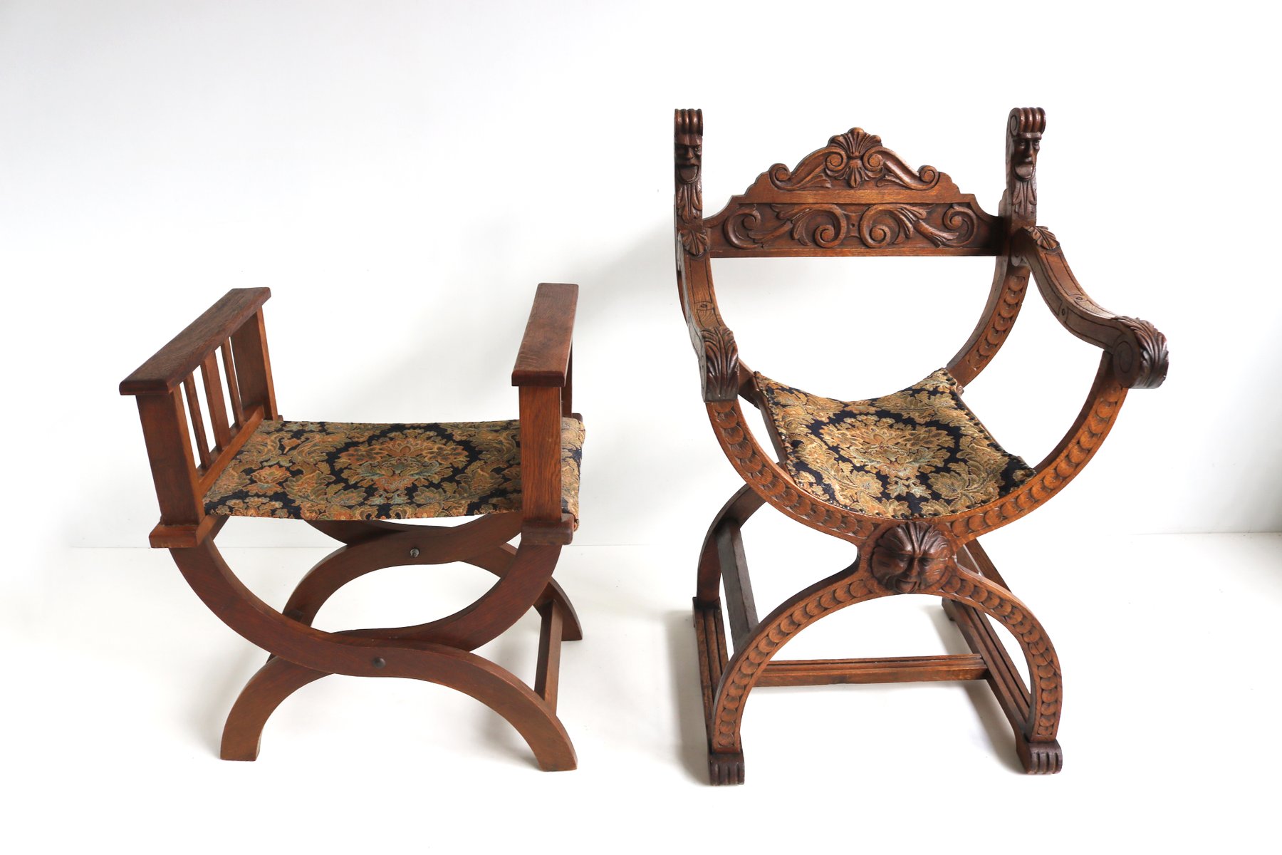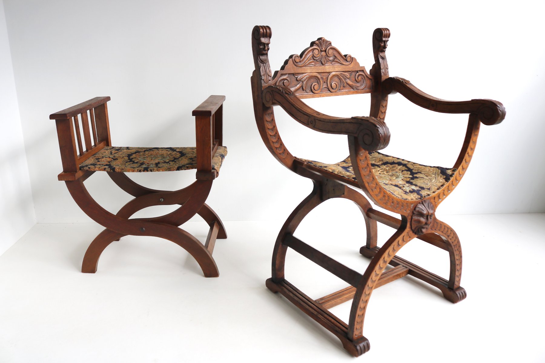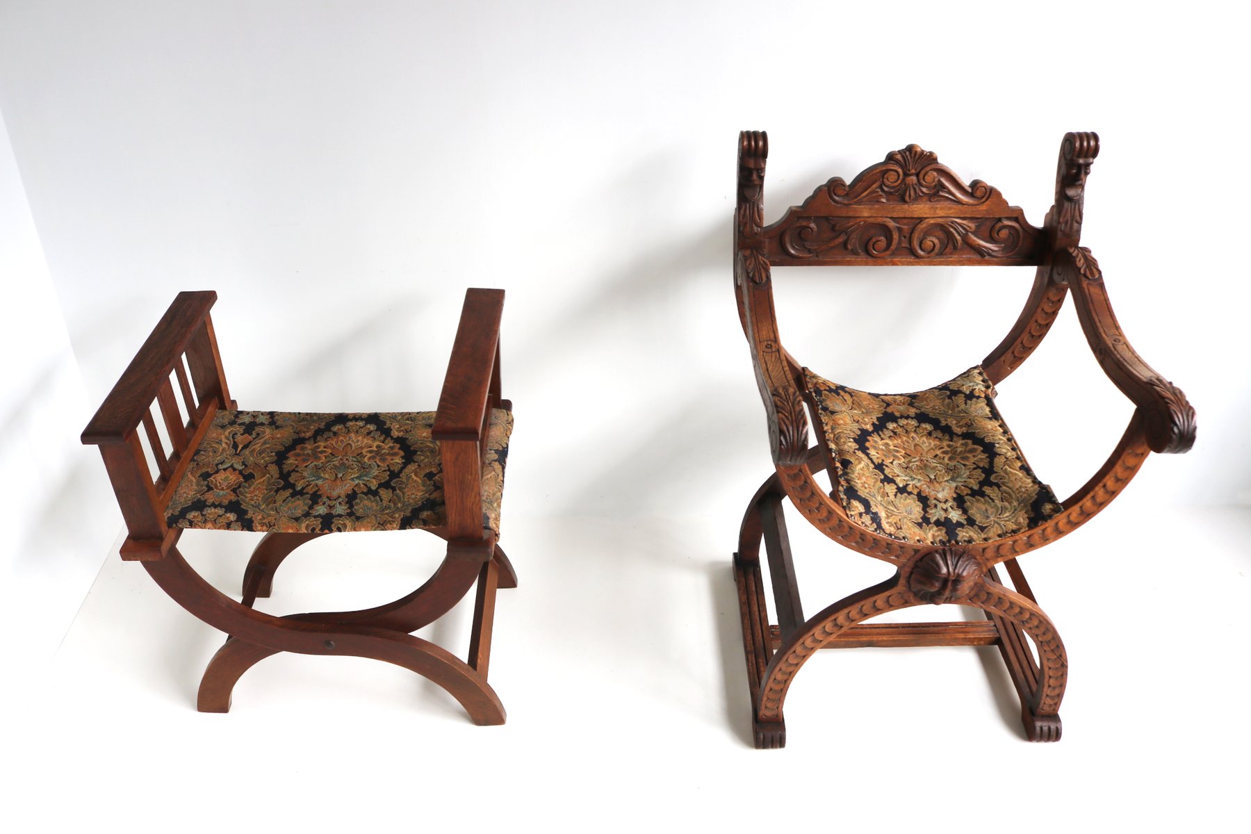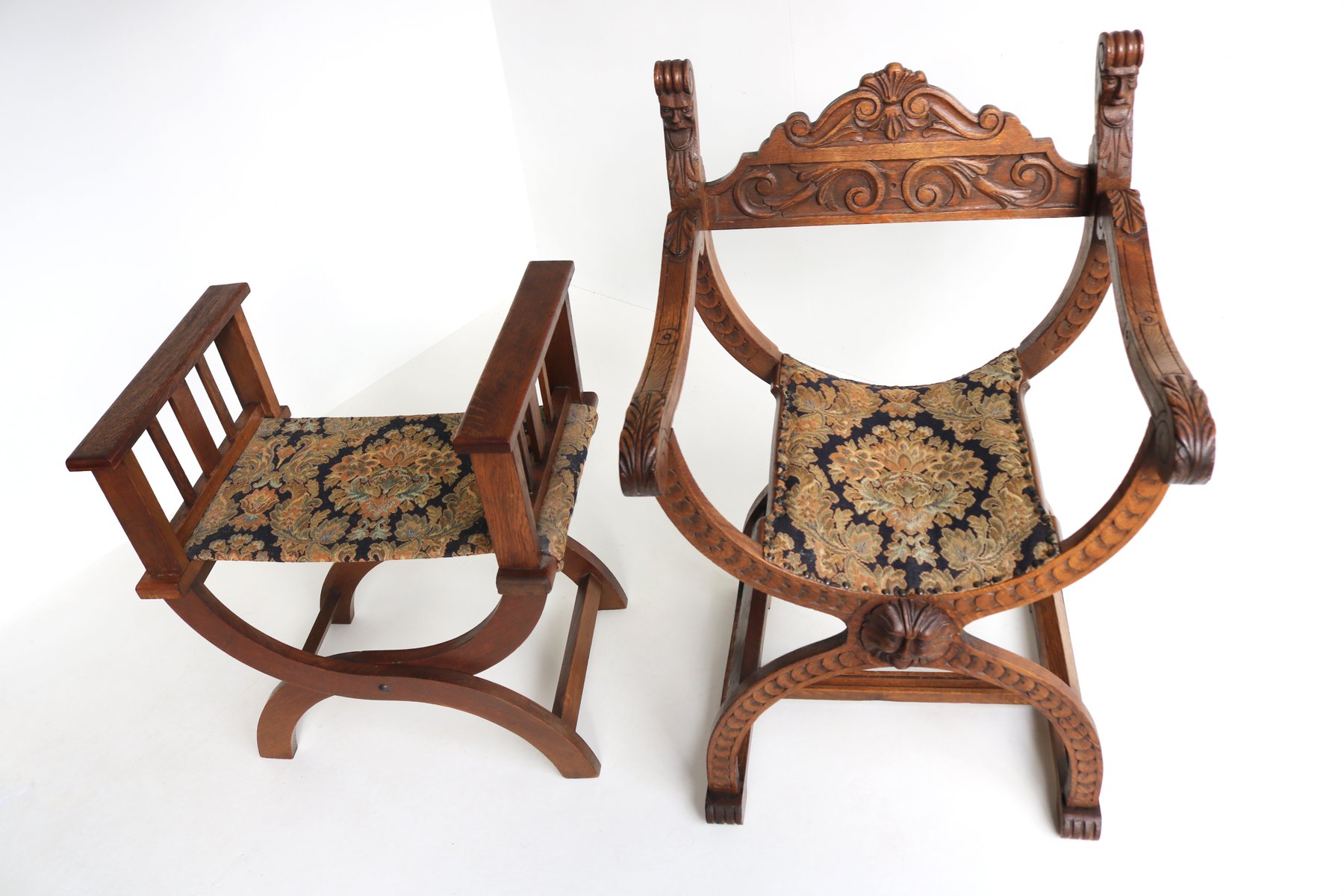 Set of Antique French Dagobert Curule Throne Armchair with Footstool in Caved Oak, 1900s