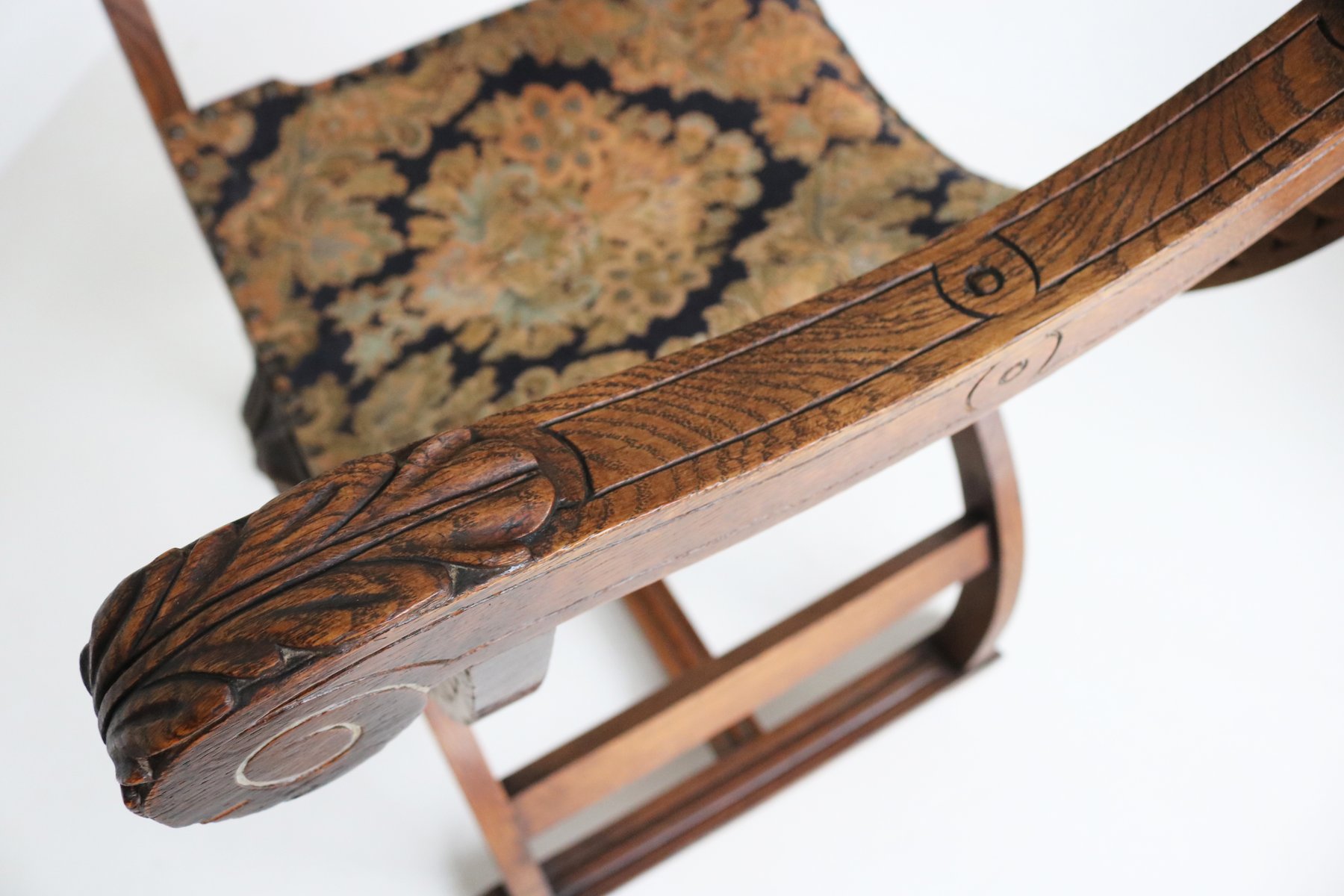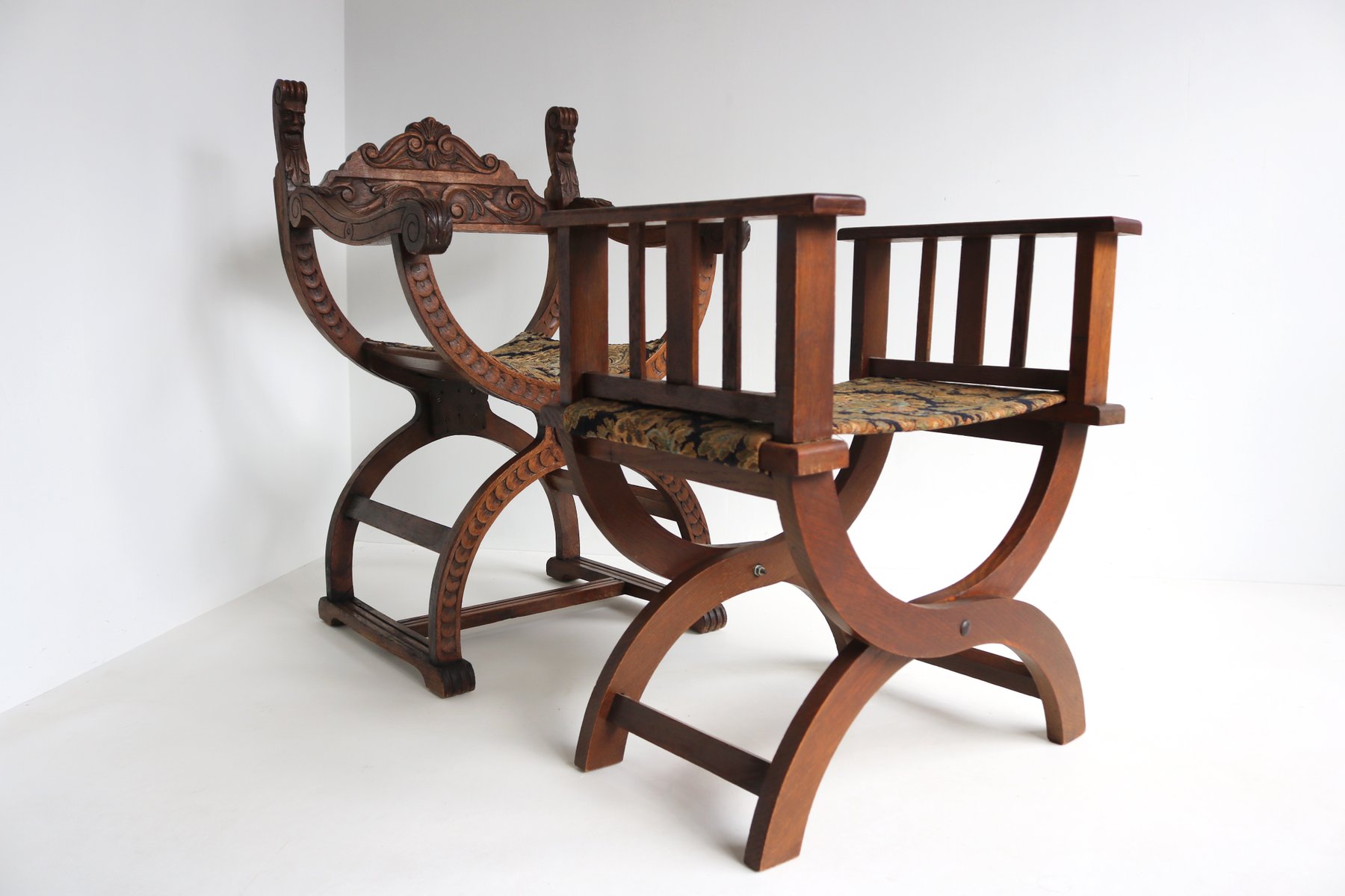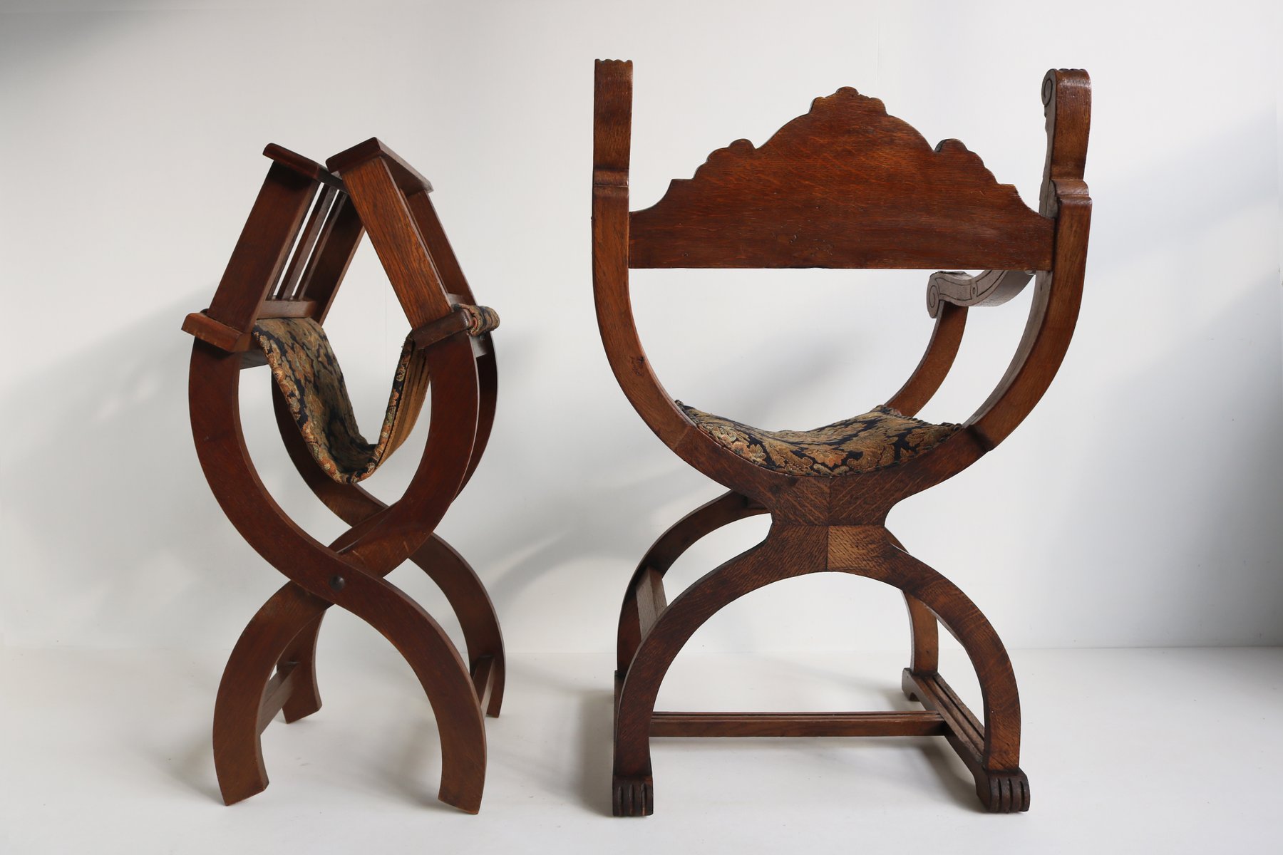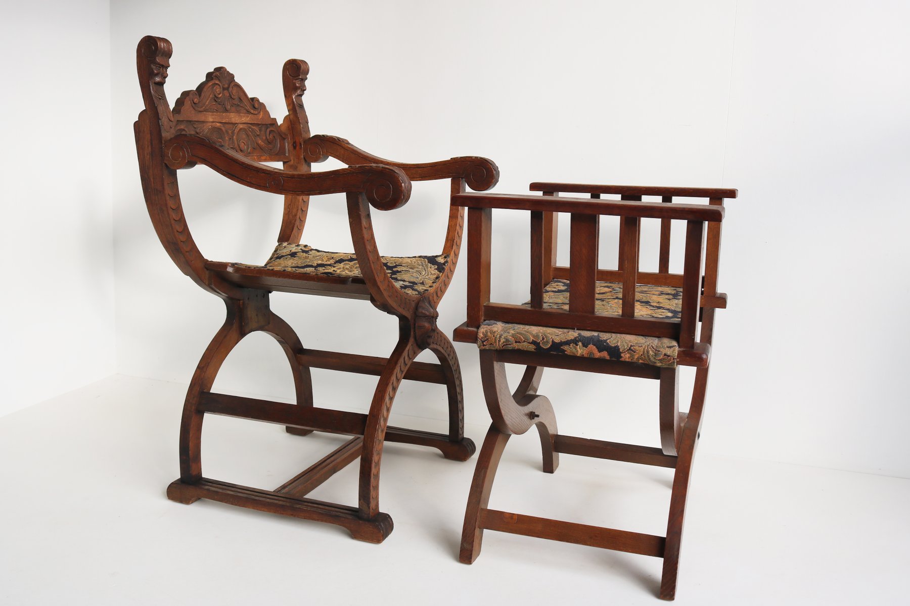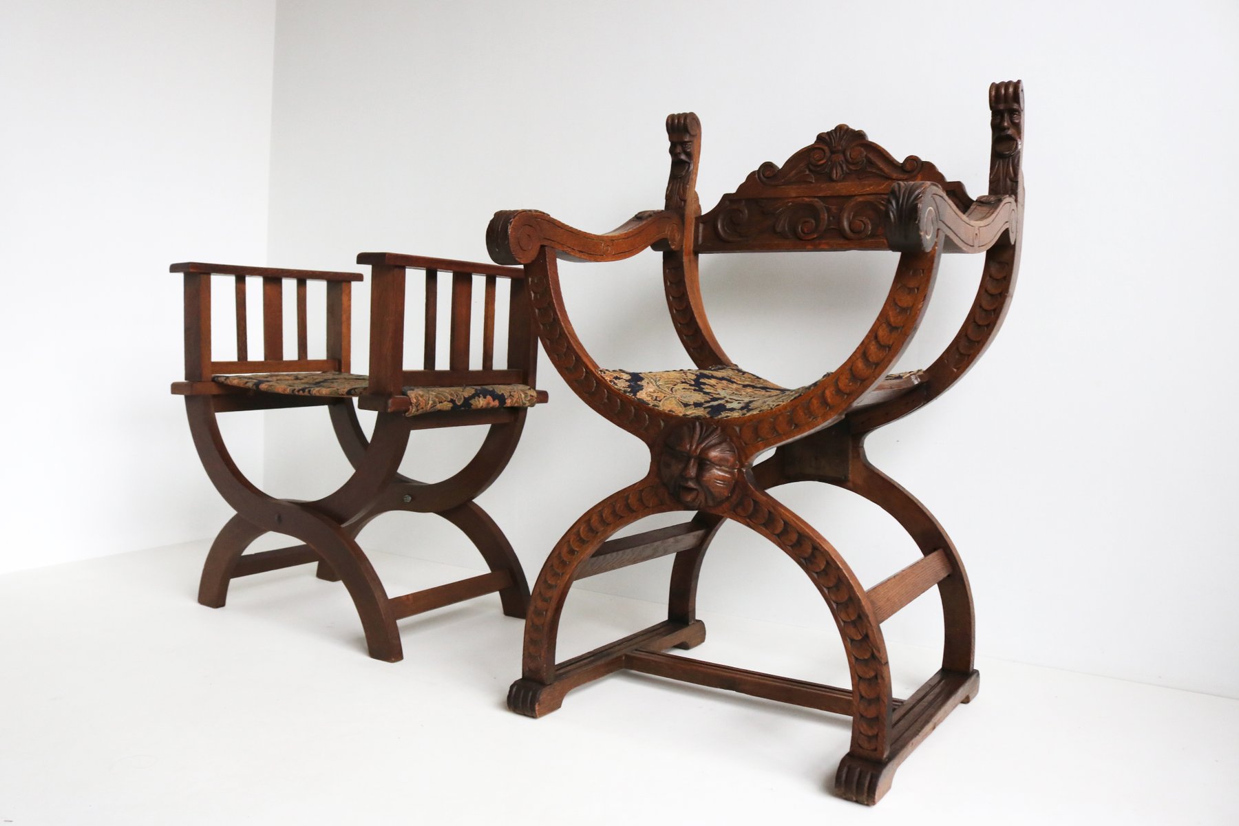 Set of Antique French Dagobert Curule Throne Armchair with Footstool in Caved Oak, 1900s