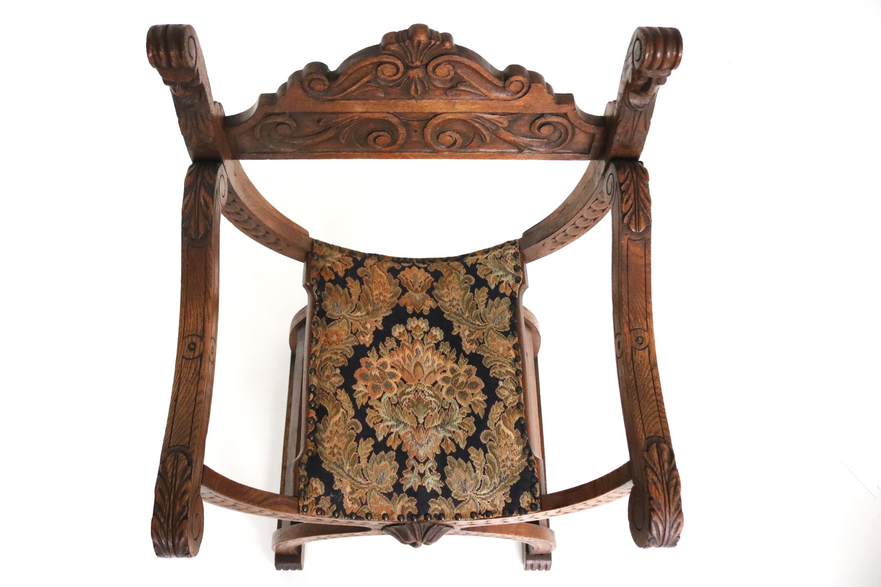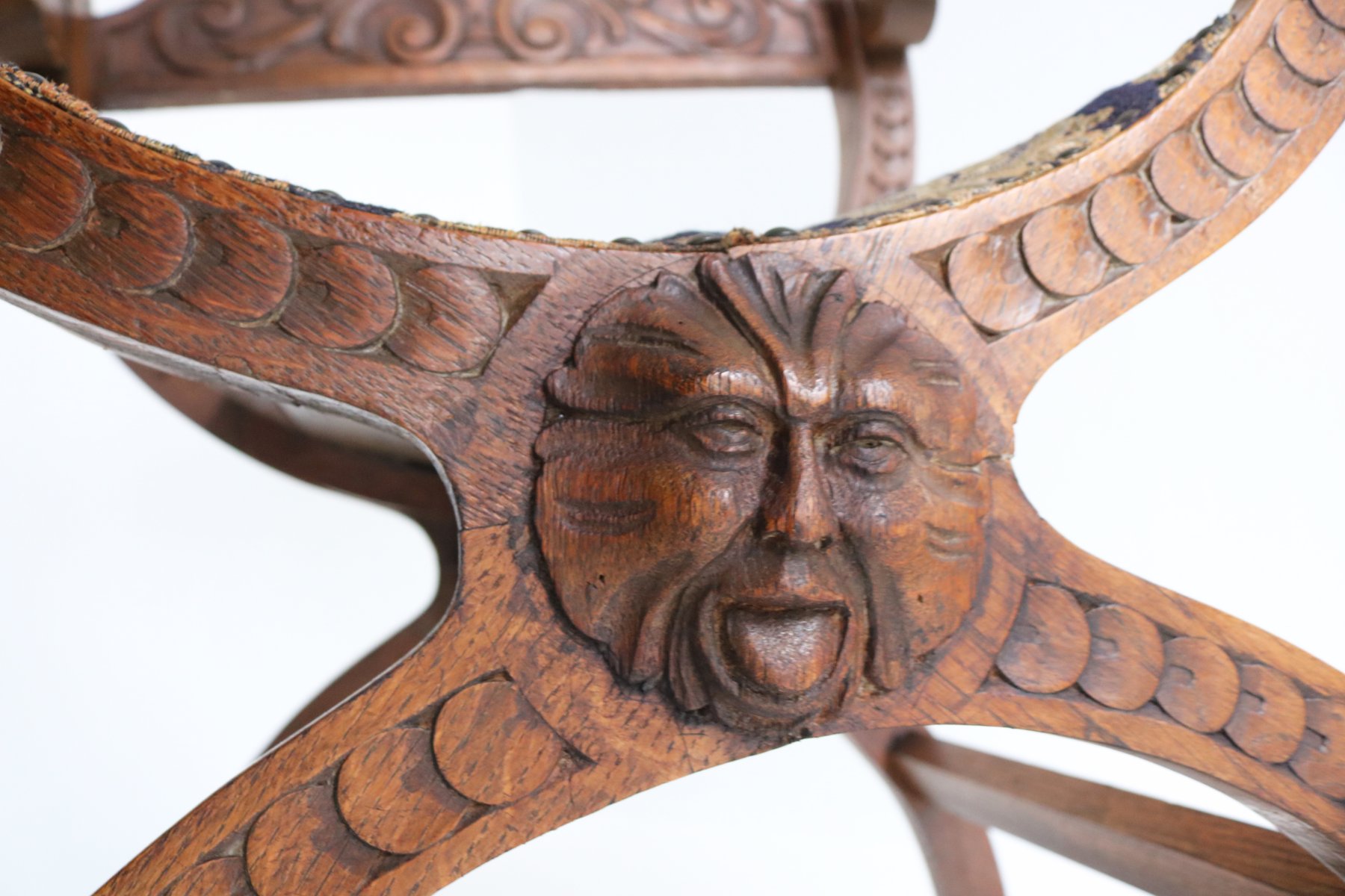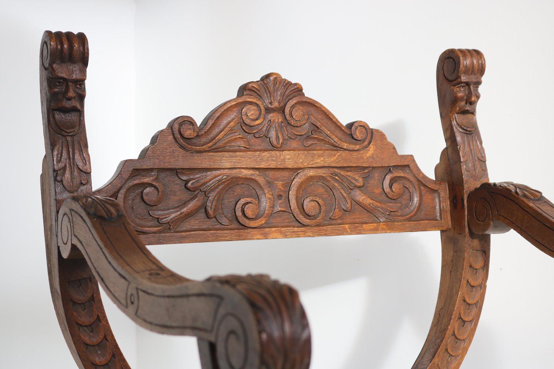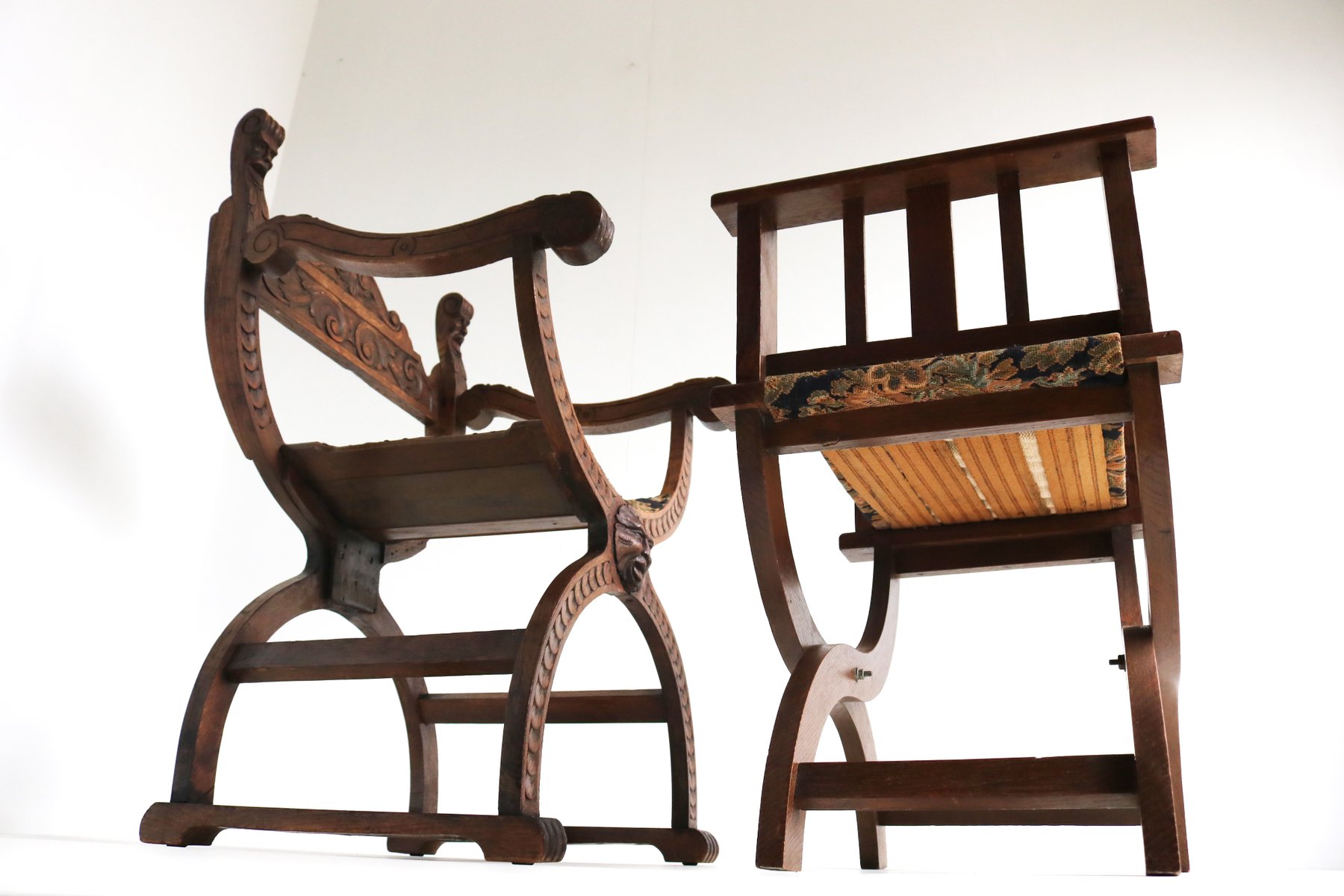 Set of Antique French Dagobert Curule Throne Armchair with Footstool in Caved Oak, 1900s