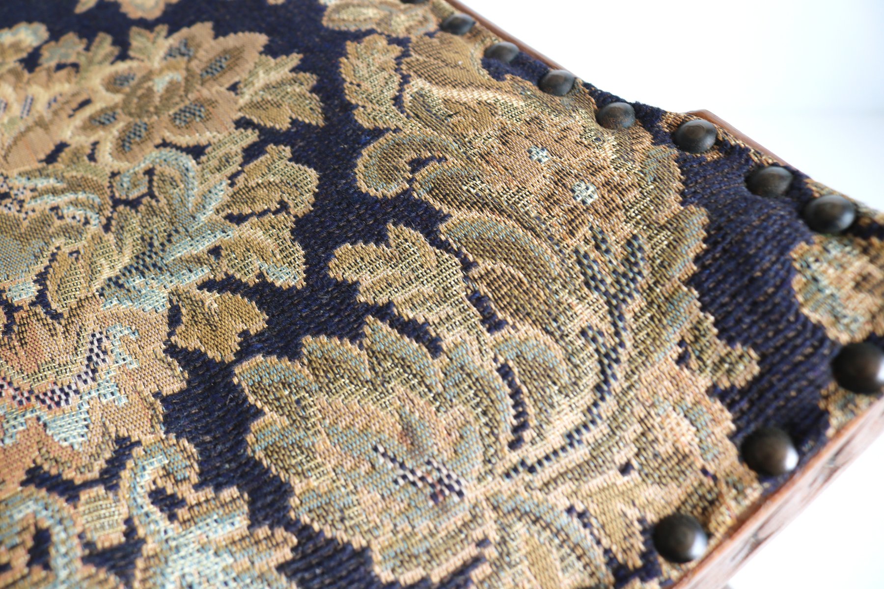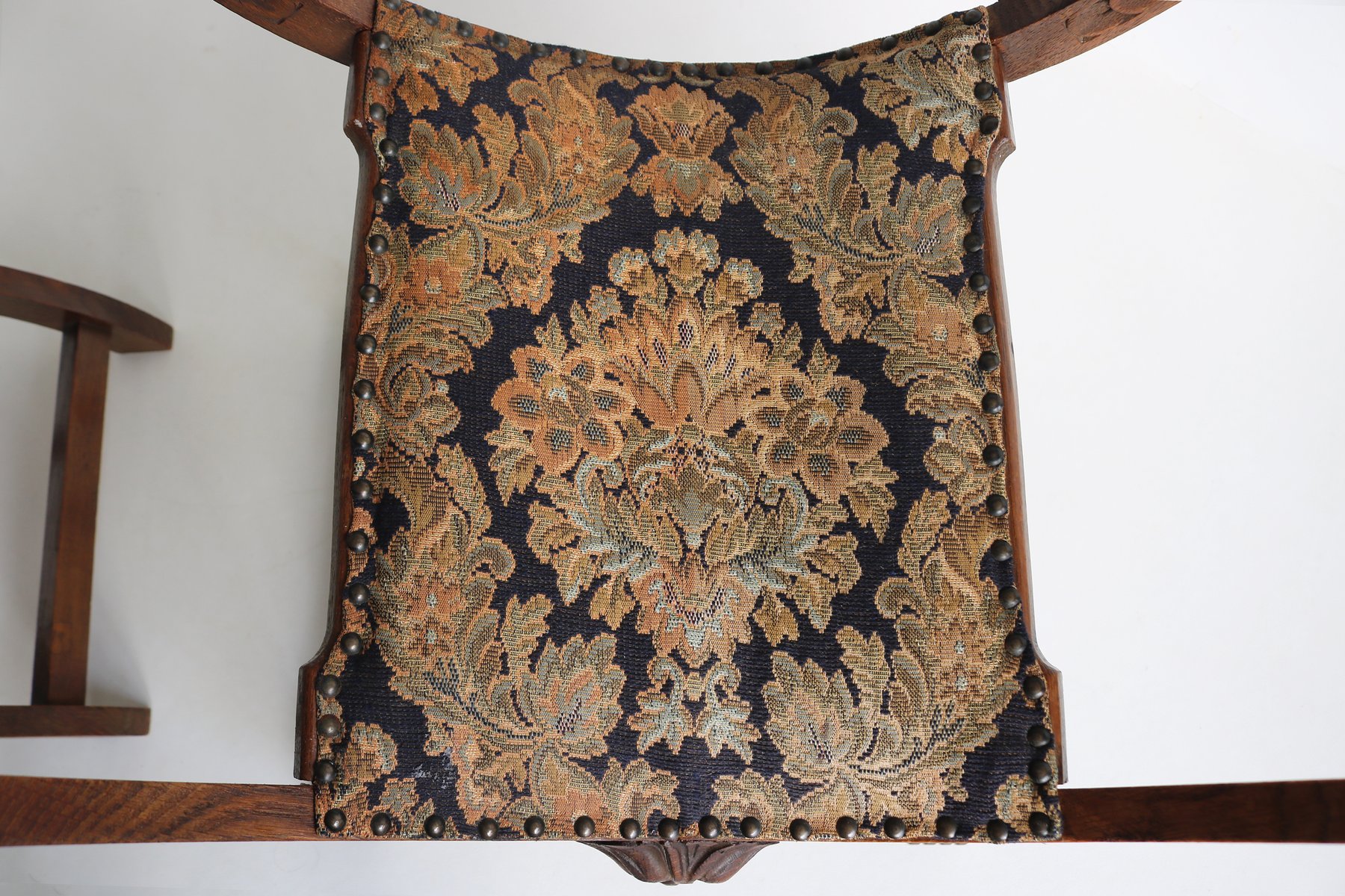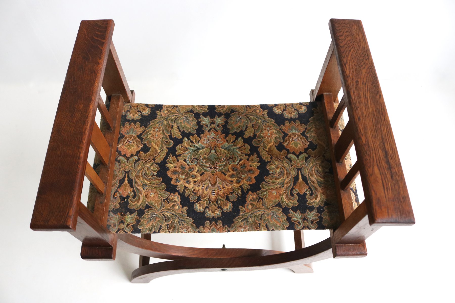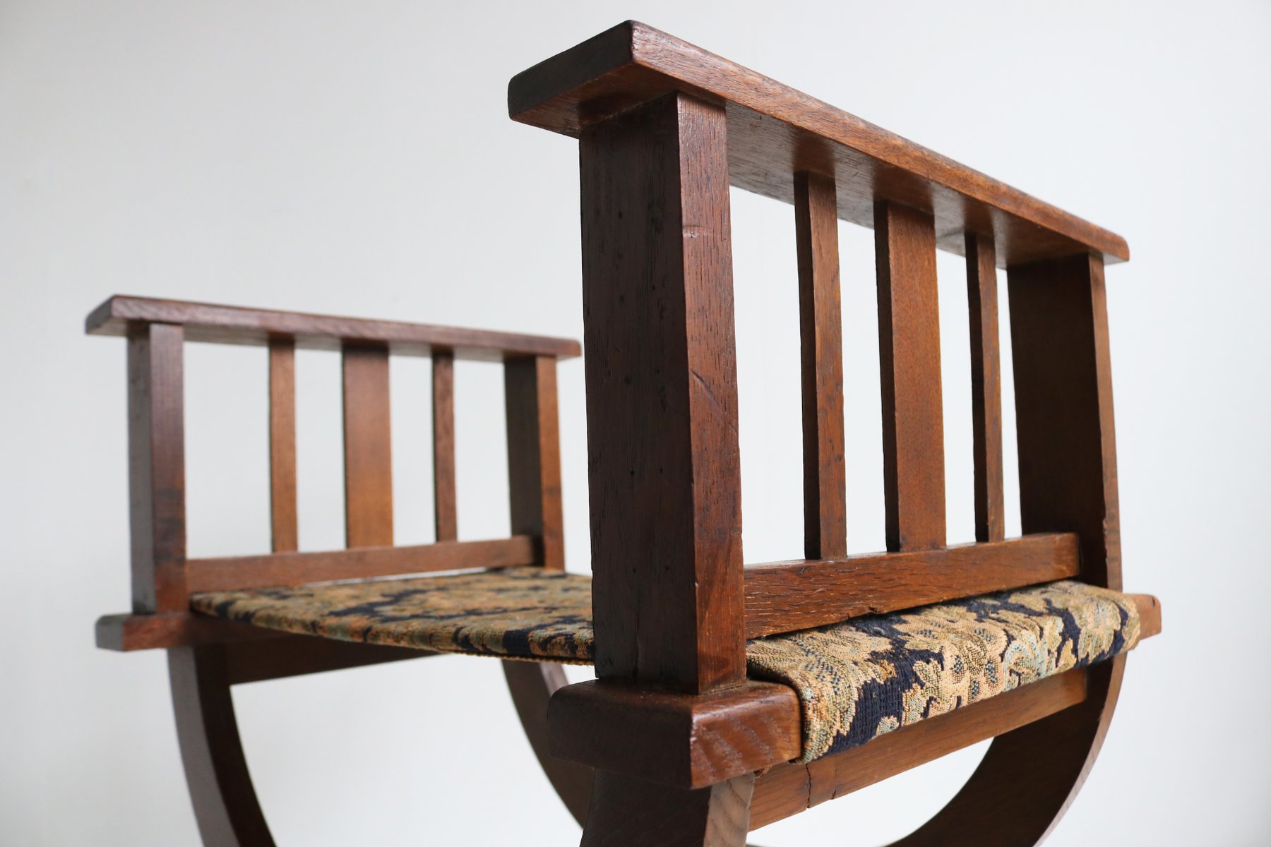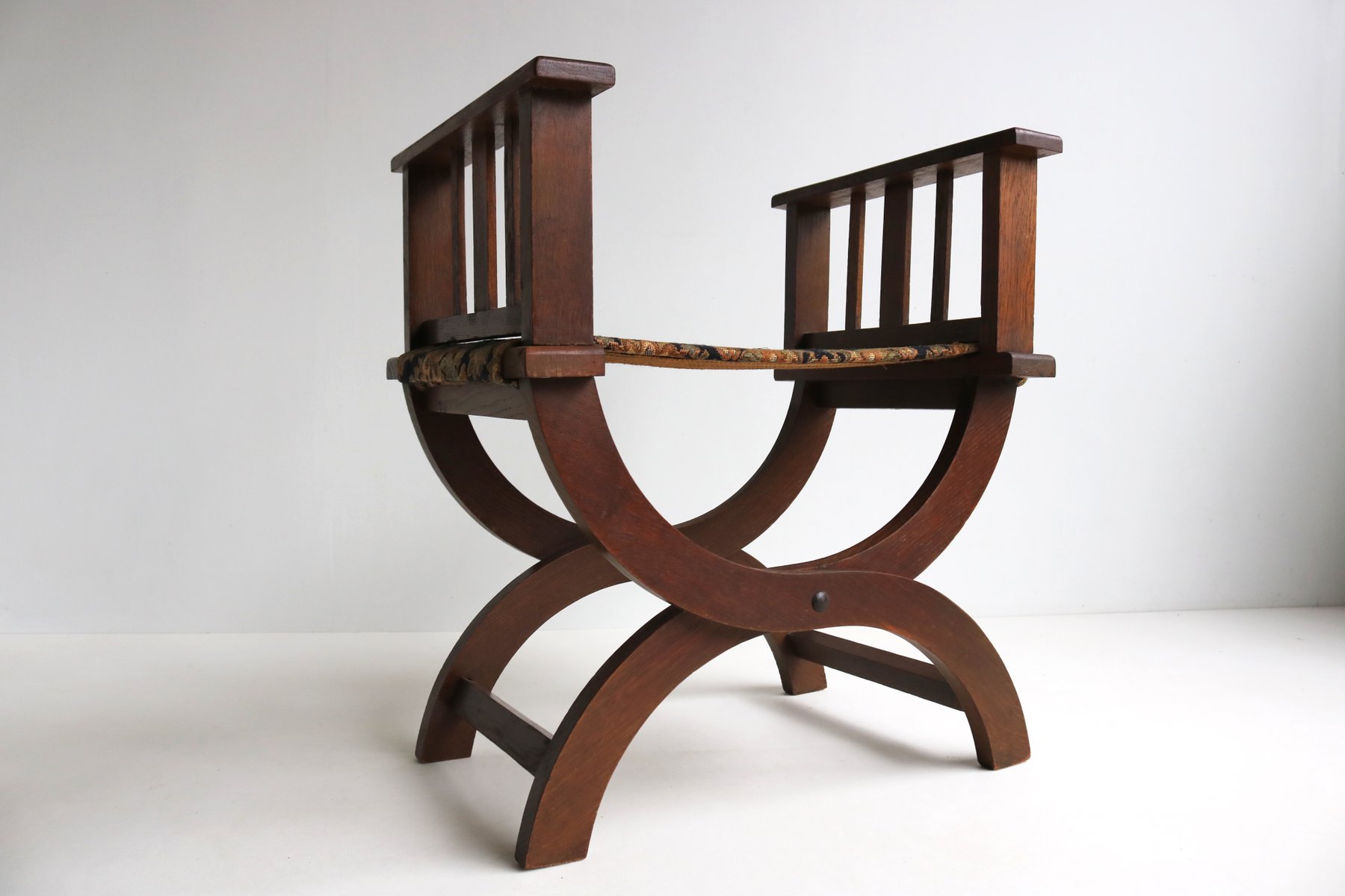 Set of Antique French Dagobert Curule Throne Armchair with Footstool in Caved Oak, 1900s
