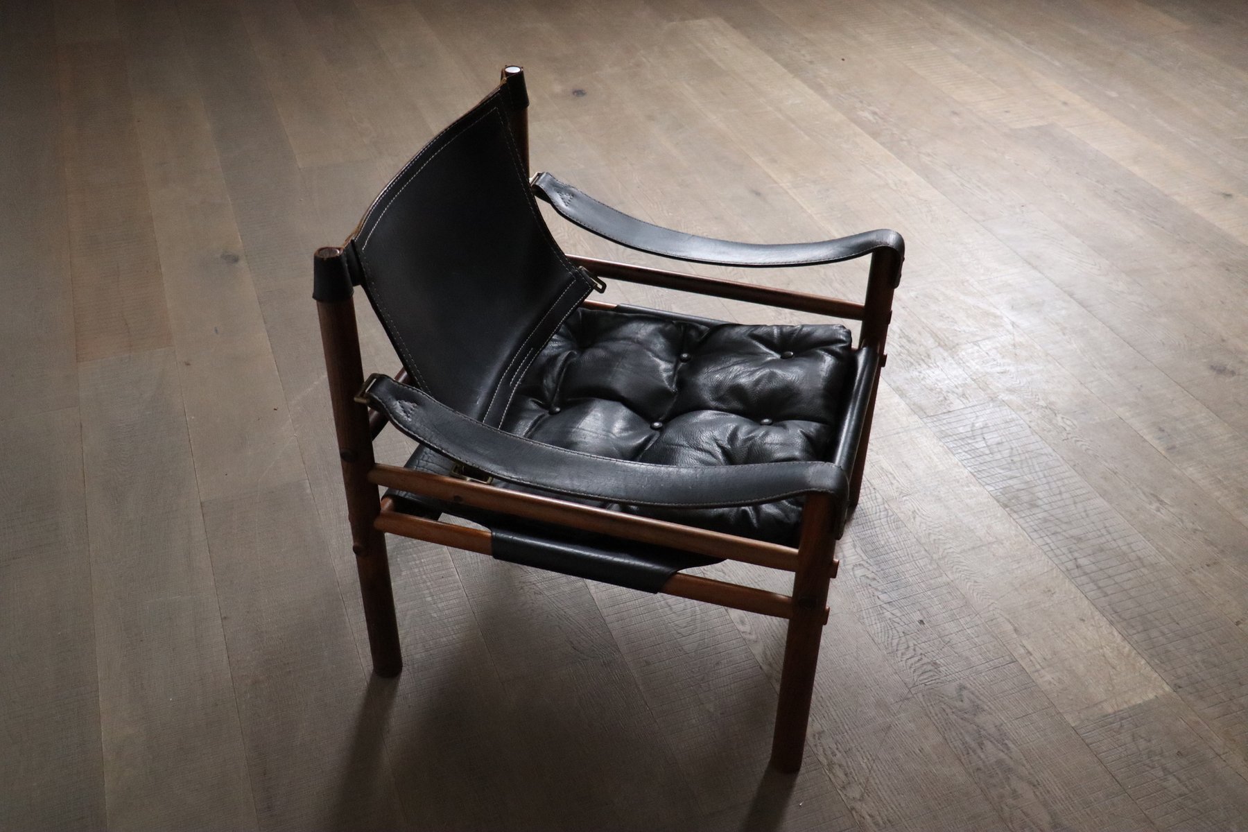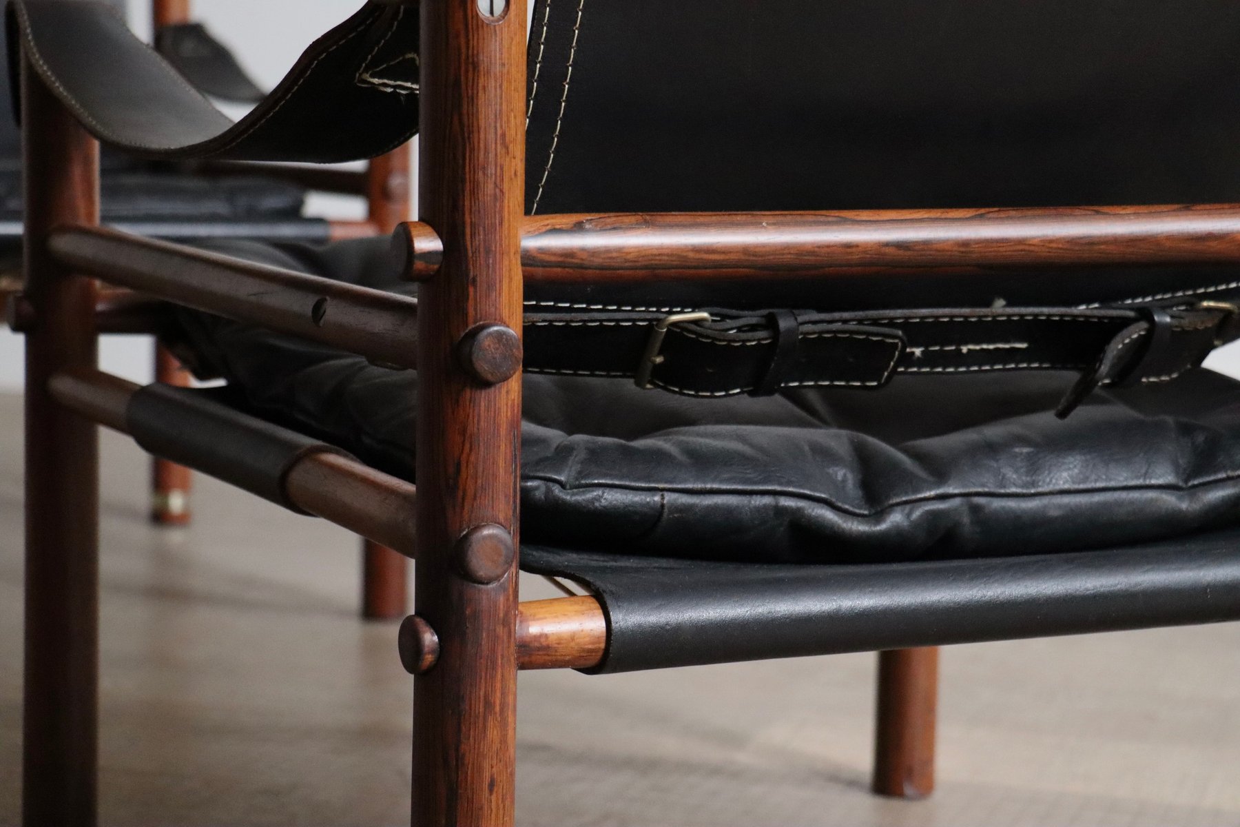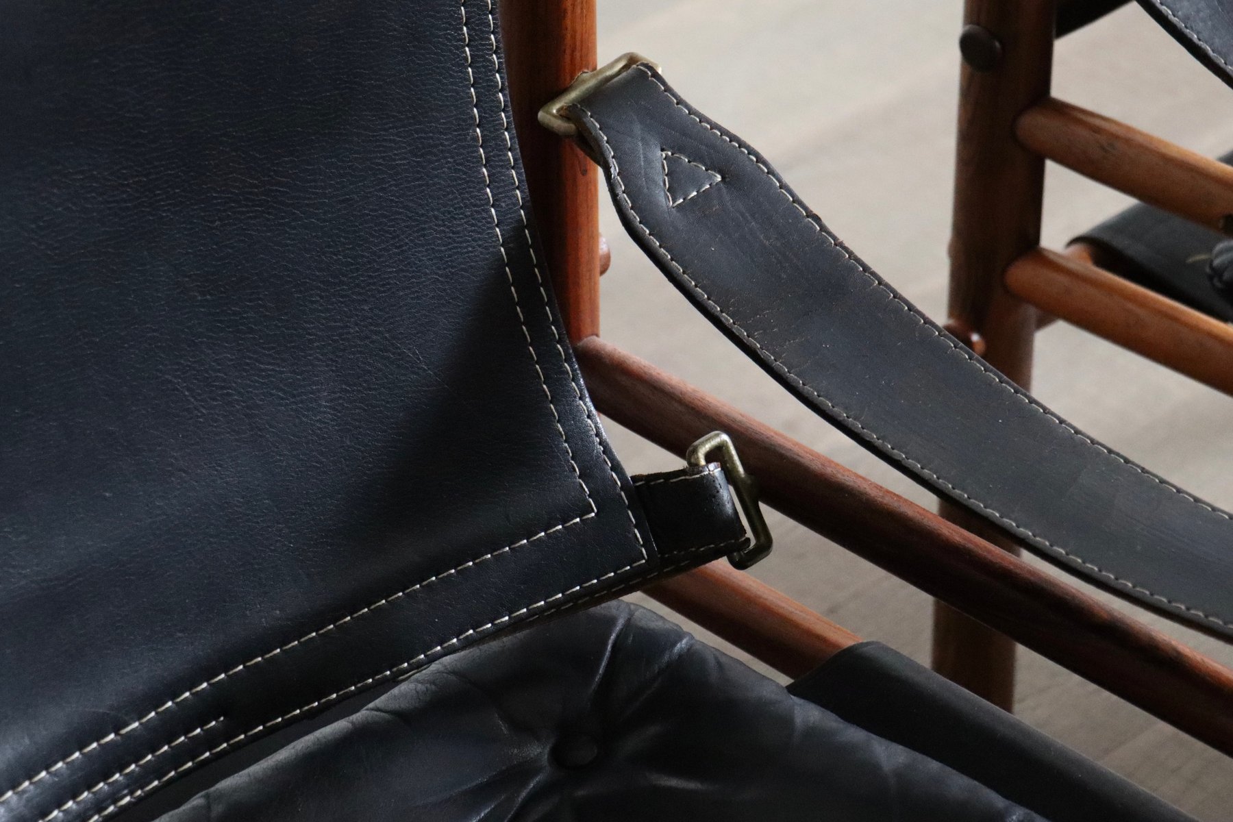 Norell is often praised for pioneering “conceptual” furniture, because he employed traditional materials—leather, turned wood, bentwood, and metal, for example—in unexpected forms, often with lyrical results. His designs have an affinity with those of Danish designer Kaare Klint (1888-1954), who, a generation before, brought time-honored, vernacular forms into modernist expression. In fact, Klint’s iconic Safari Chair (1933) inspired Norell to create the Sirocco Safari Chair (1964), which is lightweight, collapsible, and held together by leather support straps instead of glue or screws. Norell’s wood-framed Inka Armchair, Indra Sofa, and Ilona Sofa (design dates unverified) are likewise held together by leather.