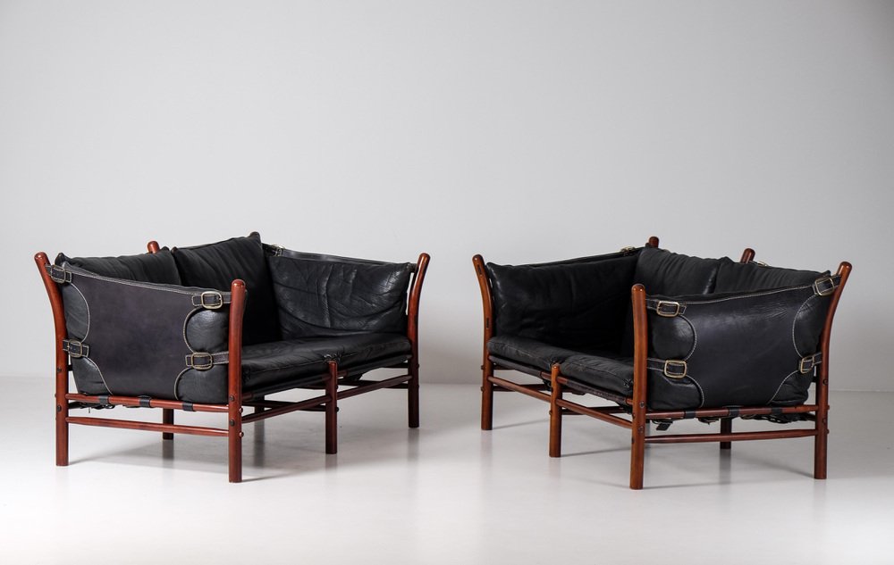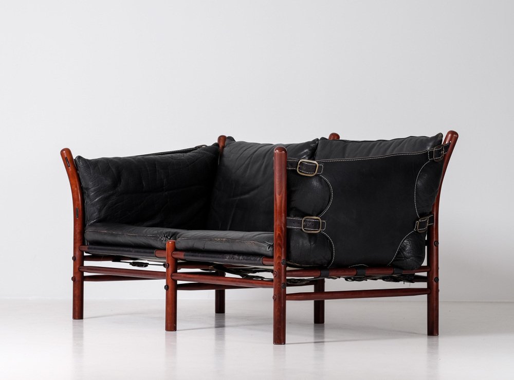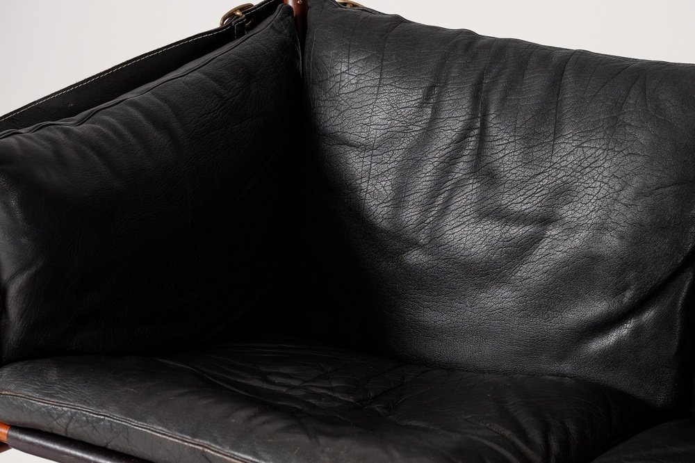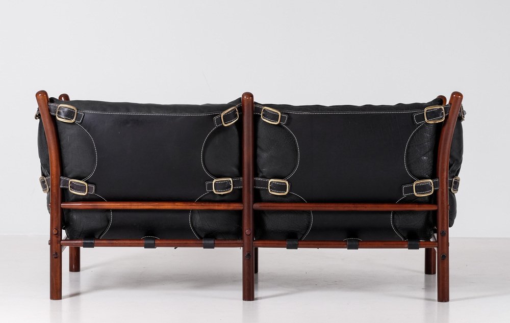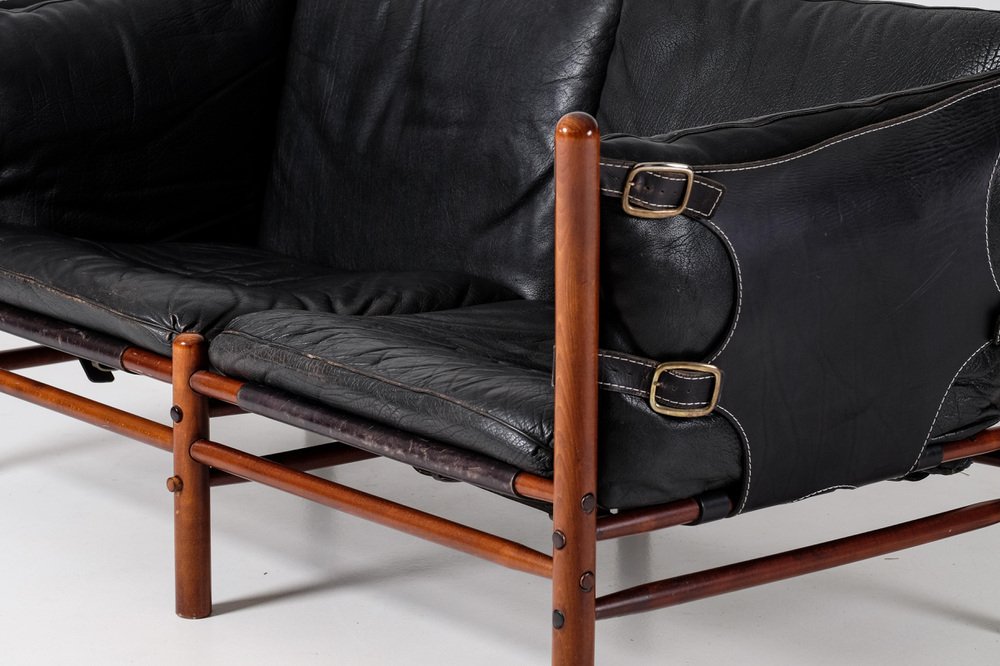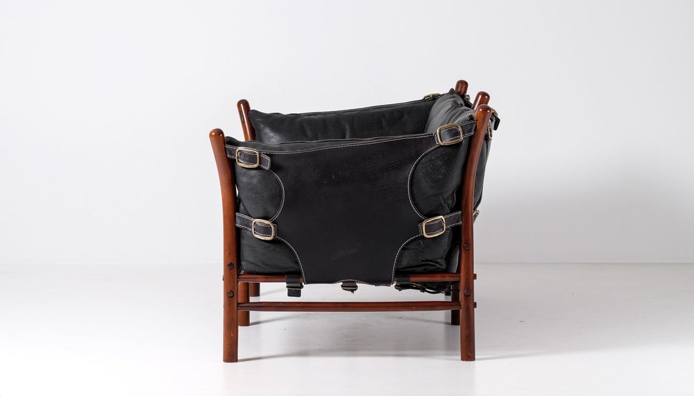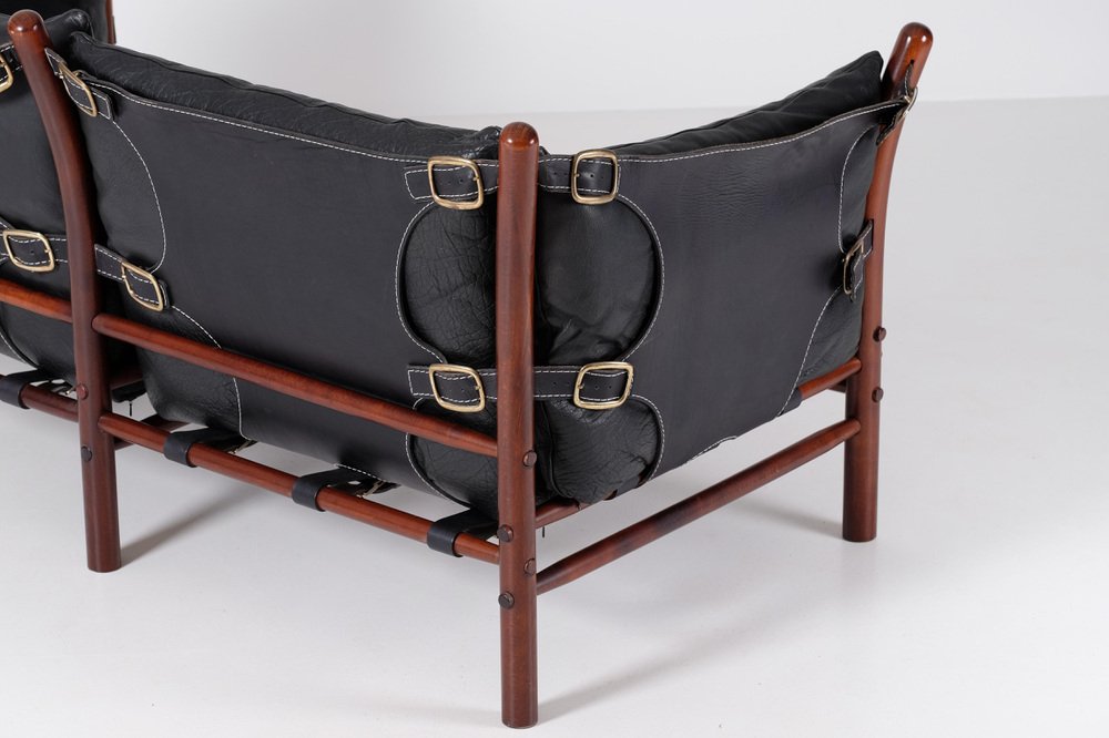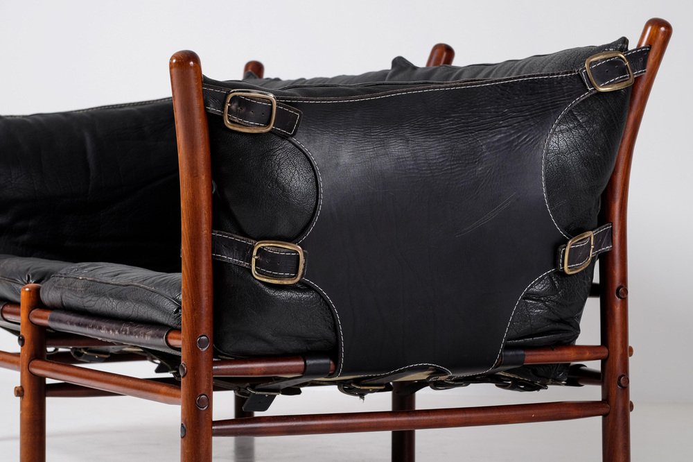Norell is often praised for pioneering “conceptual” furniture, because he employed traditional materials—leather, turned wood, bentwood, and metal, for example—in unexpected forms, often with lyrical results. His designs have an affinity with those of Danish designer Kaare Klint (1888-1954), who, a generation before, brought time-honored, vernacular forms into modernist expression. In fact, Klint’s iconic Safari Chair (1933) inspired Norell to create the Sirocco Safari Chair (1964), which is lightweight, collapsible, and held together by leather support straps instead of glue or screws. Norell’s wood-framed Inka Armchair, Indra Sofa, and Ilona Sofa (design dates unverified) are likewise held together by leather.