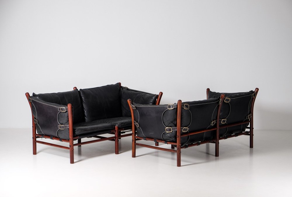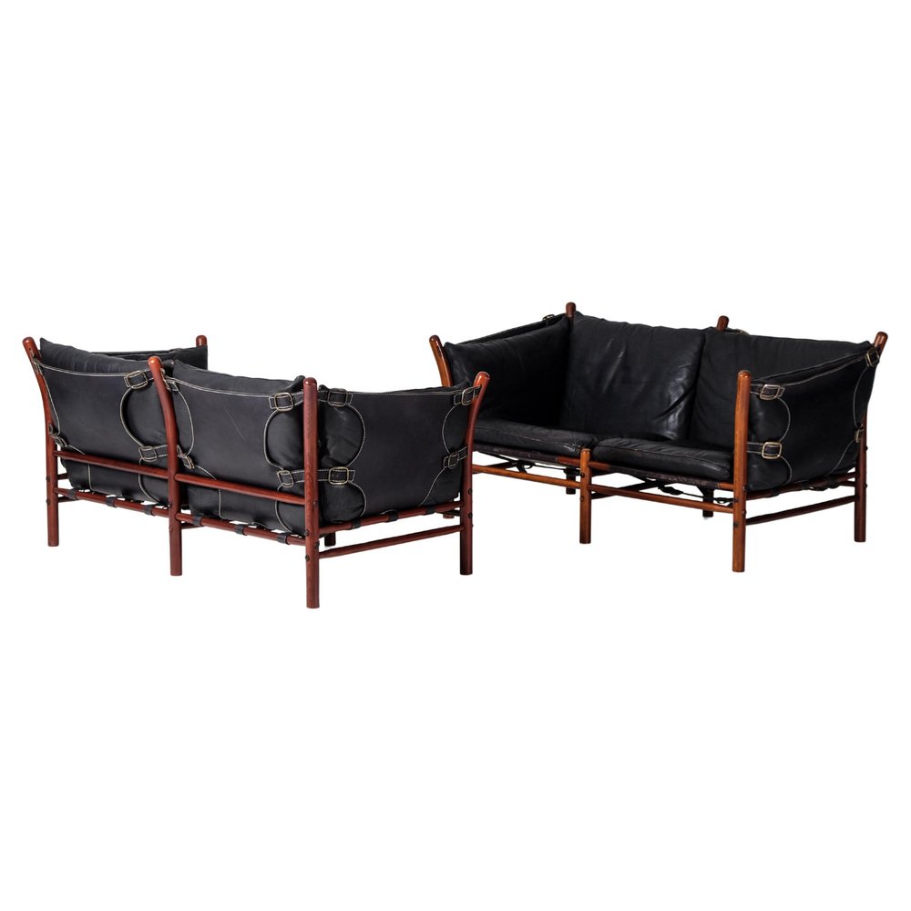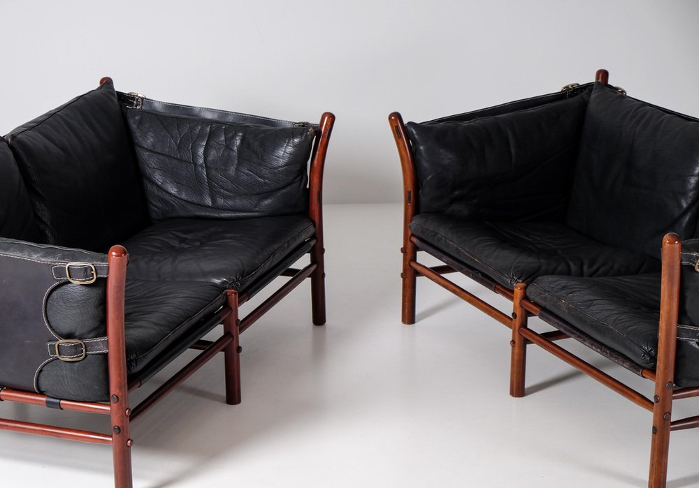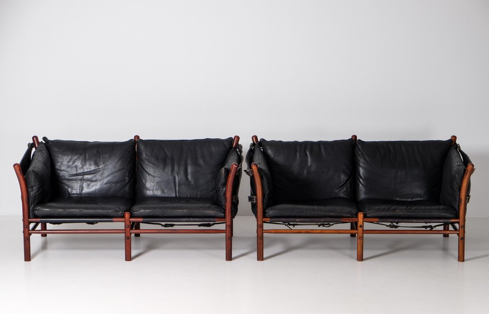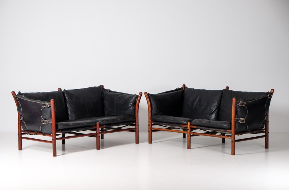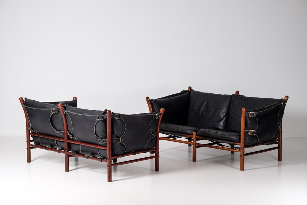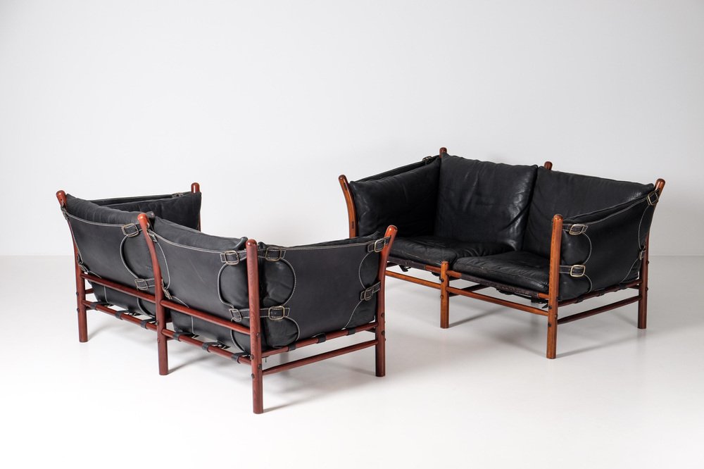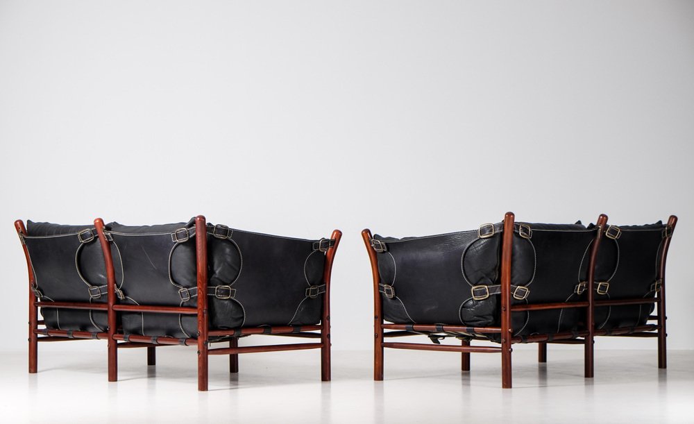 Norell is often praised for pioneering “conceptual” furniture, because he employed traditional materials—leather, turned wood, bentwood, and metal, for example—in unexpected forms, often with lyrical results. His designs have an affinity with those of Danish designer Kaare Klint (1888-1954), who, a generation before, brought time-honored, vernacular forms into modernist expression. In fact, Klint’s iconic Safari Chair (1933) inspired Norell to create the Sirocco Safari Chair (1964), which is lightweight, collapsible, and held together by leather support straps instead of glue or screws. Norell’s wood-framed Inka Armchair, Indra Sofa, and Ilona Sofa (design dates unverified) are likewise held together by leather.