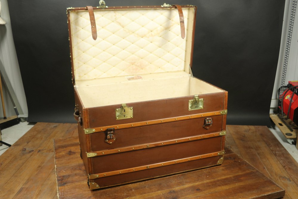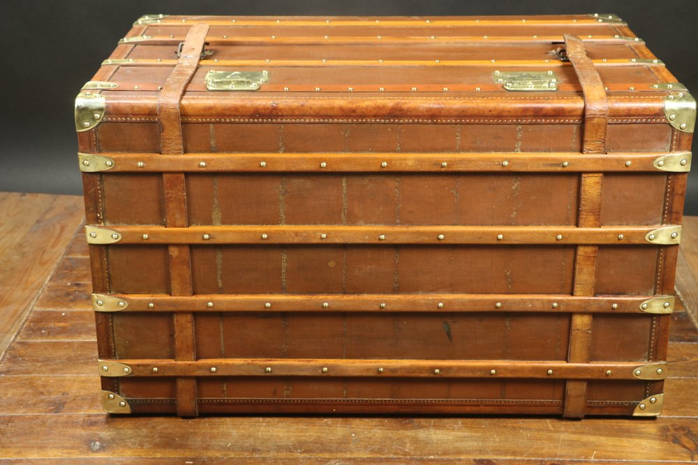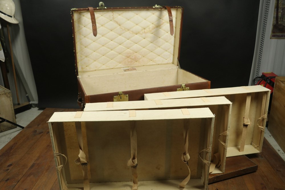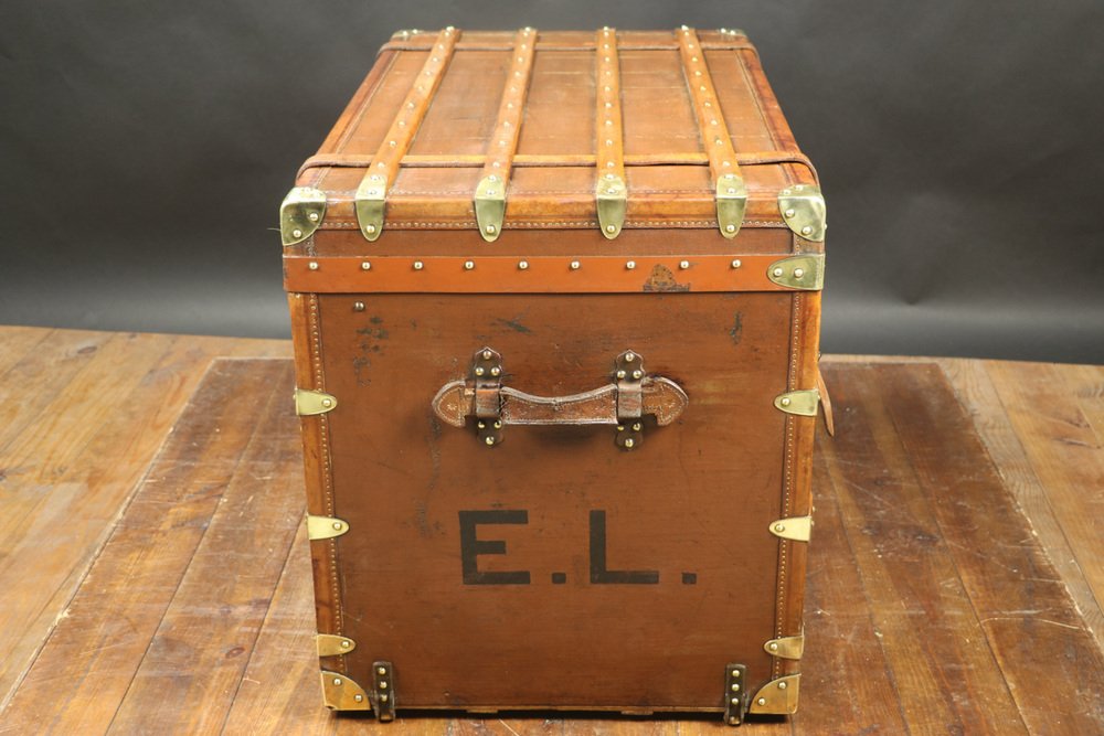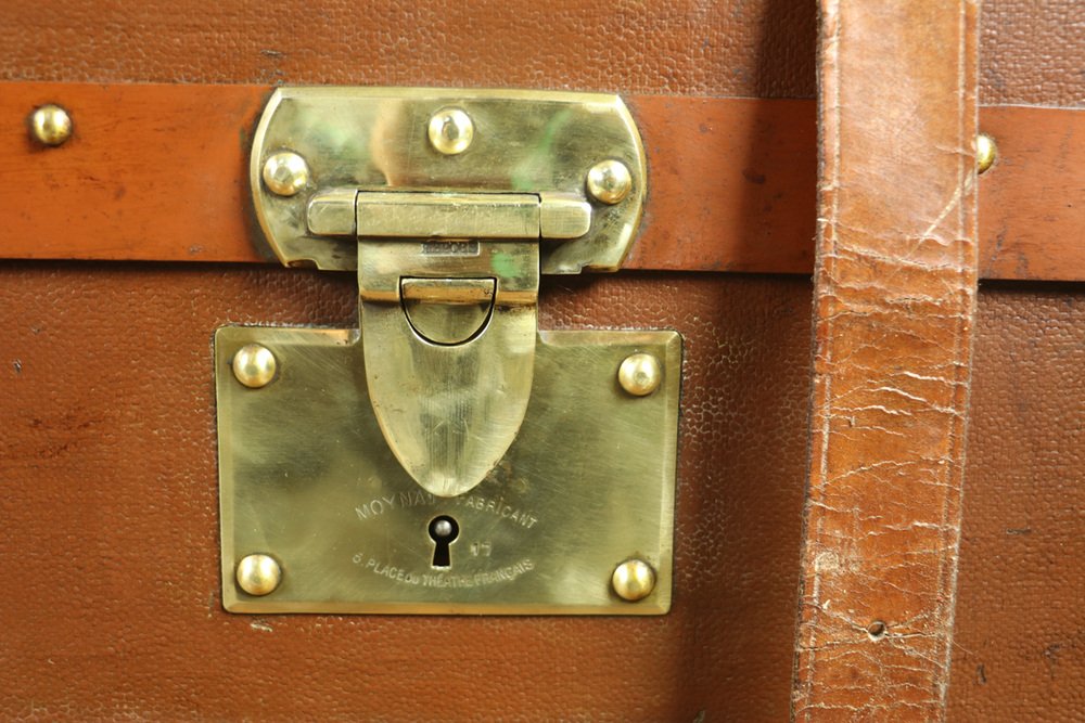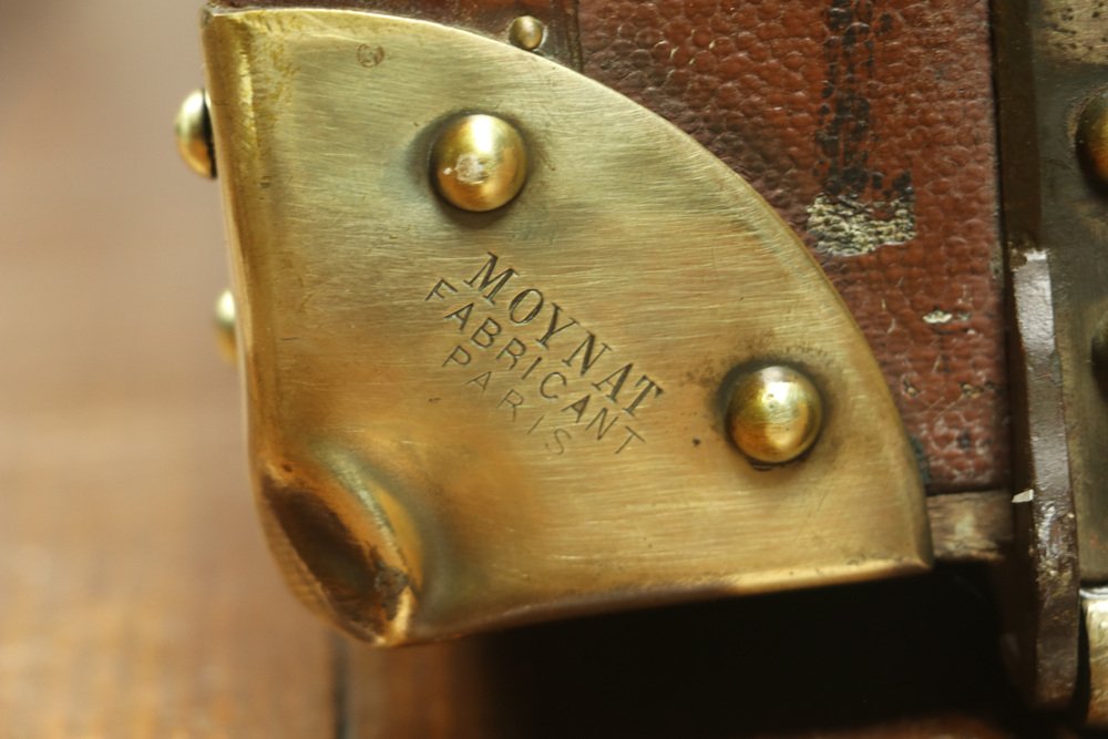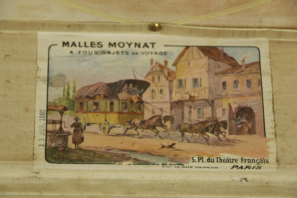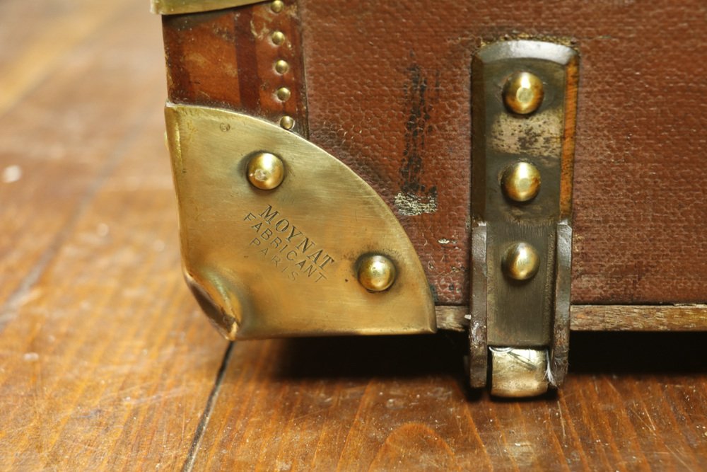 Moynat’s workshop was one of the first of its kind for leather work and developed many technical innovations; for instance, a patent for gutta-percha waterproofing in 1854, which used the sap of the gutta-percha tree. The company became widely lauded for its sturdy and waterproof trunks lined with silk or velvet intended for use in all modes of transport (steamship, railway, and eventually automobile travel).