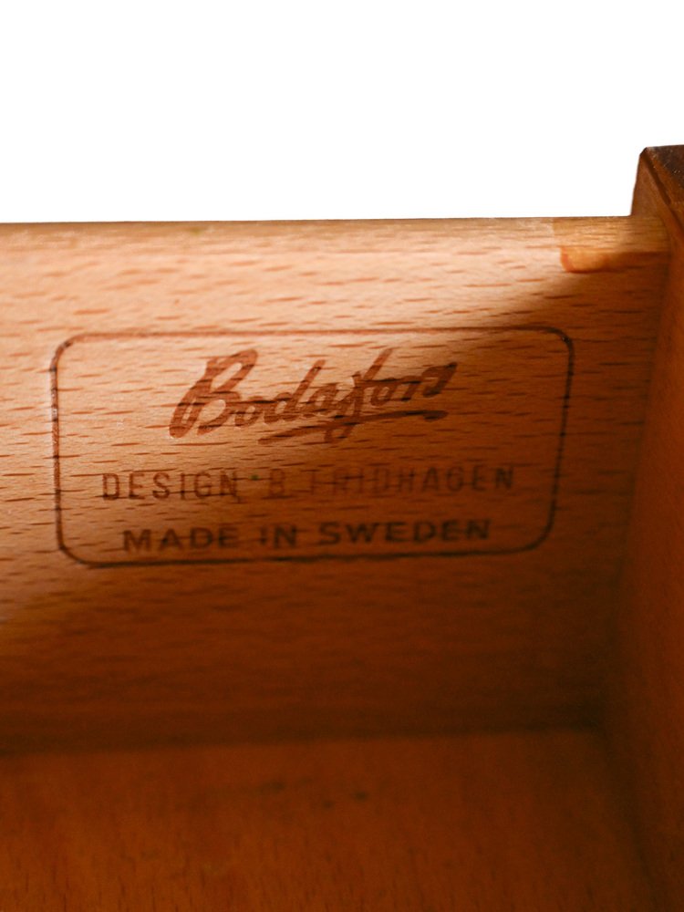 From the 1930s onward—rather in contrast to comparable Swedish furniture manufacturer Nordiska Kompaniet—Bodafors began modifying its design focus toward the expanding Swedish middle class. The 1950s and ’60s proved to be a particularly prolific era for this kind of production: Practical, well-made, competitively priced seating, tables, and casegoods—many of which were crafted in woods of teak, mahogany, and oak—became hallmarks of the Bodafors catalogue at this time.